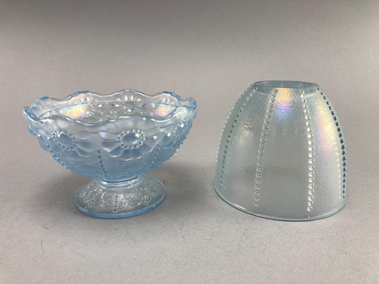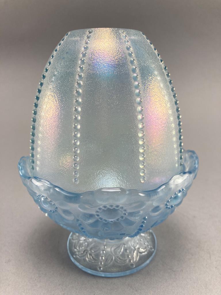 Two-piece Fenton fairy lamp in translucent blue iridescent glass. Features a textured beaded design on the shade and floral detailing on the base. Known for its decorative and collectible appeal.
