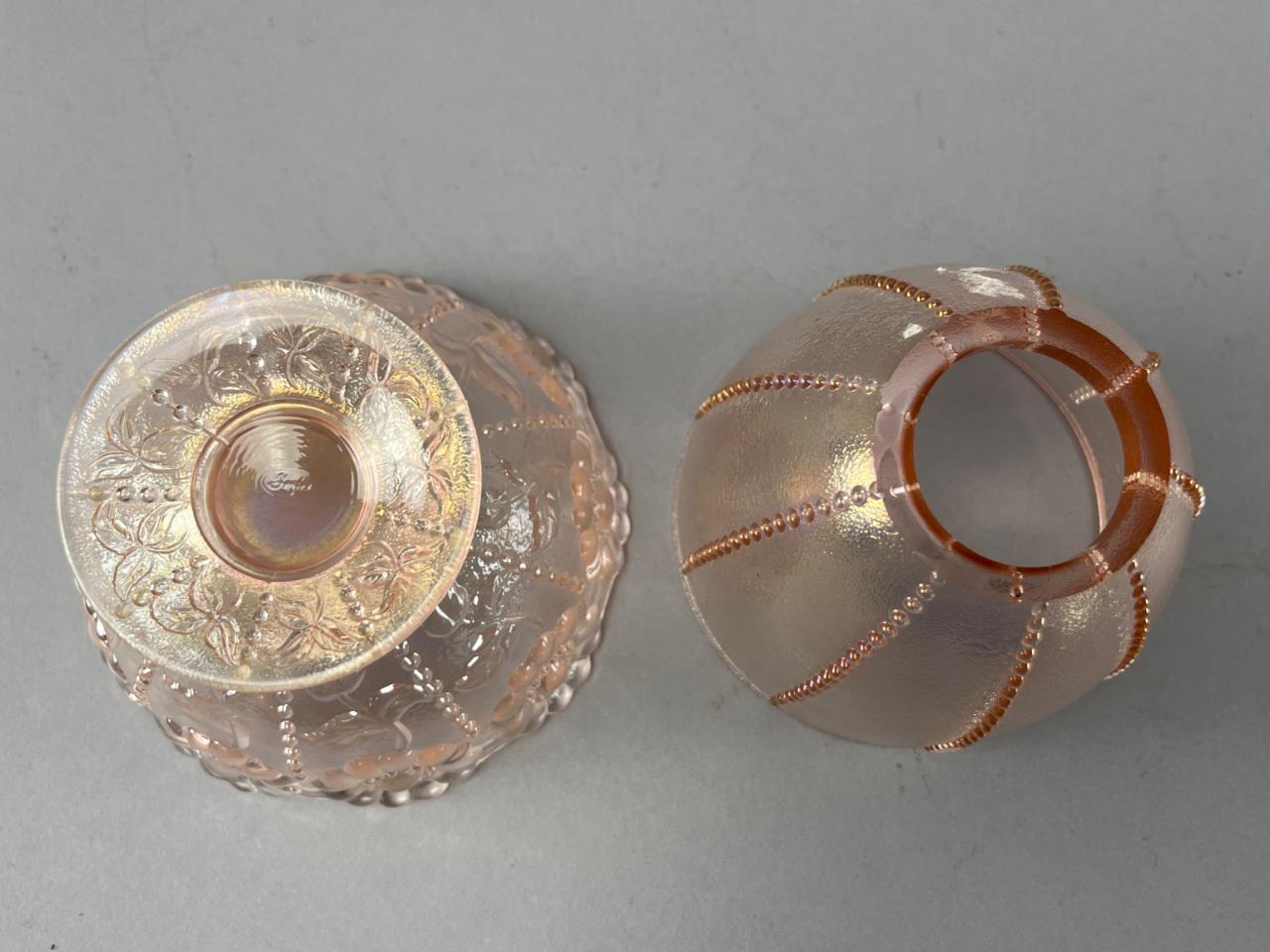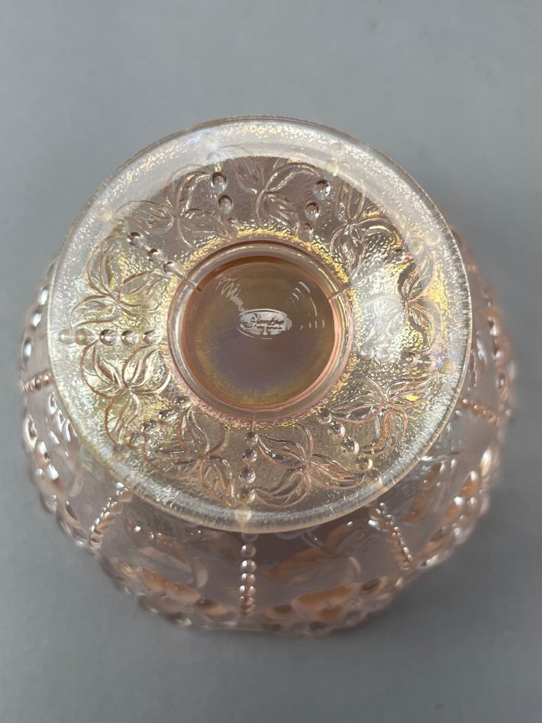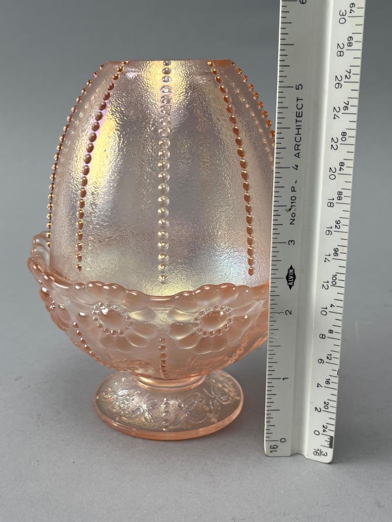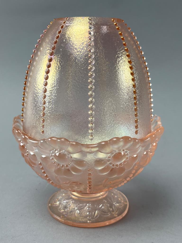 Fenton iridescent pink glass fairy lamp consisting of two pieces: a floral-embossed base and a beaded pattern top shade. Features a satin finish with opalescent highlights. Marks indicating Fenton on the bottom.