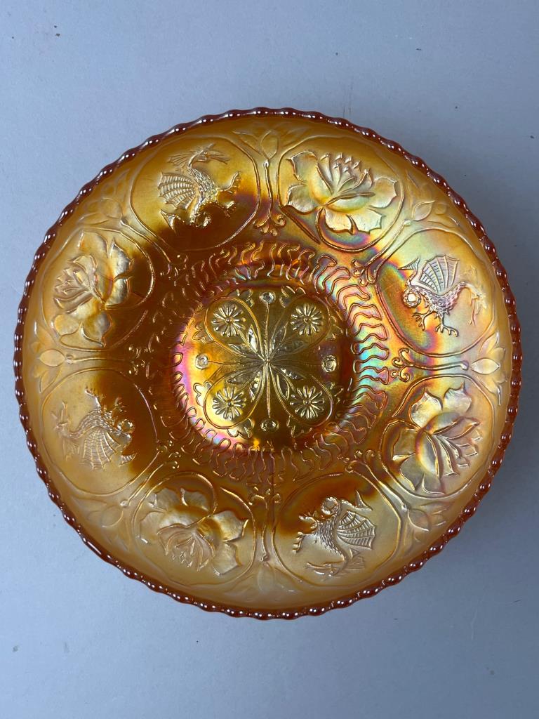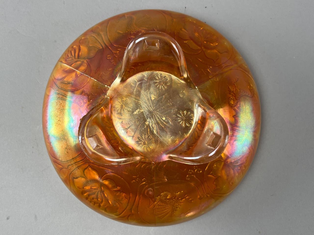 Marigold carnival glass bowl featuring embossed floral and dragon motifs on the exterior and interior. Scalloped rim with iridescent finish. Three molded feet on the base. Normal wear consistent with age observed.