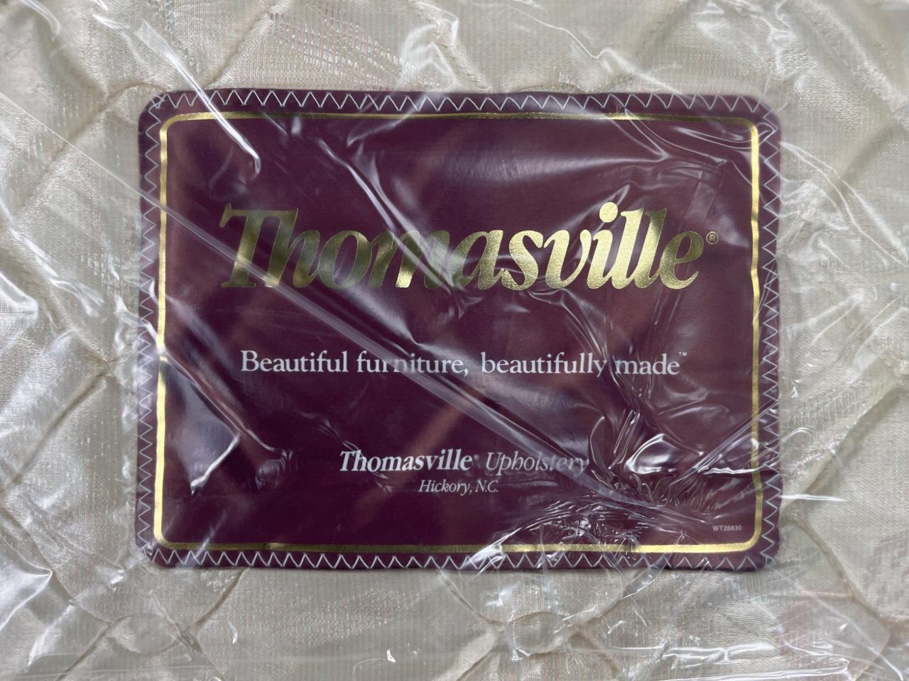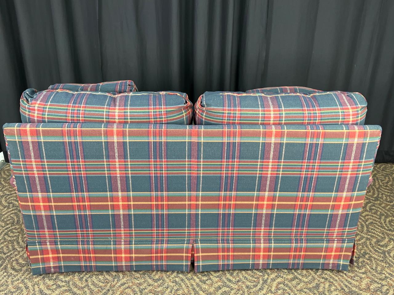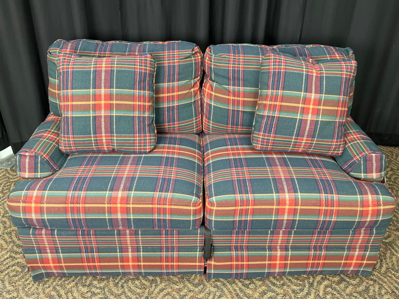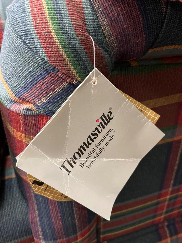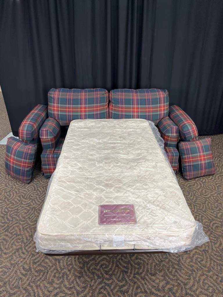 Thomasville loveseat upholstered in plaid fabric featuring vibrant red, yellow, and green tones. Includes two matching plaid cushions. Manufacturer tag attached. Pullout bed is a twin size appears unused. Couch measures 62″ x 36″ x 32″.