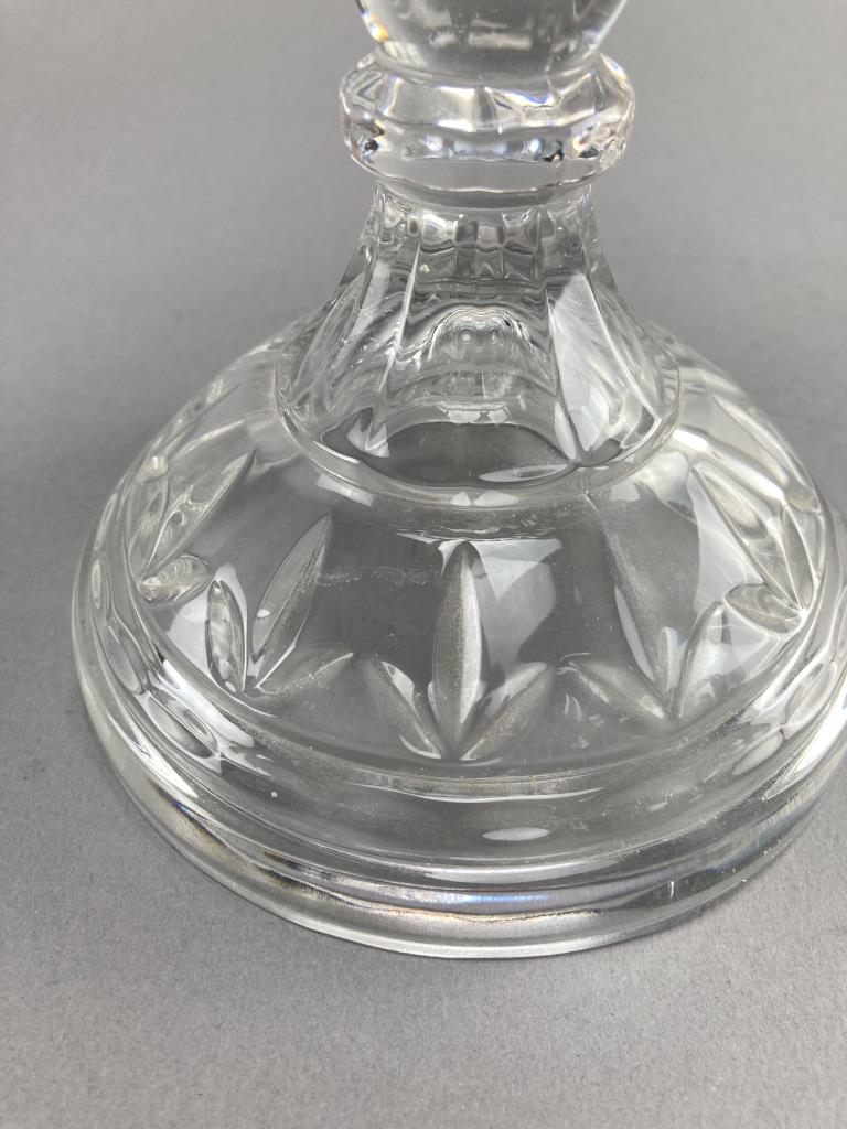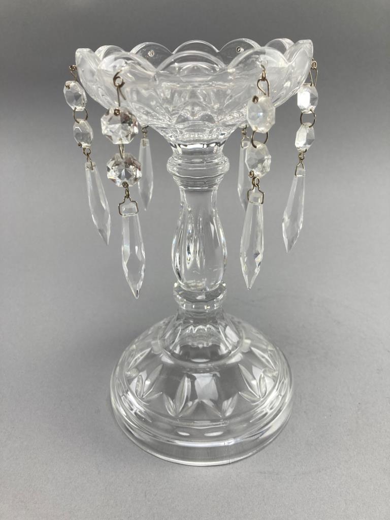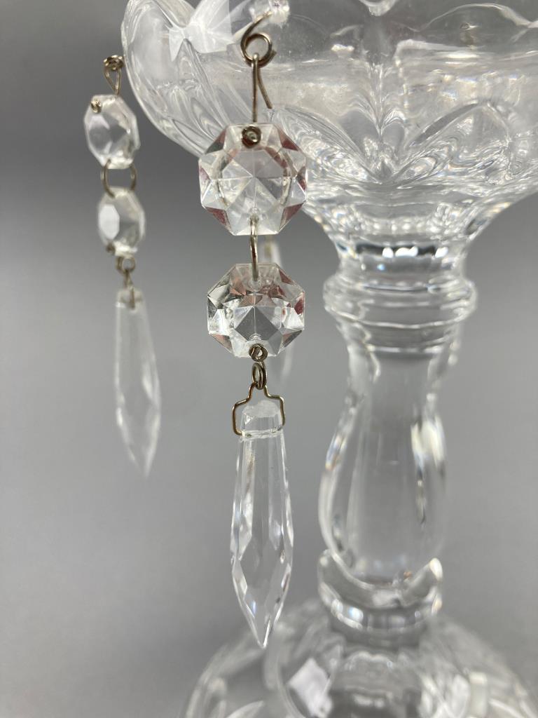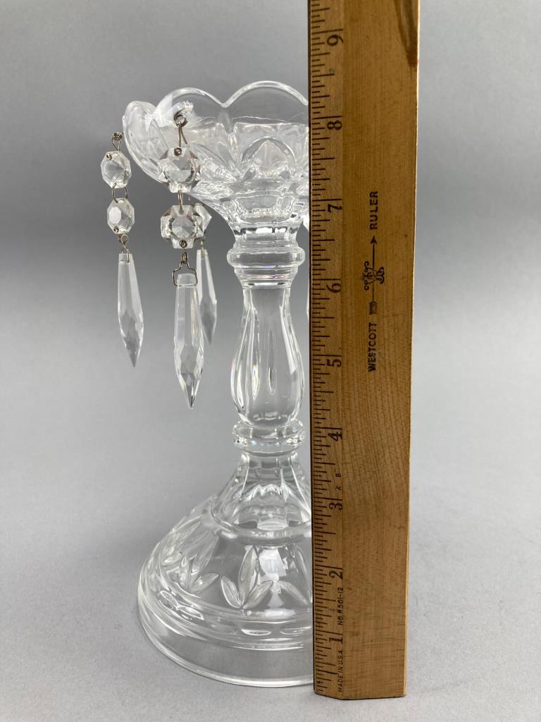 Clear crystal pedestal bowl featuring a scalloped rim and intricate cut patterns. Accented with hanging faceted crystal prisms. Notable for its decorative design and craftsmanship. Minor wear noted on some prisms.
