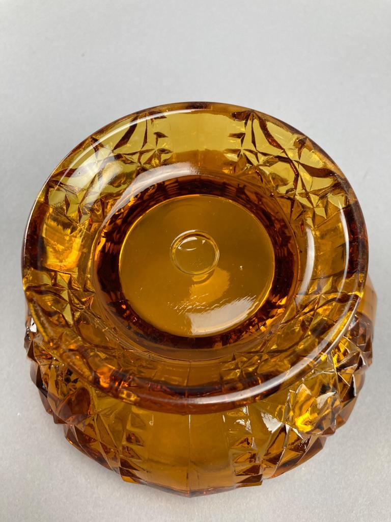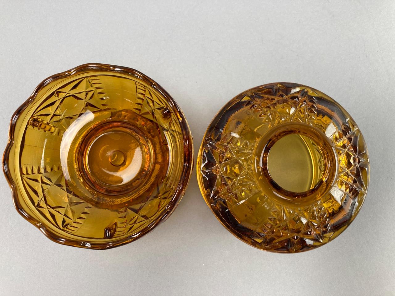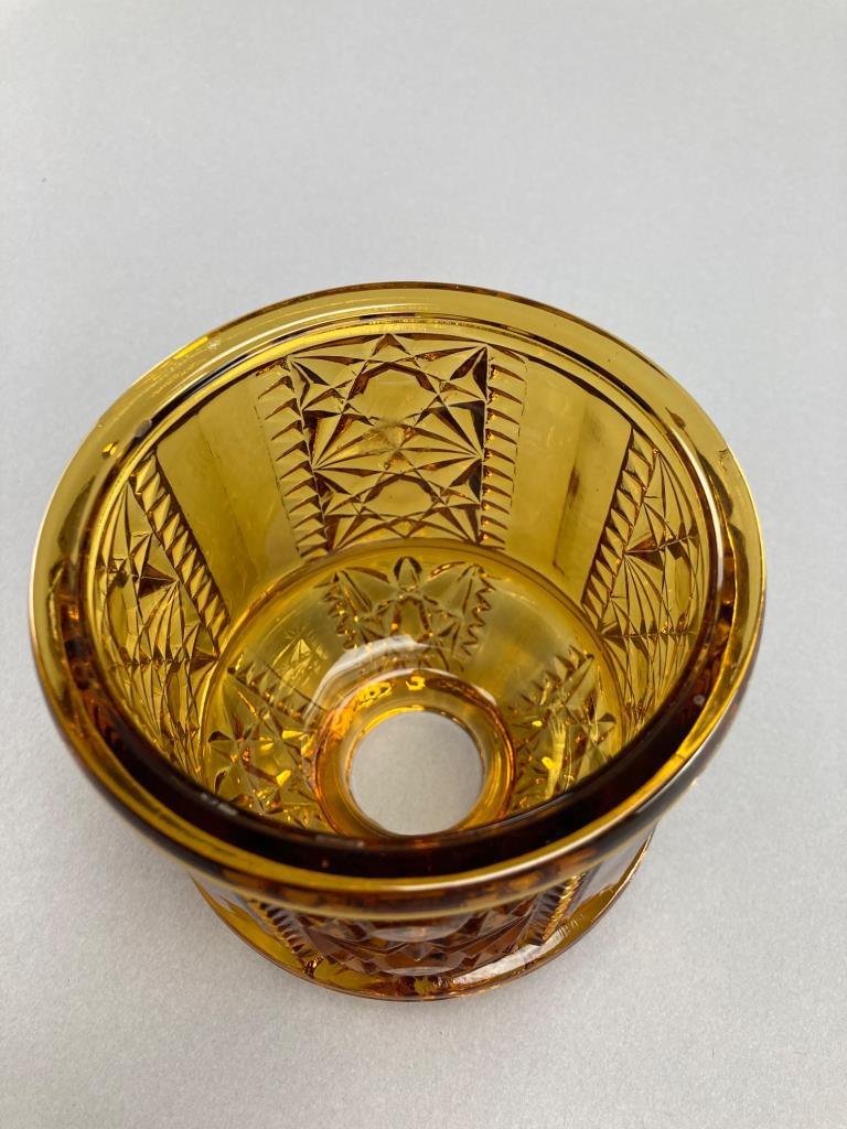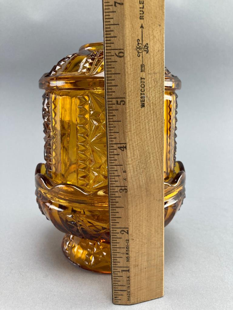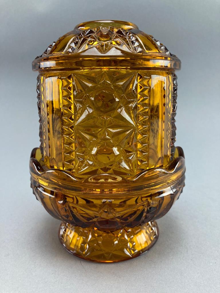 Amber glass fairy lamp by L.E. Smith with a detailed cut glass design. Composed of two parts: a dome and base, featuring star and geometric patterns.