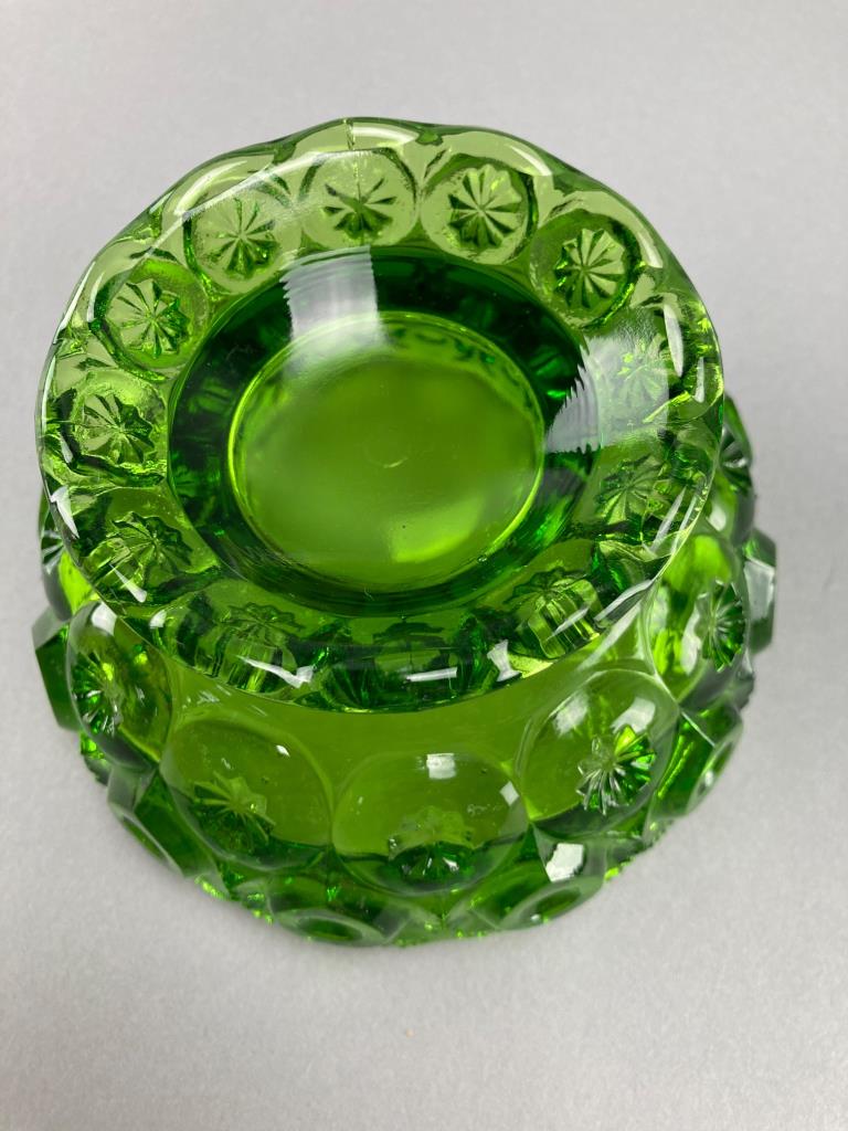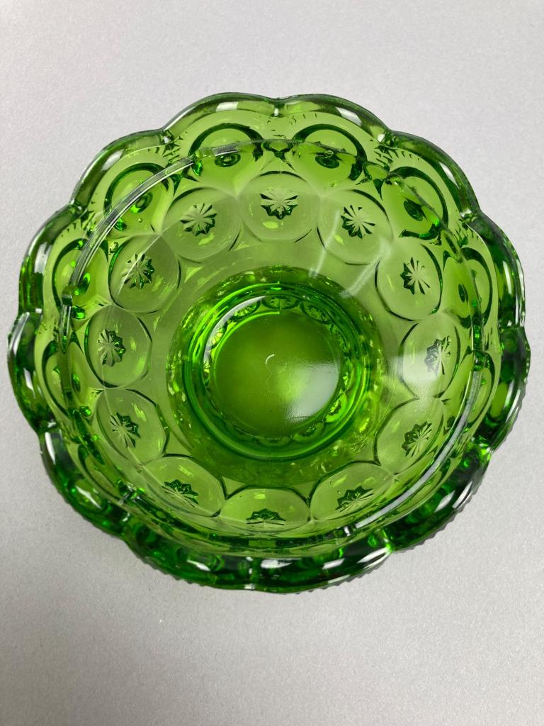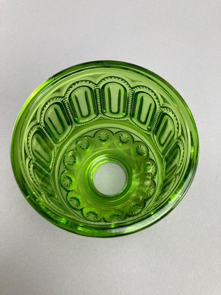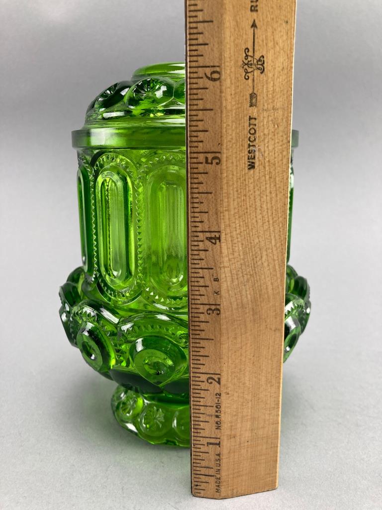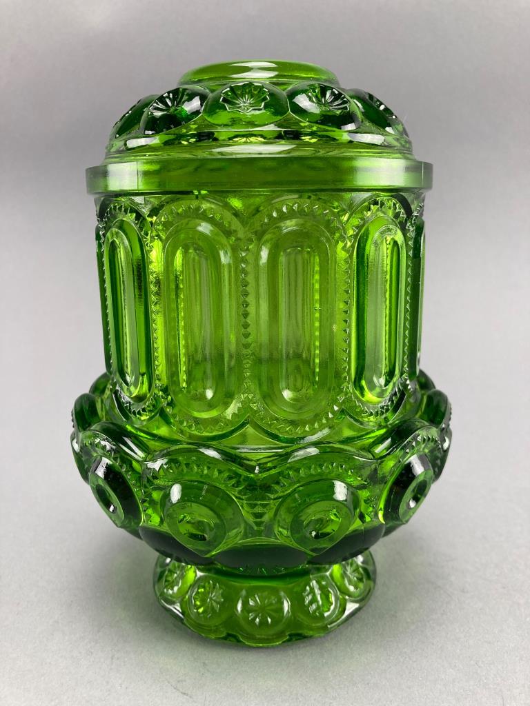 Green glass fairy lamp made by L.E. Smith, featuring an ornate pattern with a two-piece construction. The top and bottom sections interlock, showcasing elegant embossed moon and stars designs.