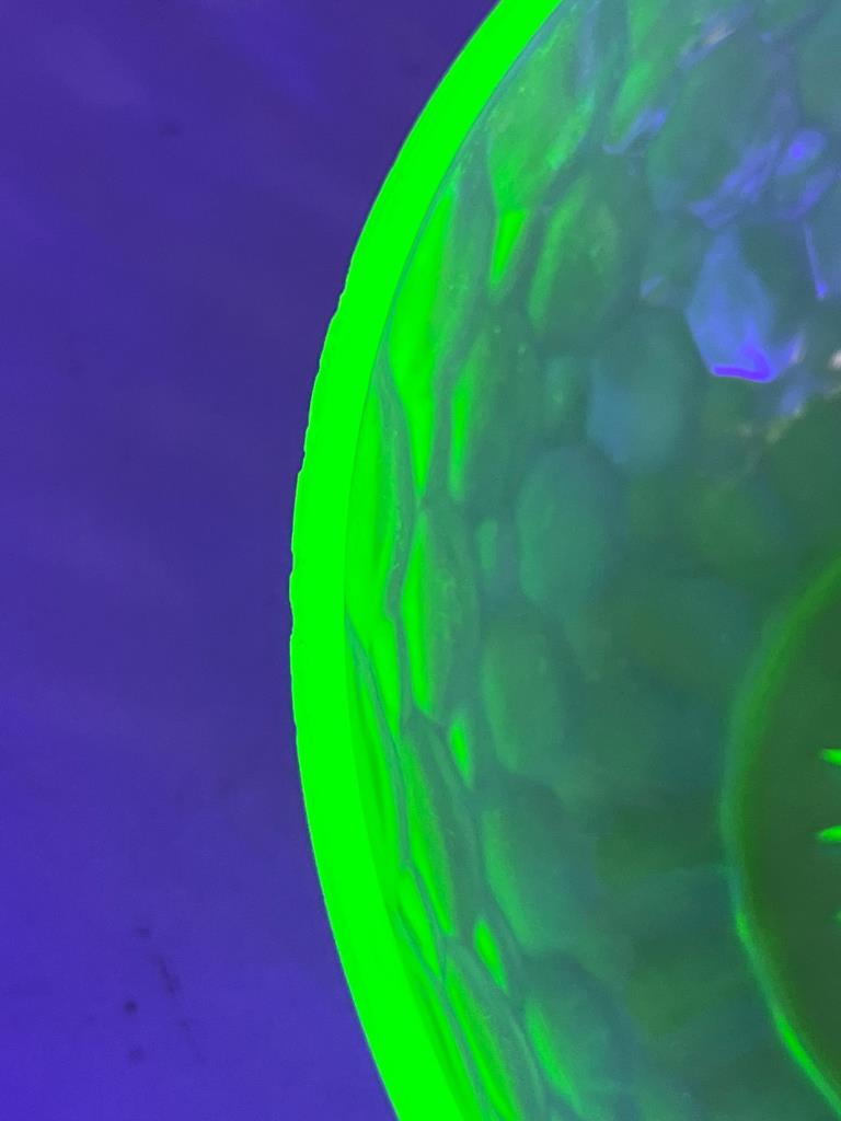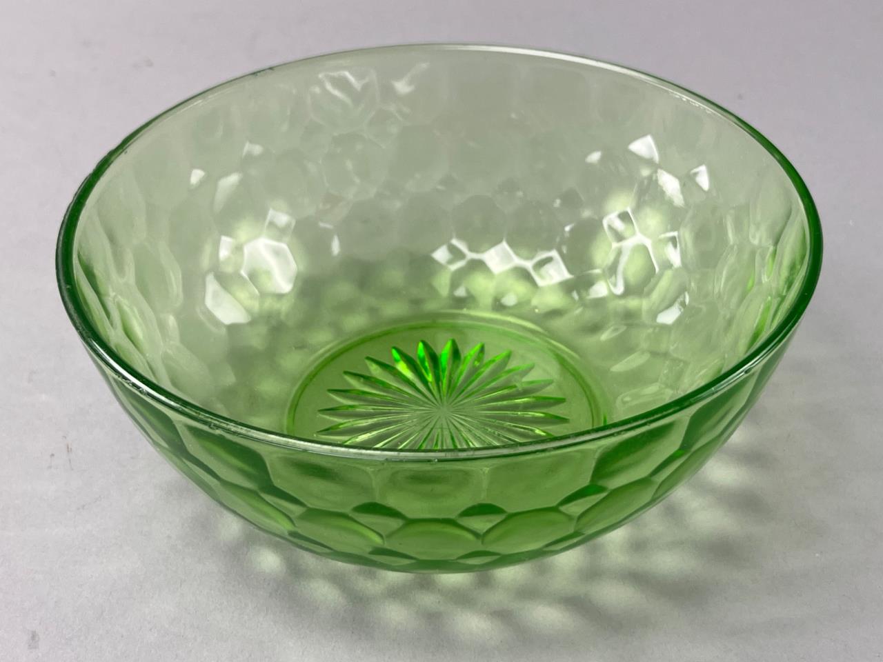 Green uranium glass bowl featuring a hobnail texture and starburst pattern on the base. Glows under UV light. No visible cracks or chips in provided images.