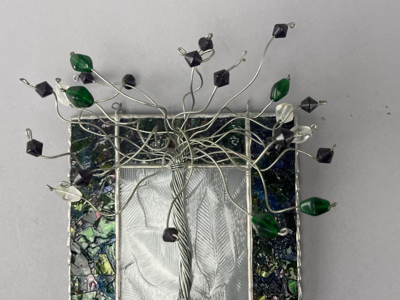 Stained glass panel featuring a tree design crafted from twisted wire. Glass frame displays a multicolored pattern. Accents include wire branches adorned with green, white, and purple beads. Back panel is solid with complementary tones.