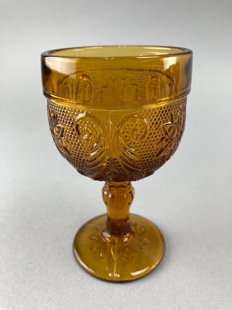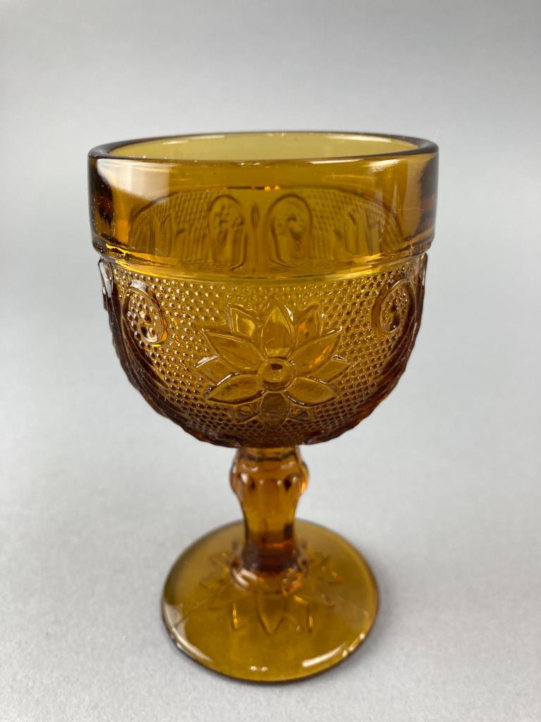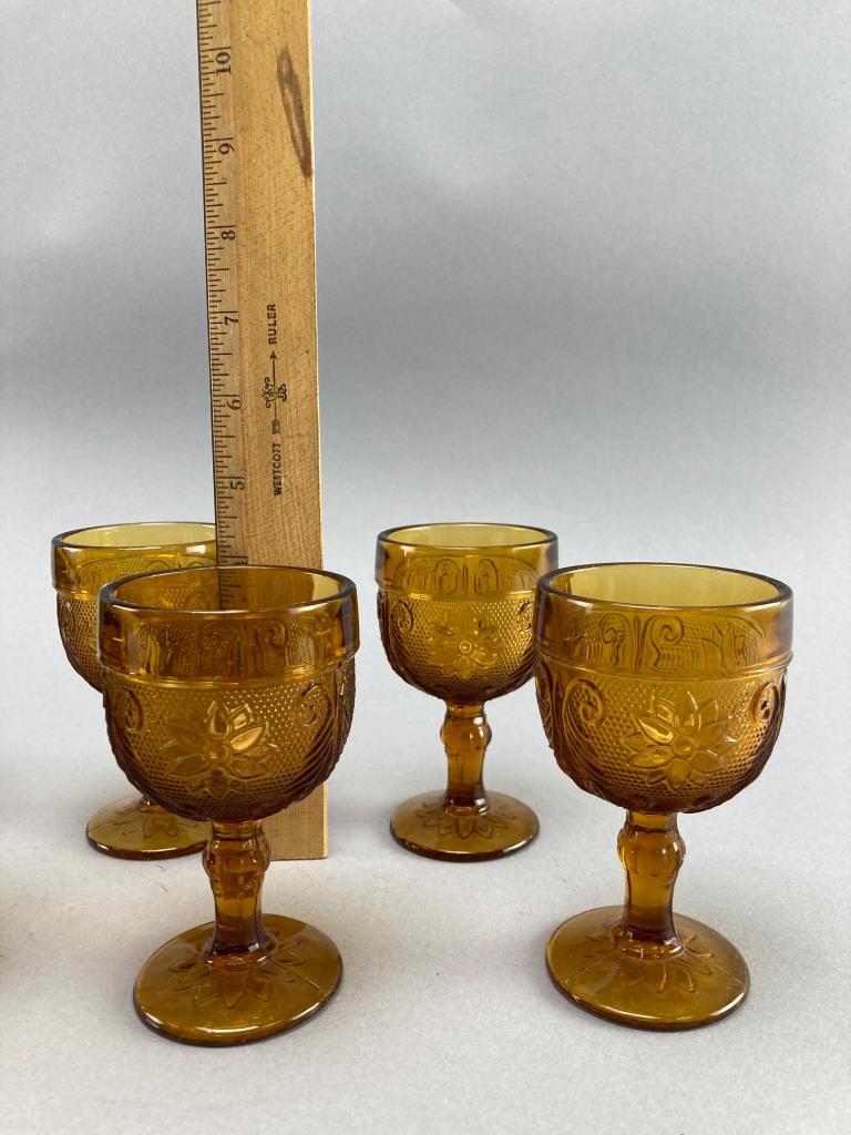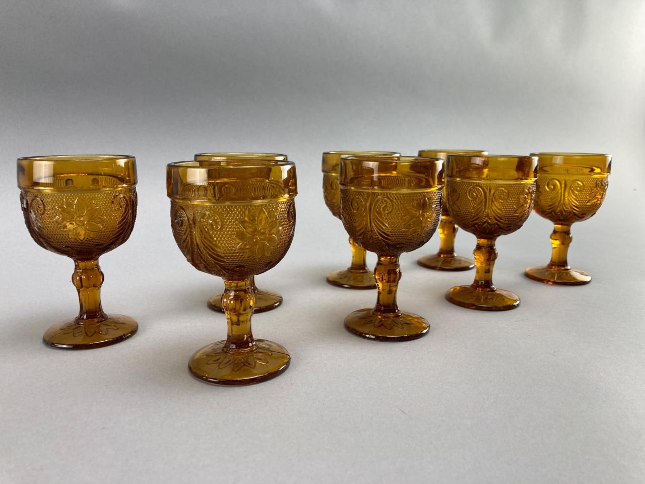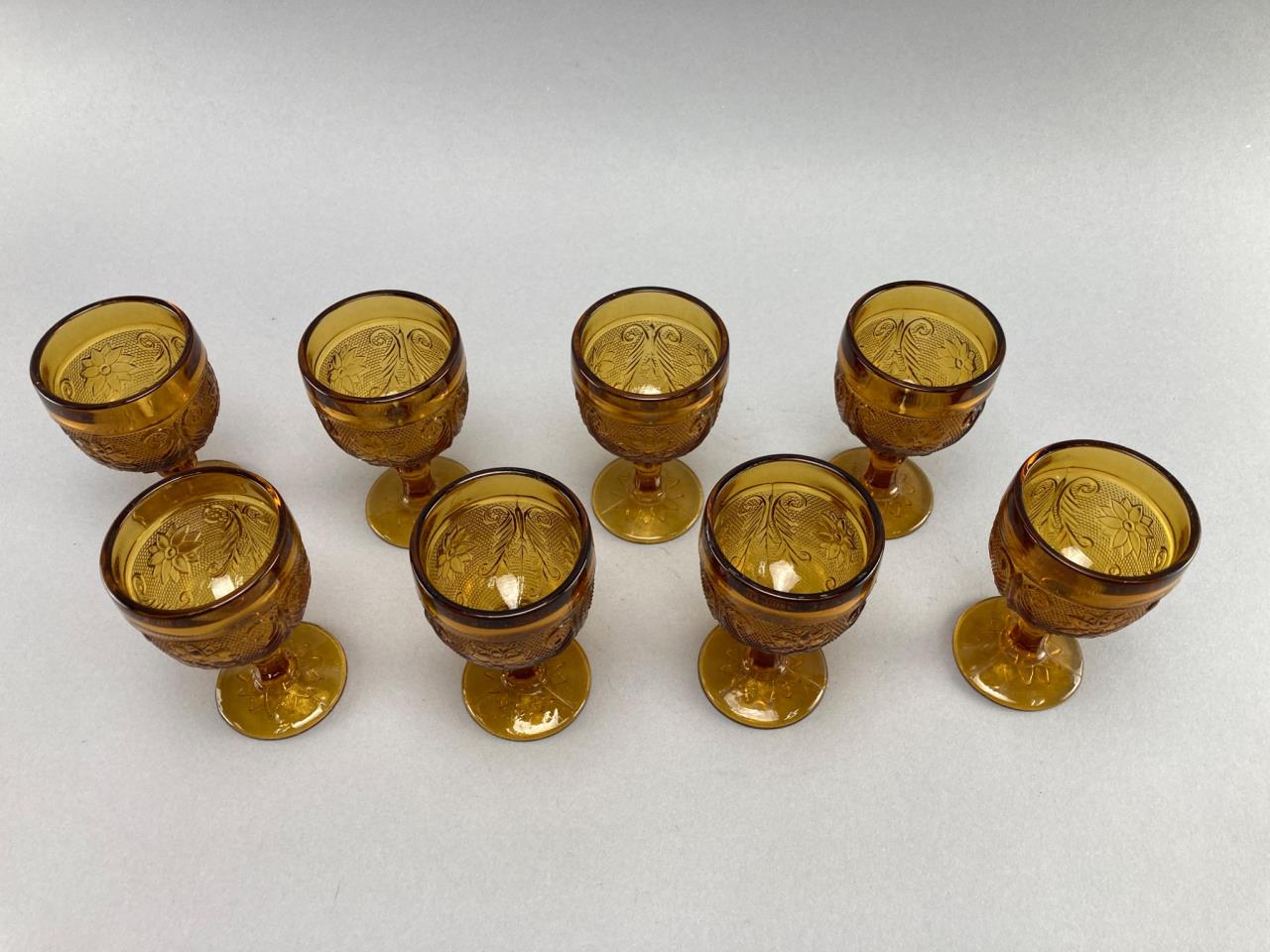 Eight Indiana amber Tiara glass cordials featuring embossed floral and scroll designs. Crafted with intricate details, these goblets are notable for their amber hue and elegant design.