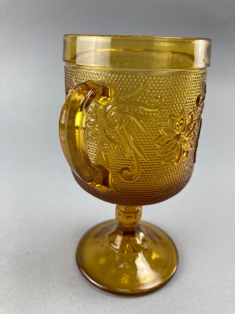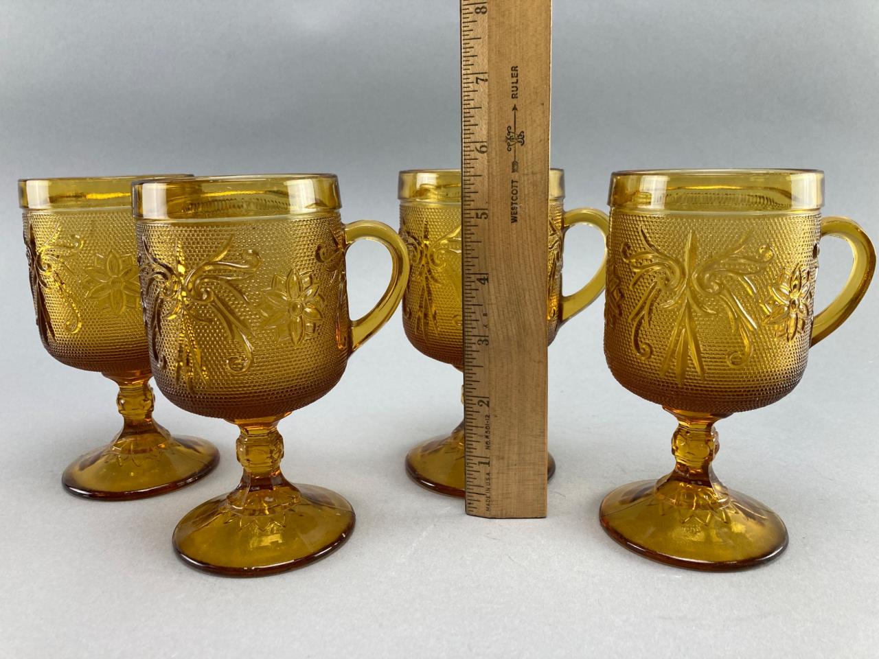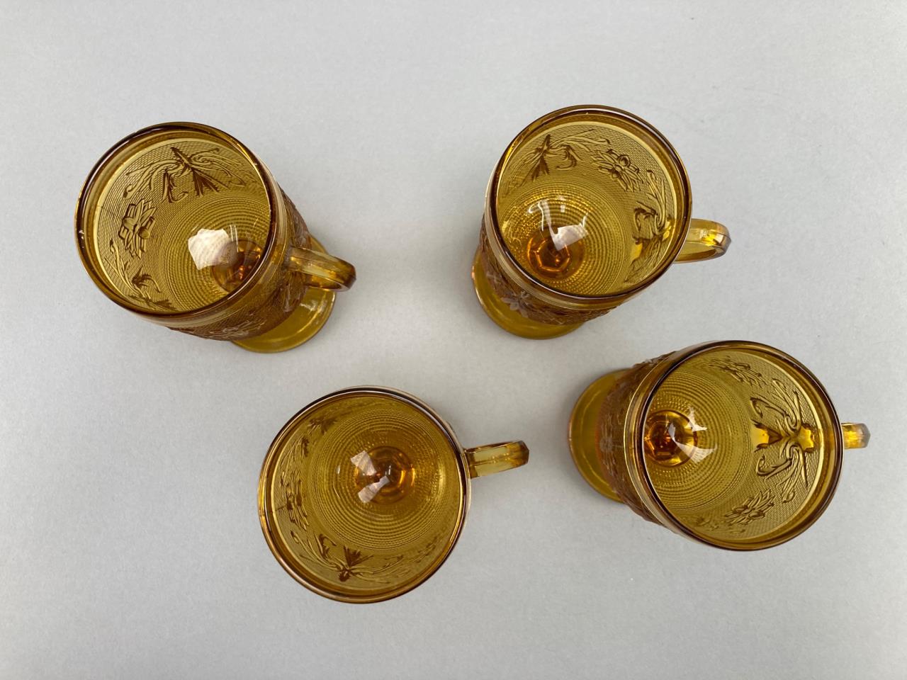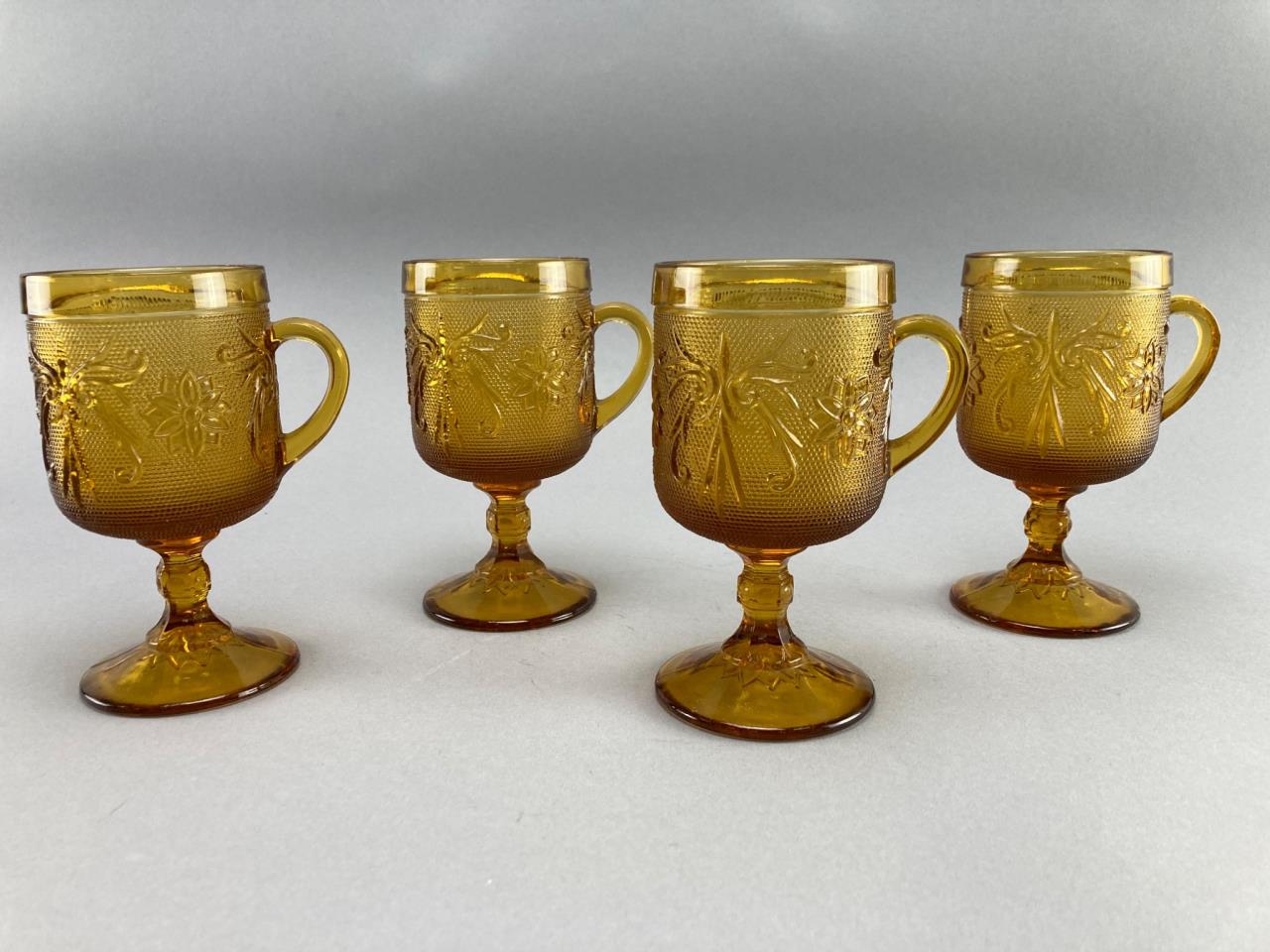 Four amber glass goblets featuring raised floral and vine motifs. Each goblet includes a handle and a pedestal base.