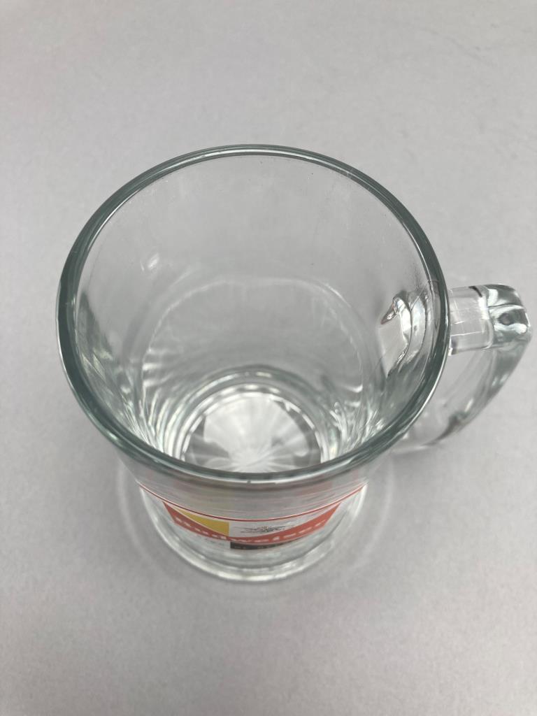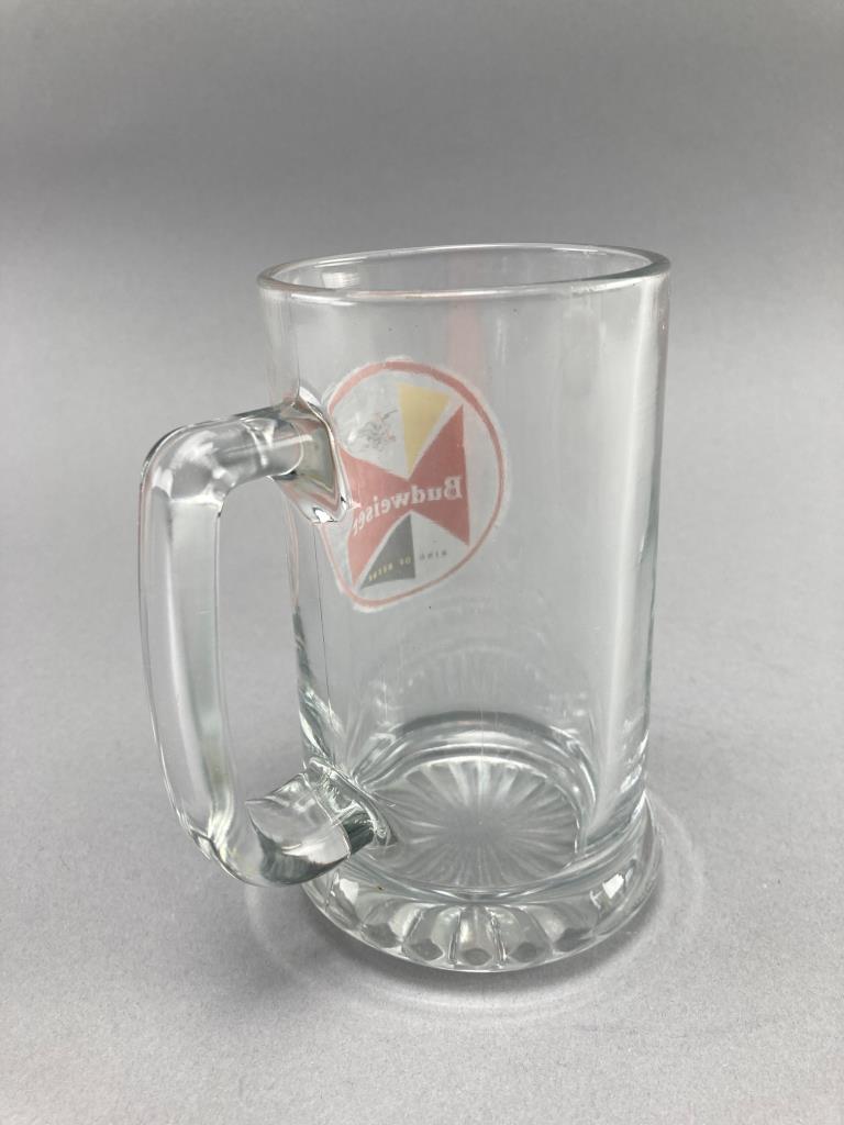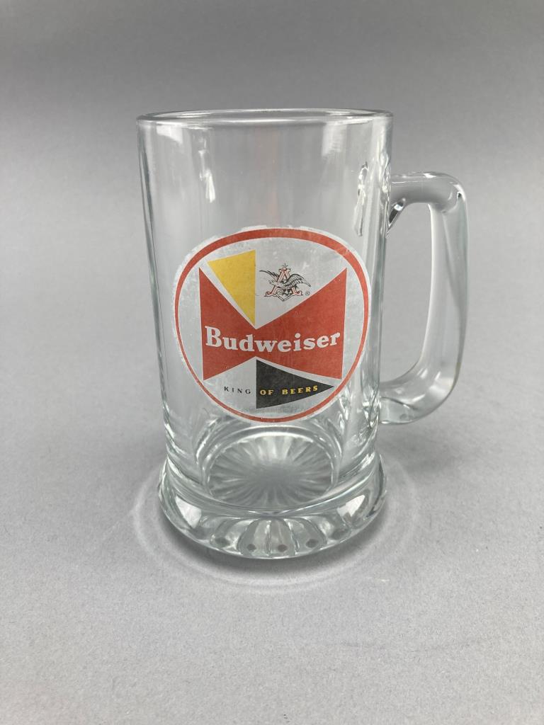 Clear glass beer mug featuring the Budweiser logo with ‘King of Beers’ text. Designed with a sturdy handle and a starburst pattern on the base. Logo and glass show standard wear from use.