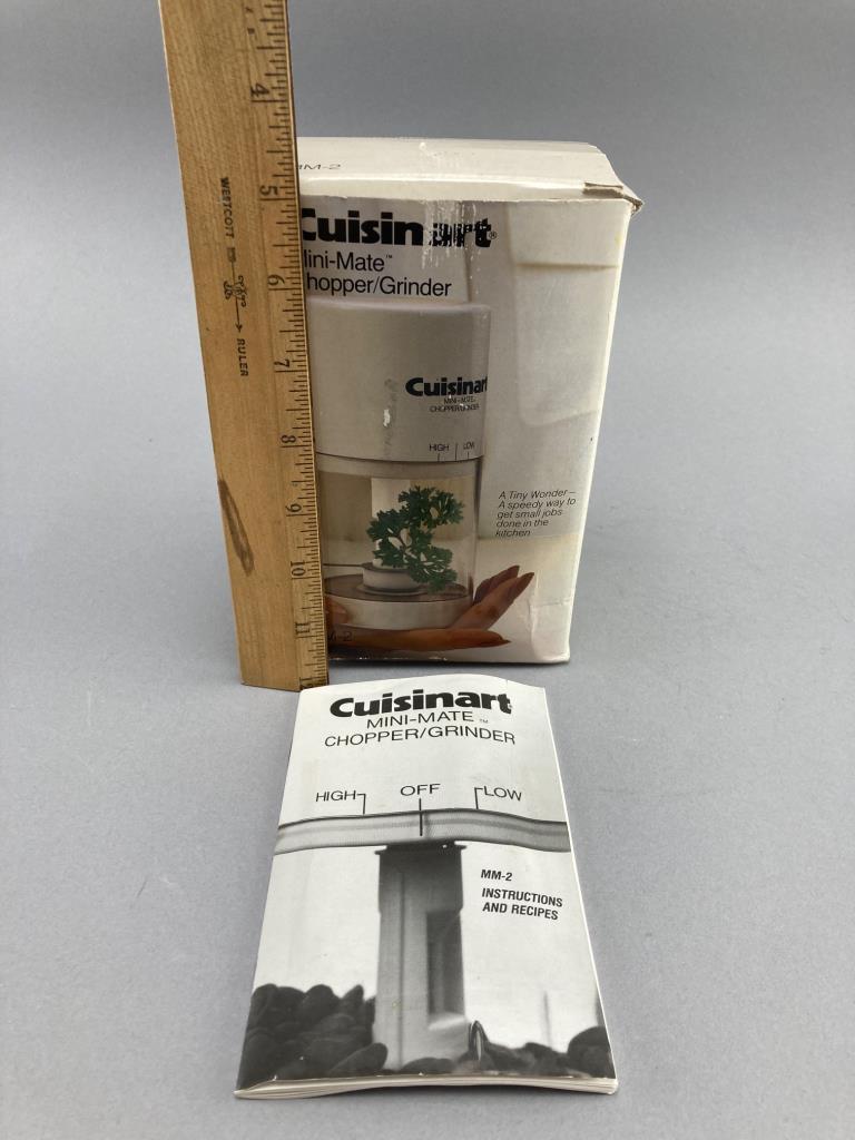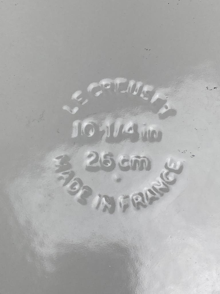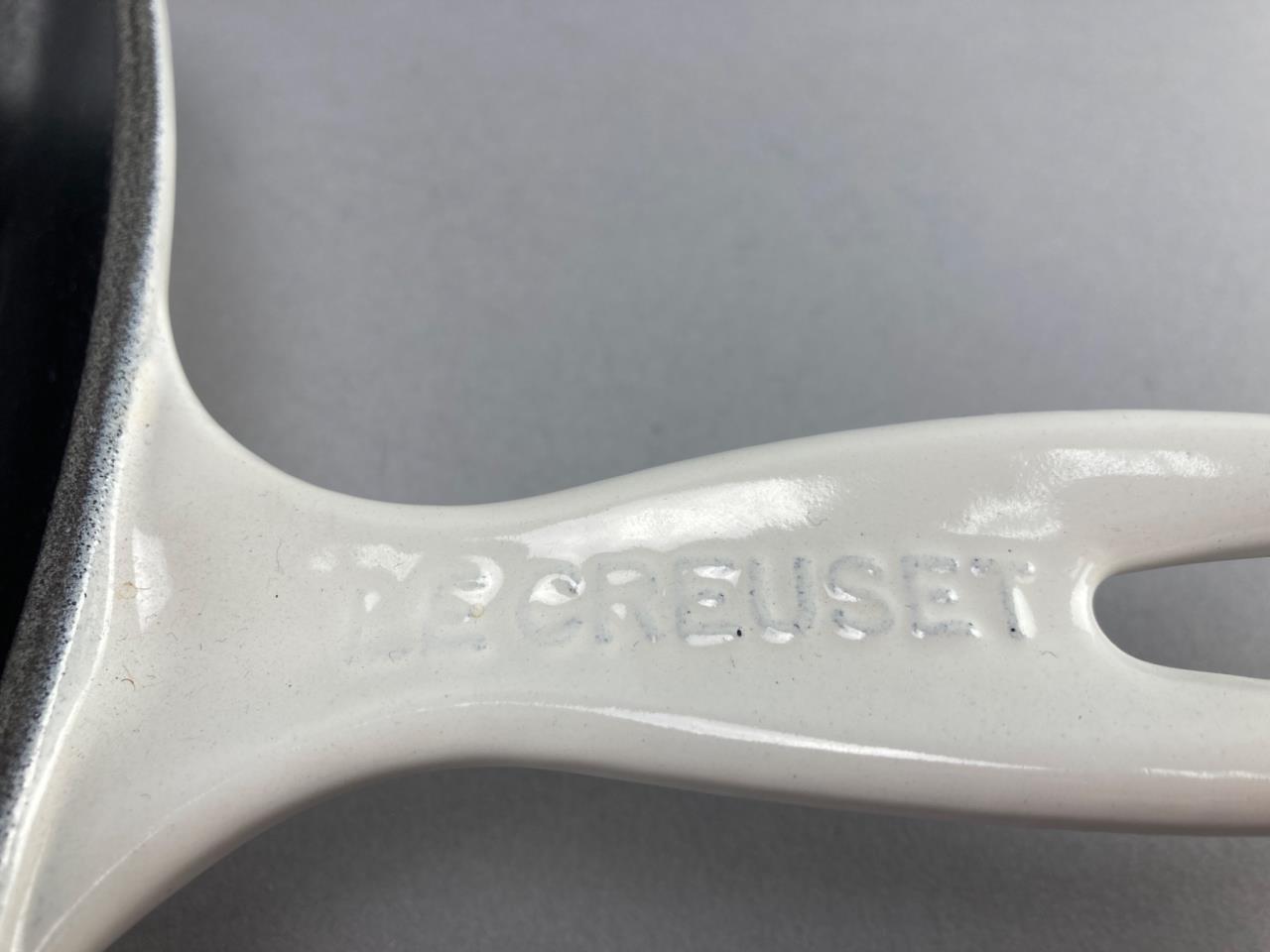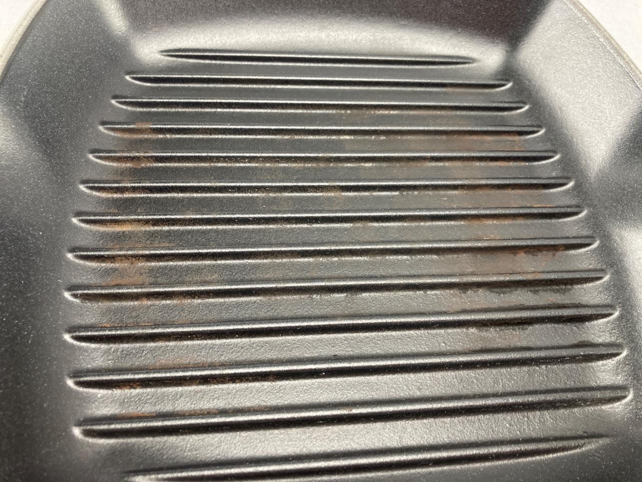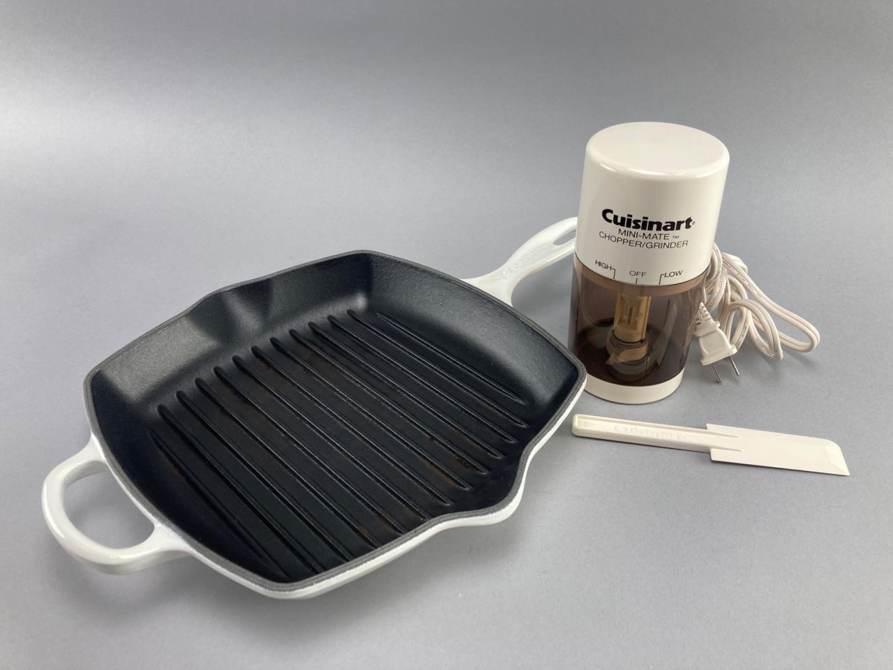 Includes a Le Creuset enamel-coated cast iron grill pan, marked Made in France, and a Cuisinart Mini-Mate chopper/grinder with original box and instructions. Notable surface wear visible on the grill pan.