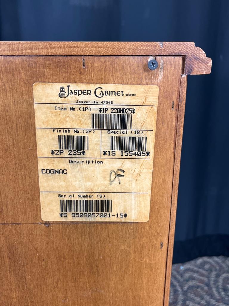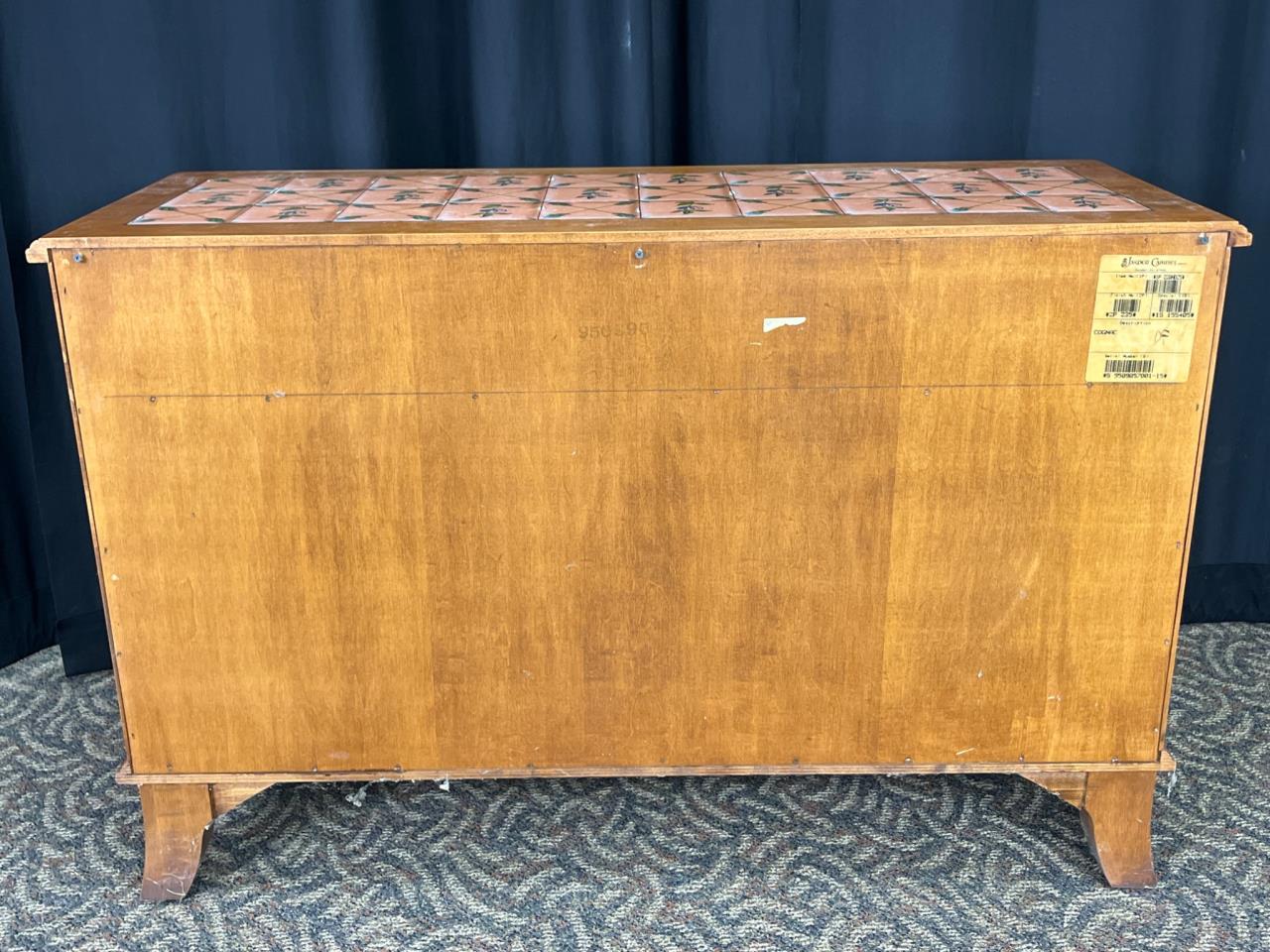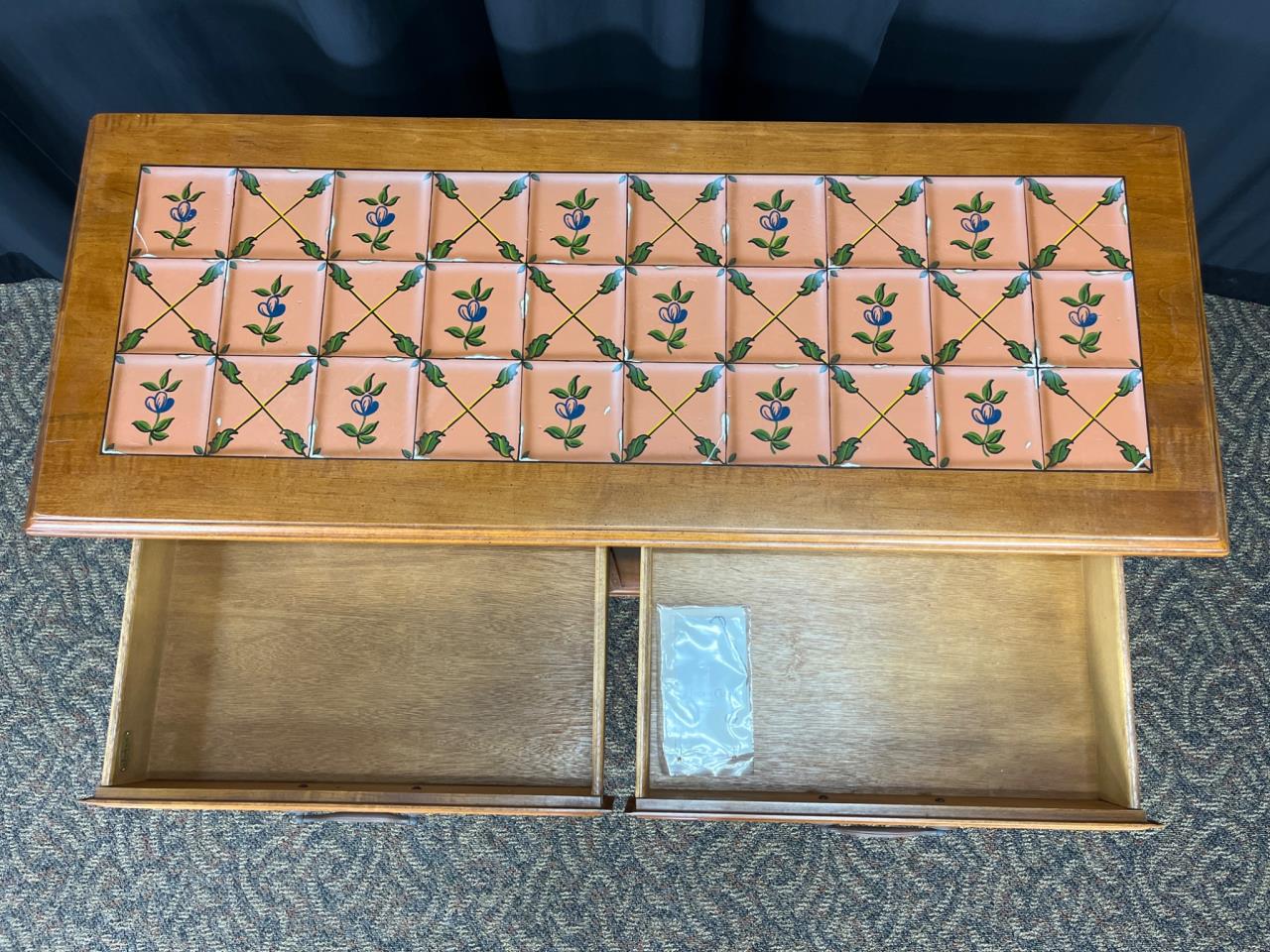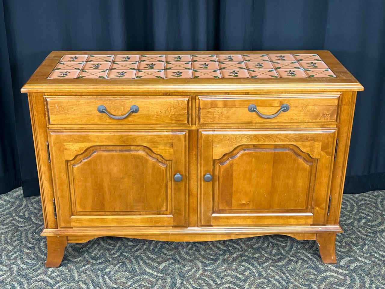 Wooden sideboard with two drawers and two cabinet doors. Features a tile-inlaid top with a floral motif. Manufactured by Jasper Cabinet, as noted in the drawer. Signs of wear visible on tile edges. Cabinet measures 47″ x 18″ x 32″.
