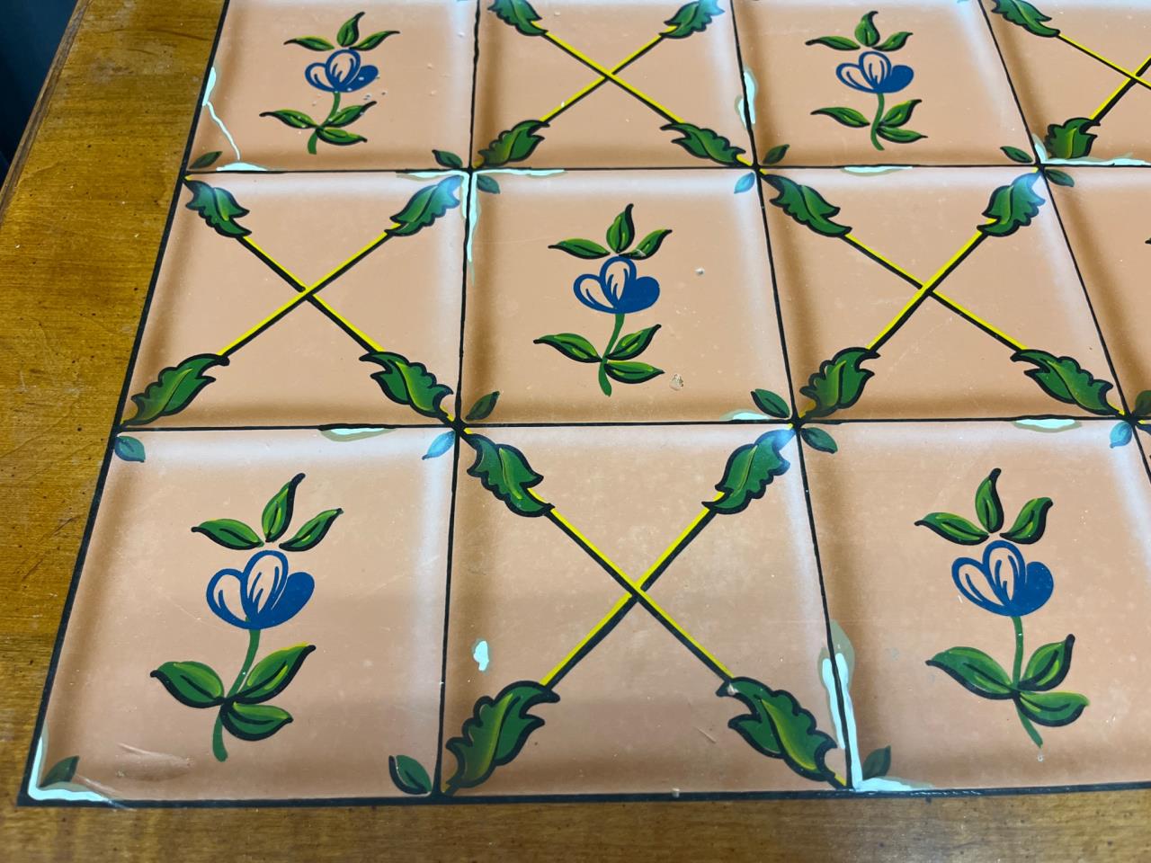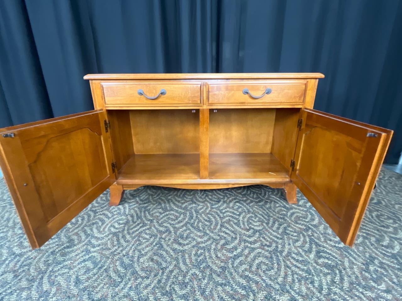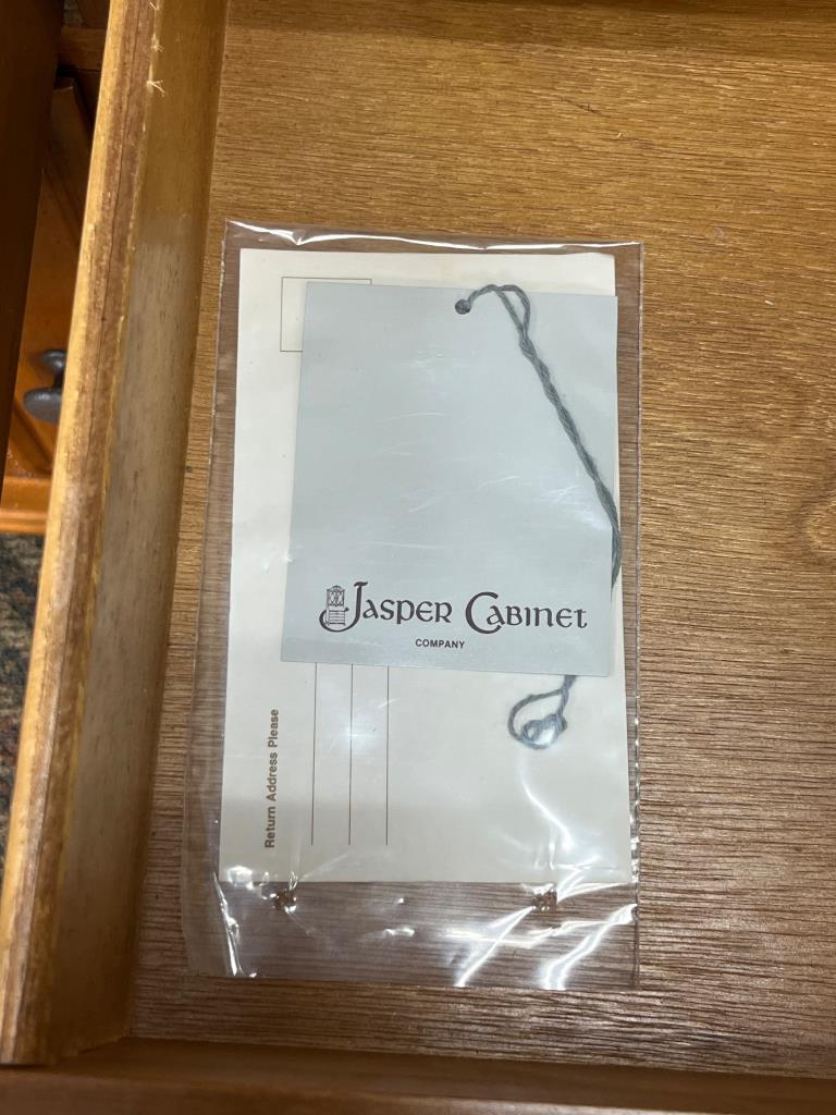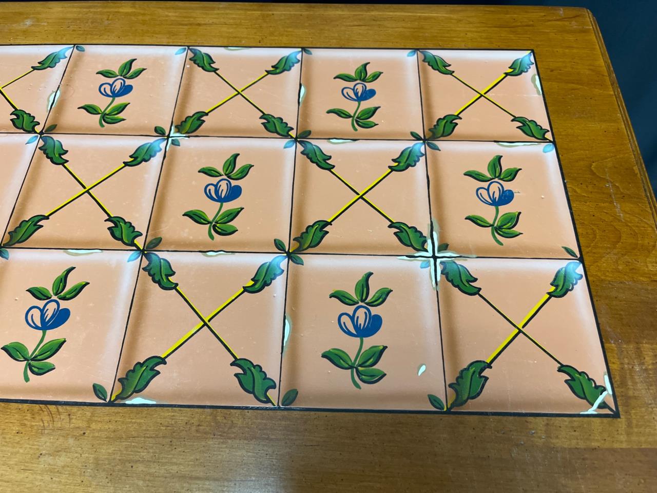 Wooden sideboard with two drawers and two cabinet doors. Features a tile-inlaid top with a floral motif. Manufactured by Jasper Cabinet, as noted in the drawer. Signs of wear visible on tile edges. Cabinet measures 47″ x 18″ x 32″.