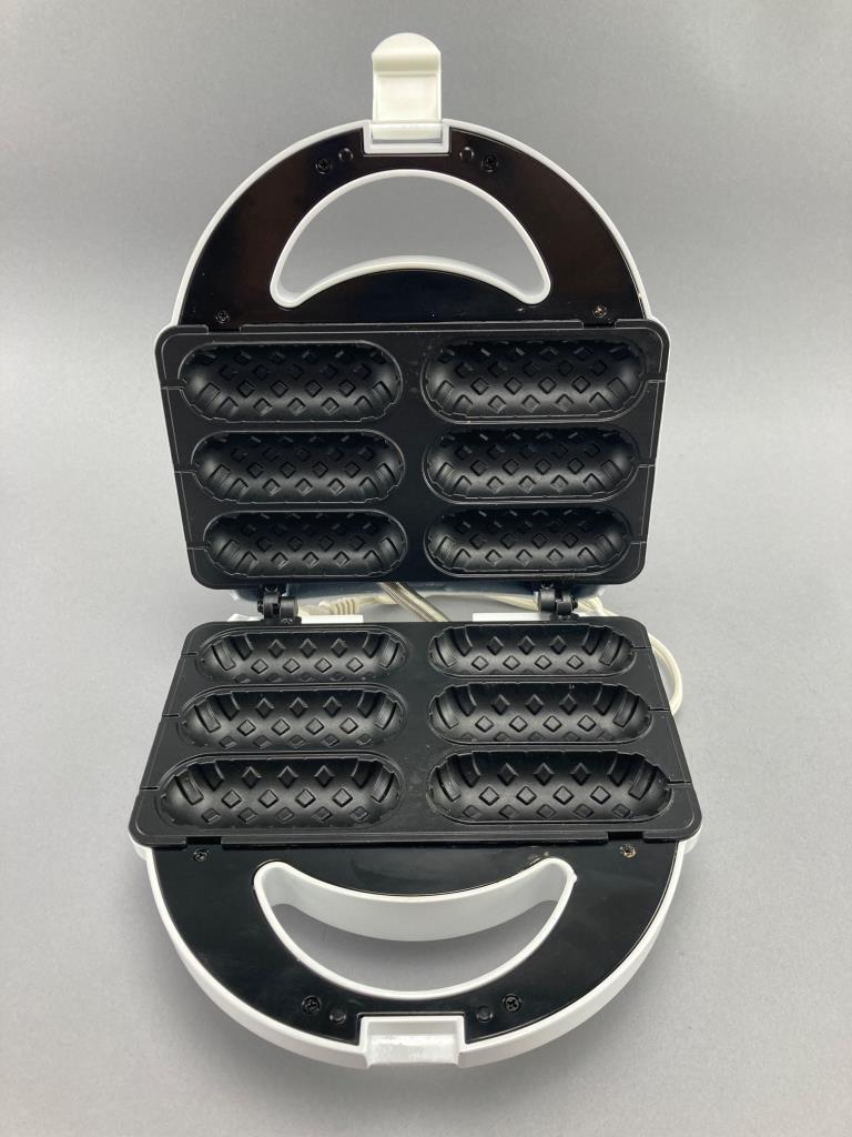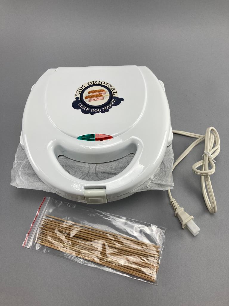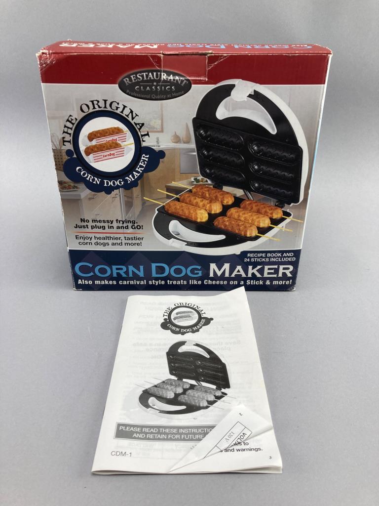 The Original Corn Dog Maker by Restaurant Classics in white. Includes the electric appliance, original packaging, and user manual. Designed to make corn dogs and similar snacks. Shows heating plates for up to six items.