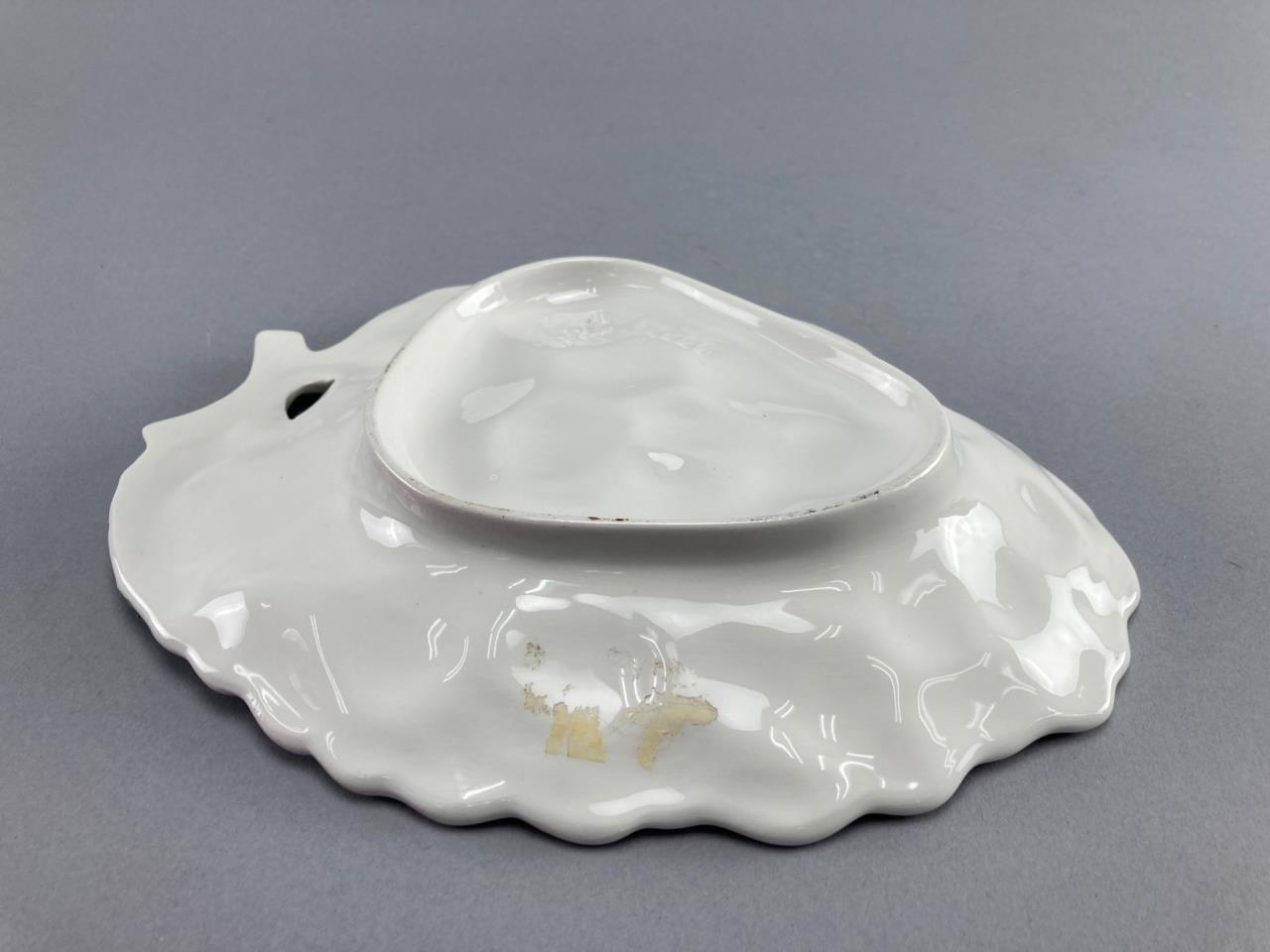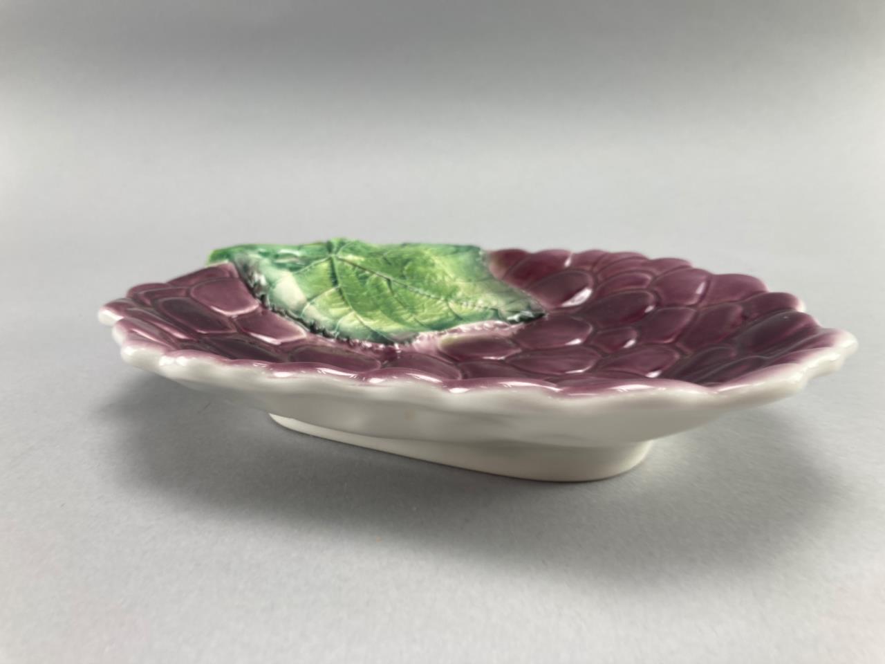 Ceramic dish in the shape of a blackberry with a raised green leaf detail. Marked ‘Made in Italy’ on the underside. Features a glossy finish with a molded texture. Wear and marks visible on the base.