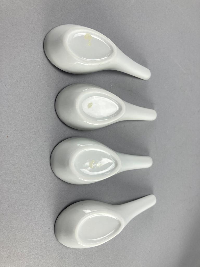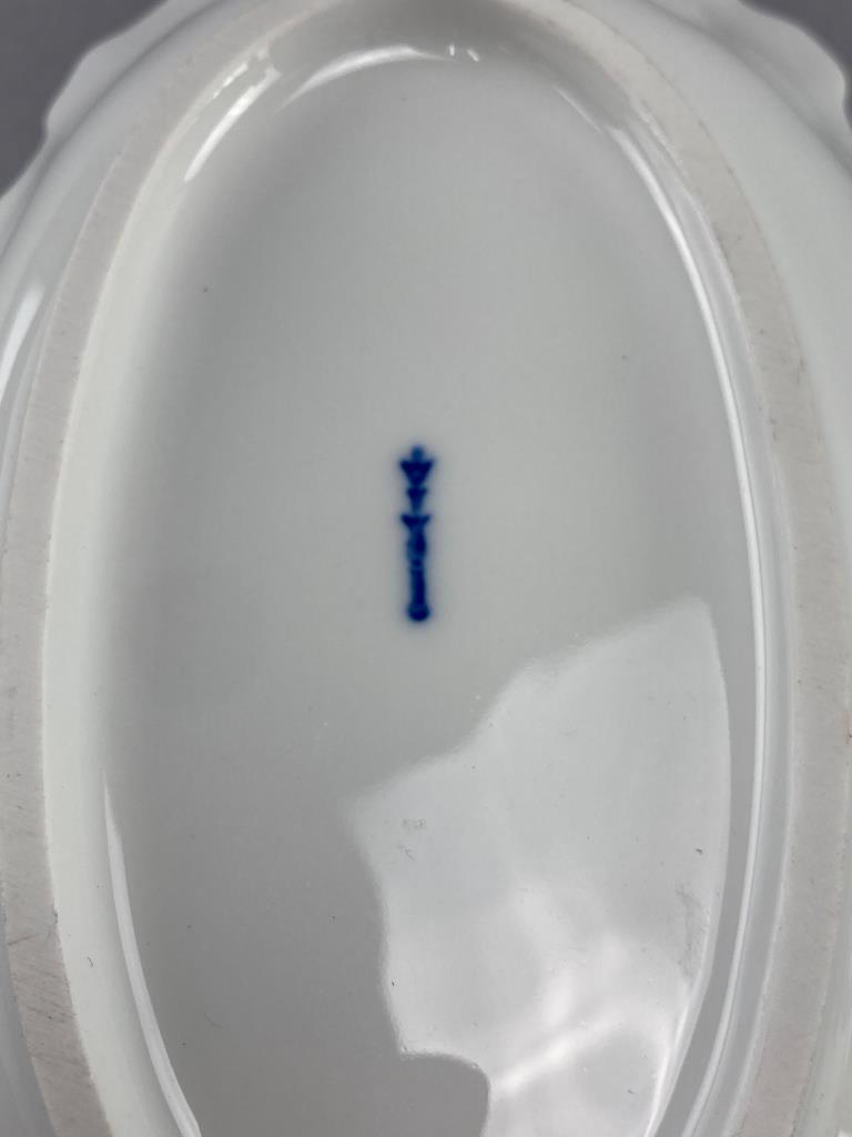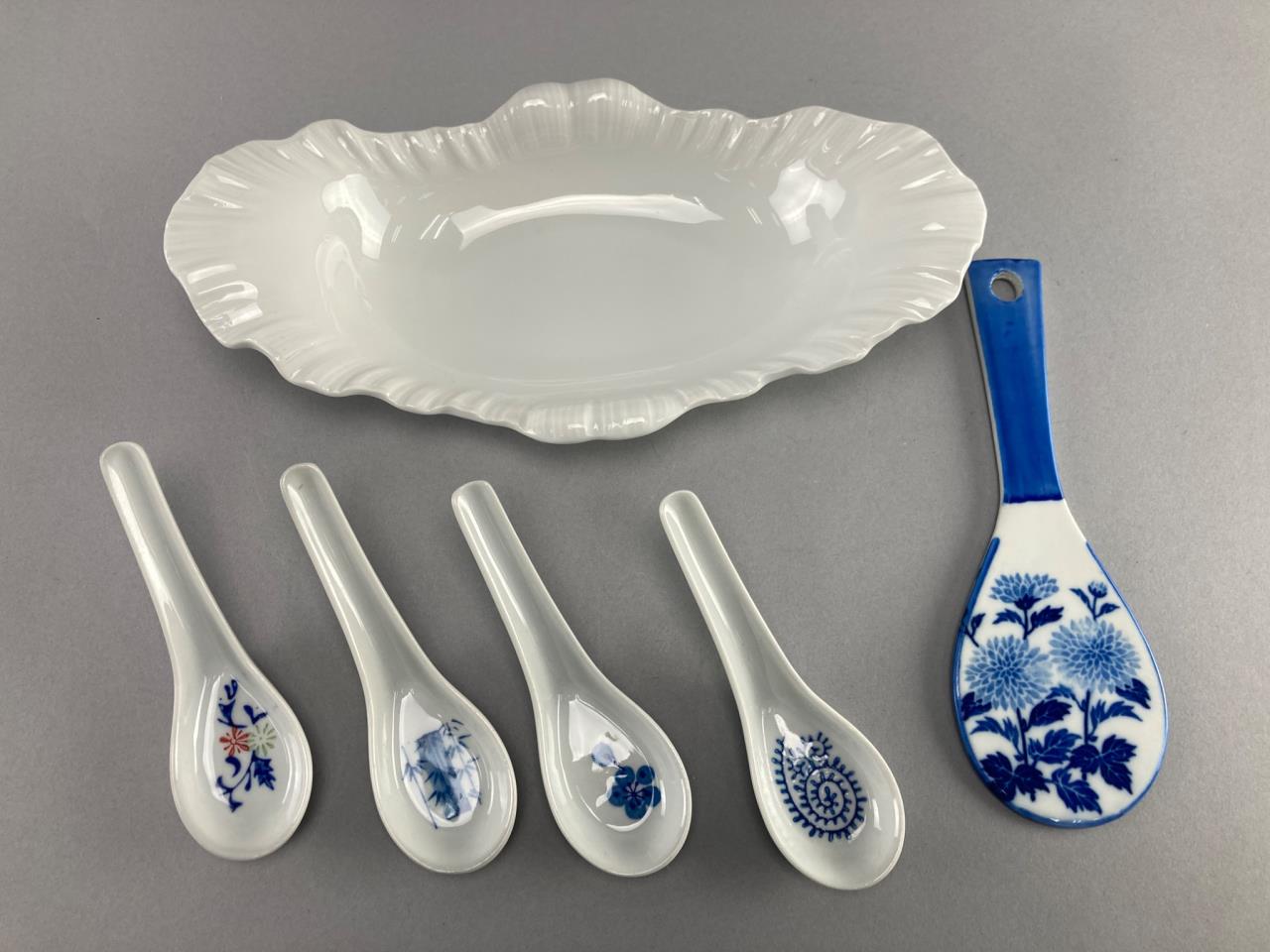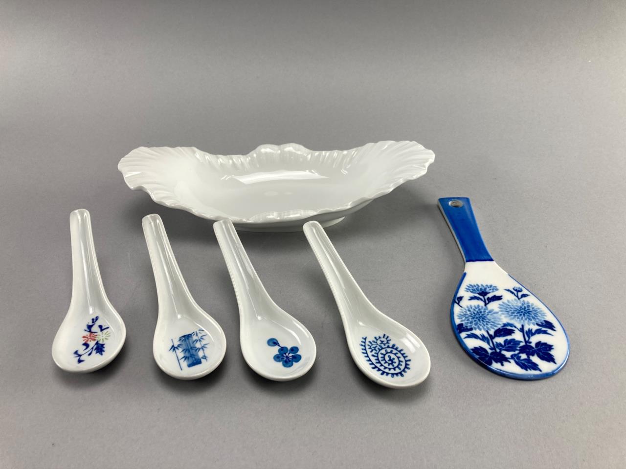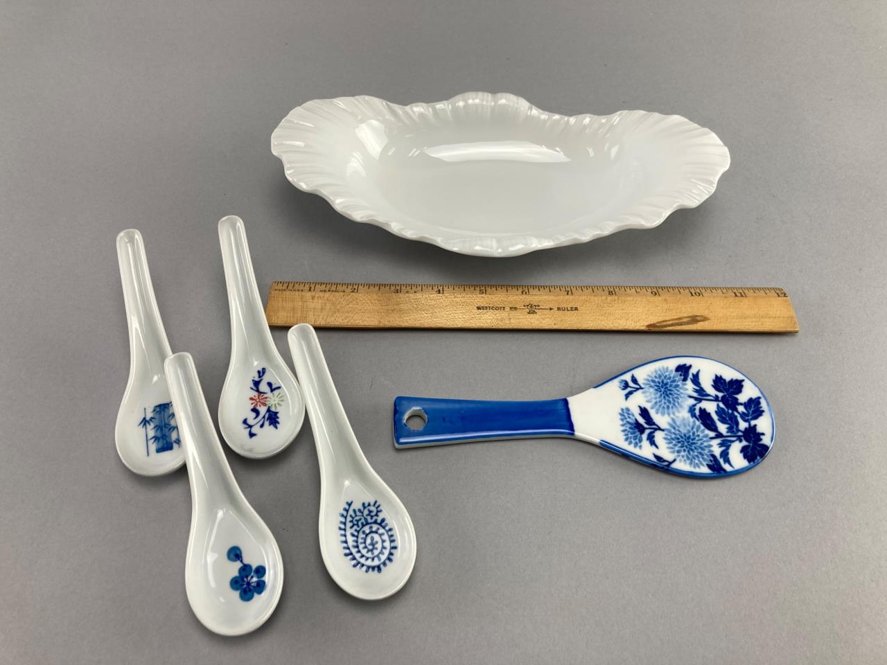A scalloped porcelain serving dish, four porcelain soup spoons with blue floral patterns, and one ceramic serving paddle with blue floral designs. Some blue markings visible on the underside of the dish and paddle.