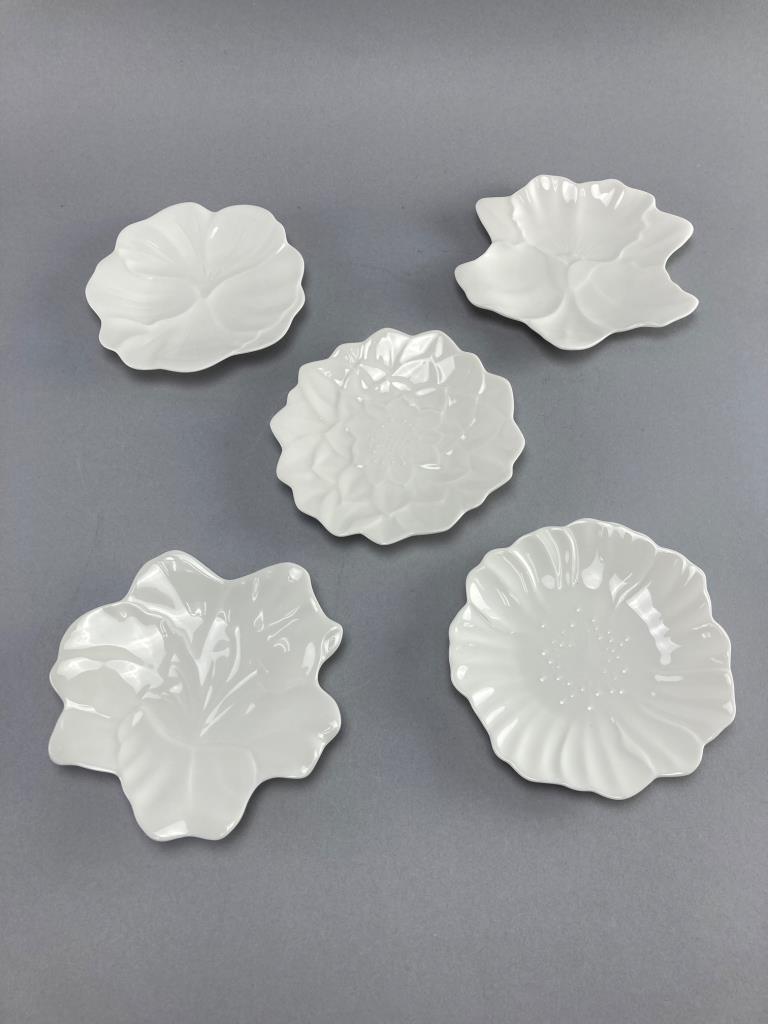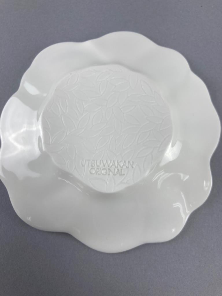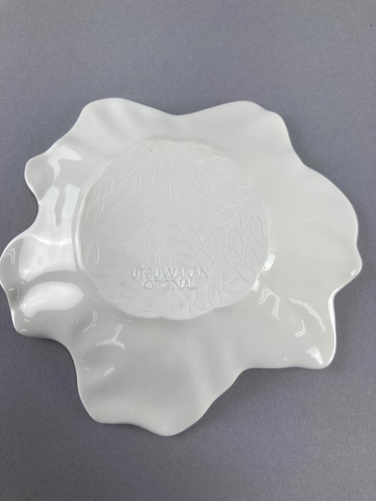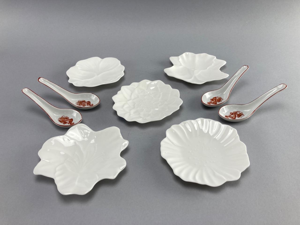 Five Utsuwakan Original textured floral white dishes and four ceramic spoons with red dragon embellishments. Dishes feature leaf patterns underneath.