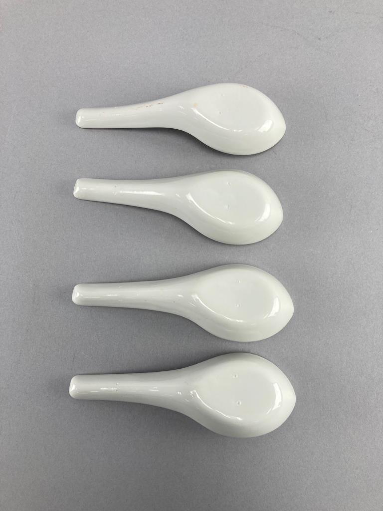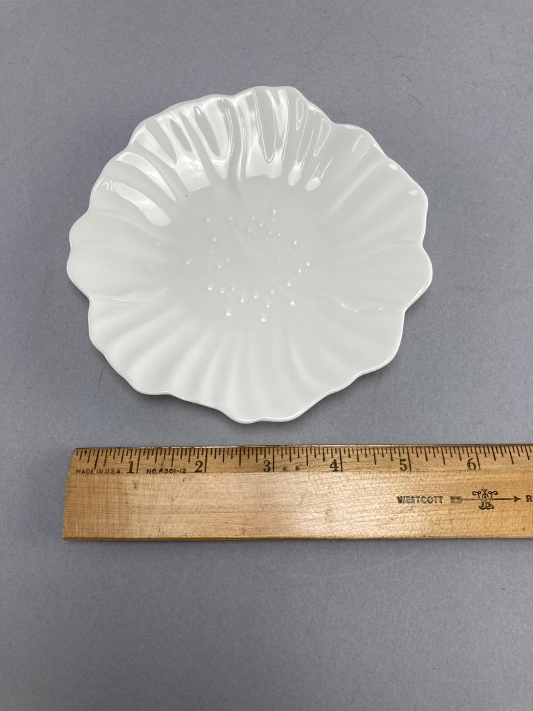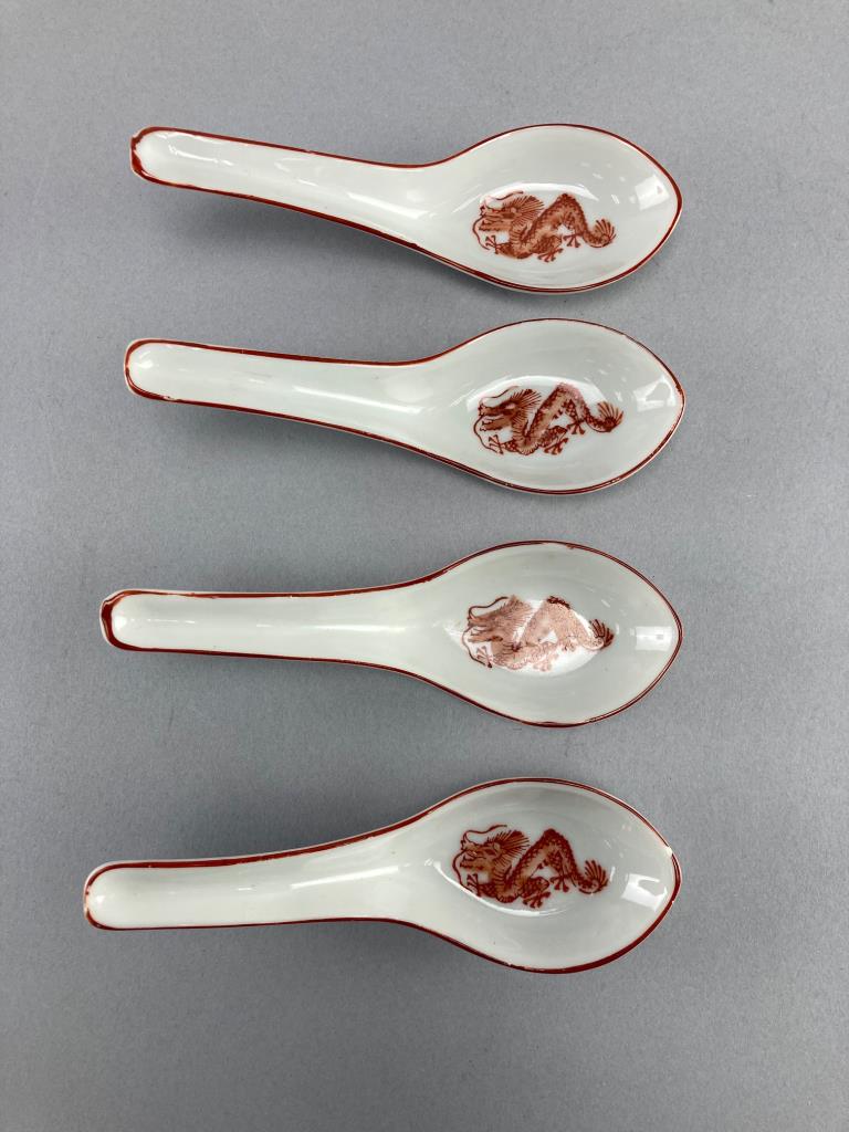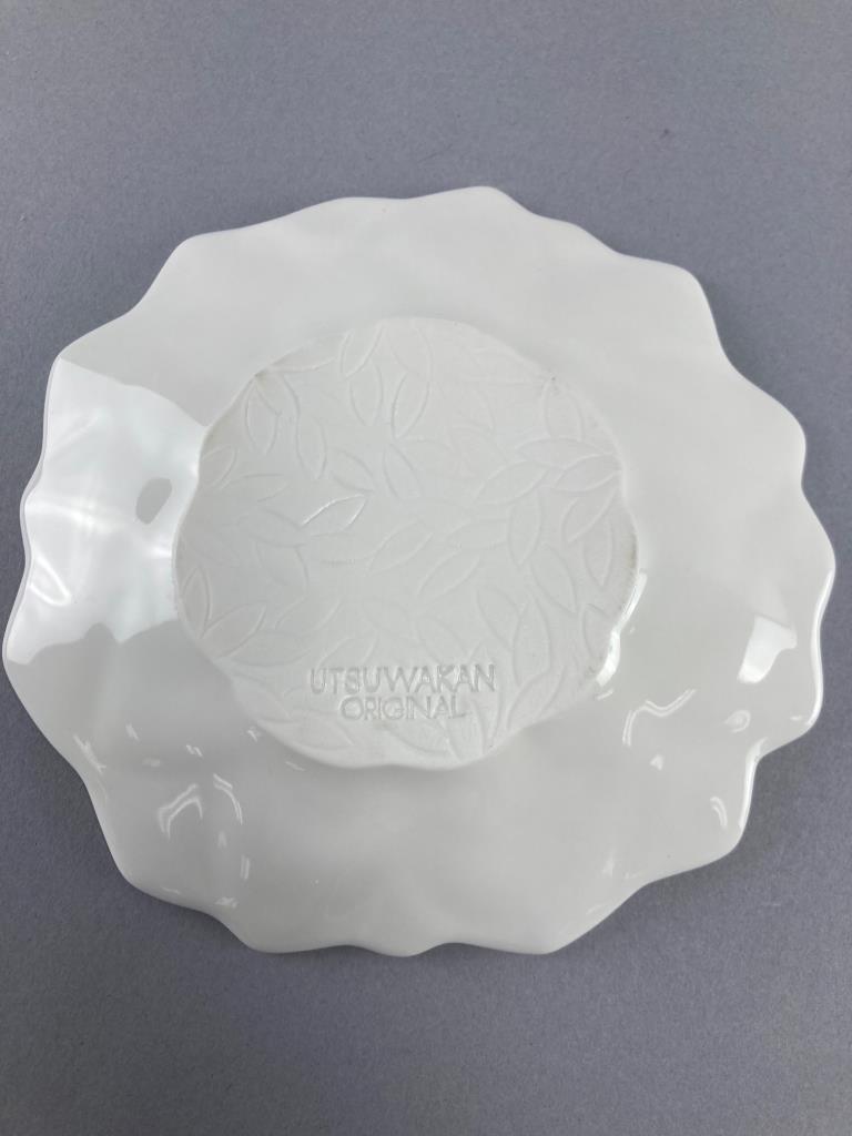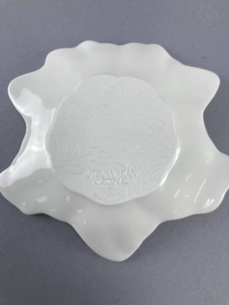 Five Utsuwakan Original textured floral white dishes and four ceramic spoons with red dragon embellishments. Dishes feature leaf patterns underneath.
