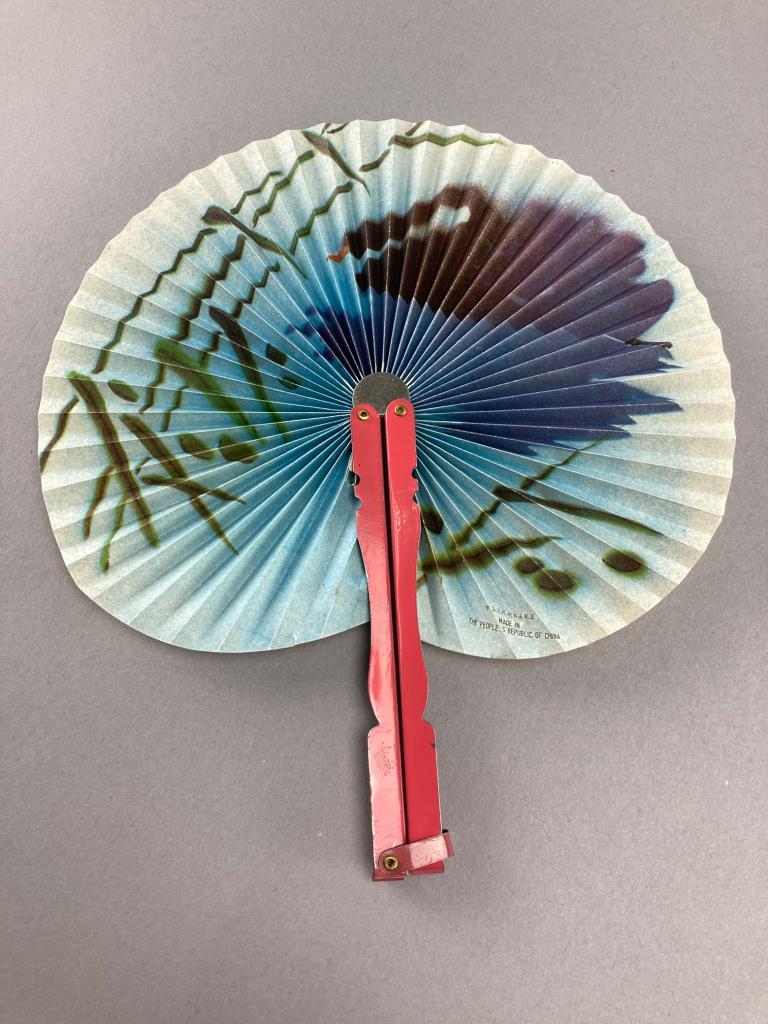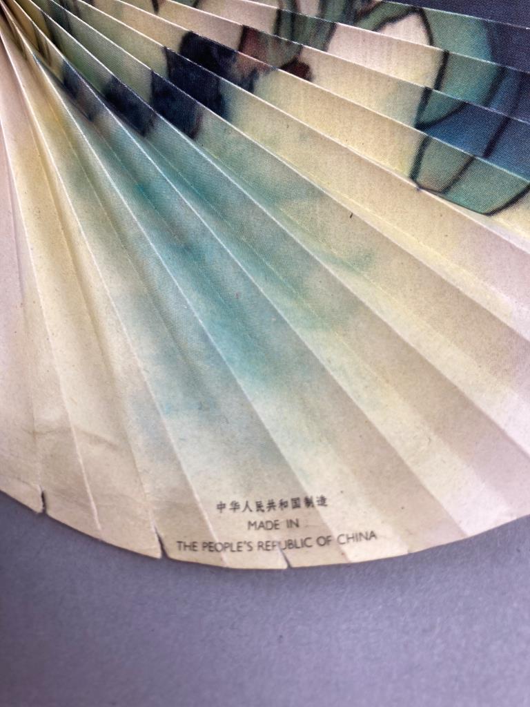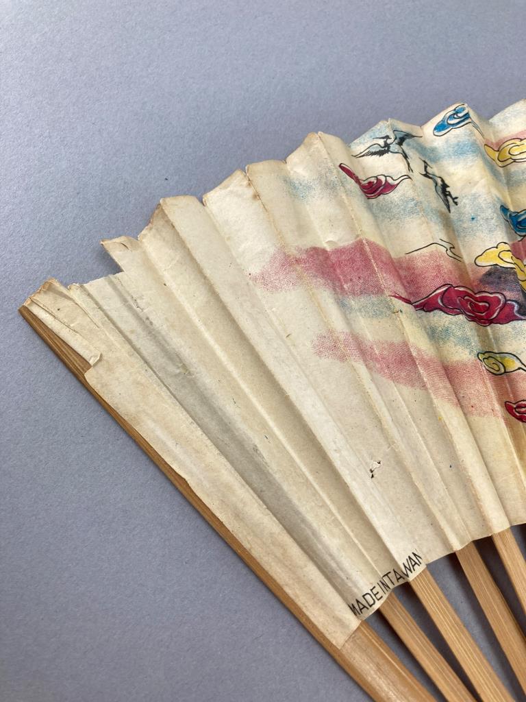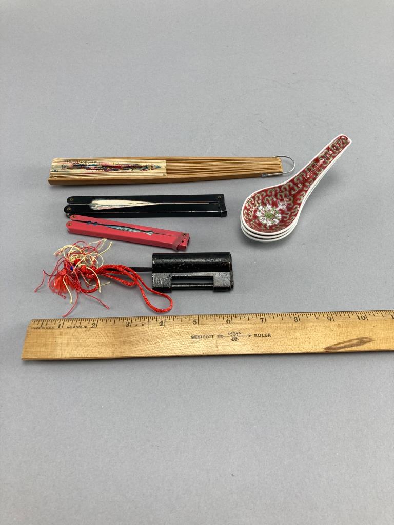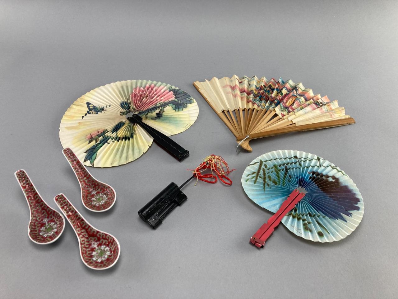 Includes three hand fans marked ‘Made in People’s Republic of China’ and ‘Made in Taiwan,’ three red ceramic spoons marked ‘Made in China,’ and a black metal Chinese lock with decorative red and gold string.