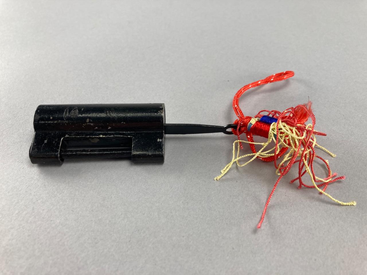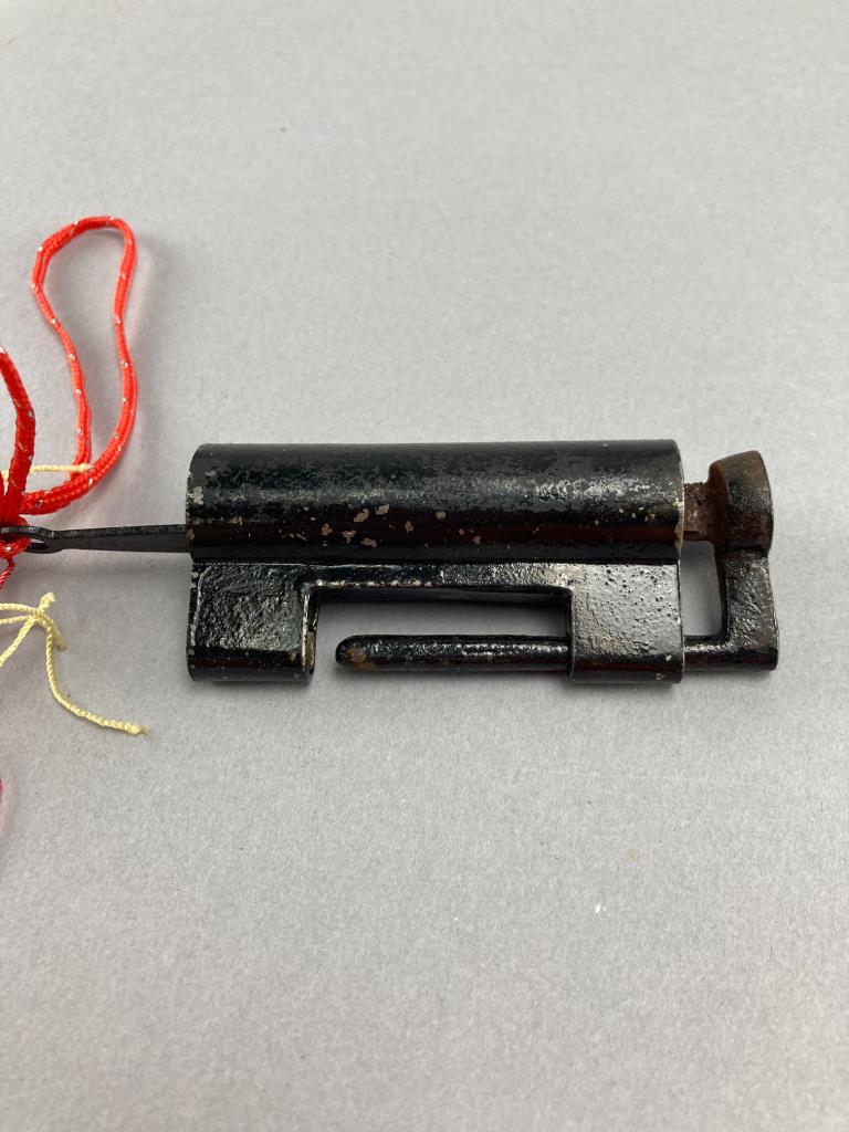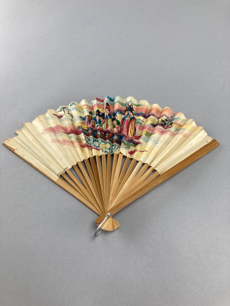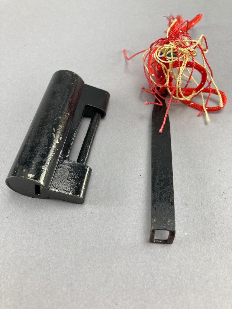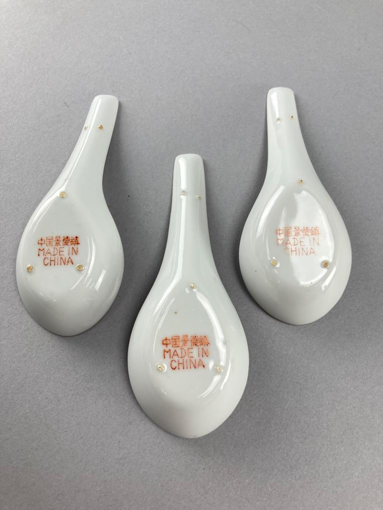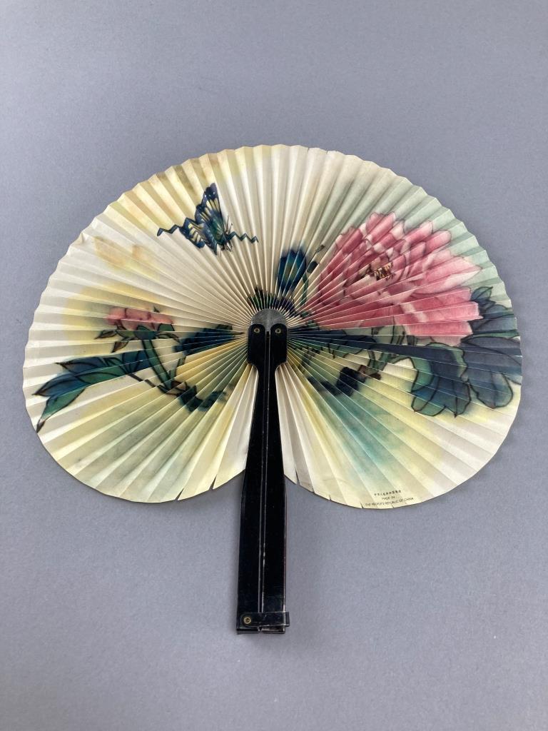 Includes three hand fans marked ‘Made in People’s Republic of China’ and ‘Made in Taiwan,’ three red ceramic spoons marked ‘Made in China,’ and a black metal Chinese lock with decorative red and gold string.