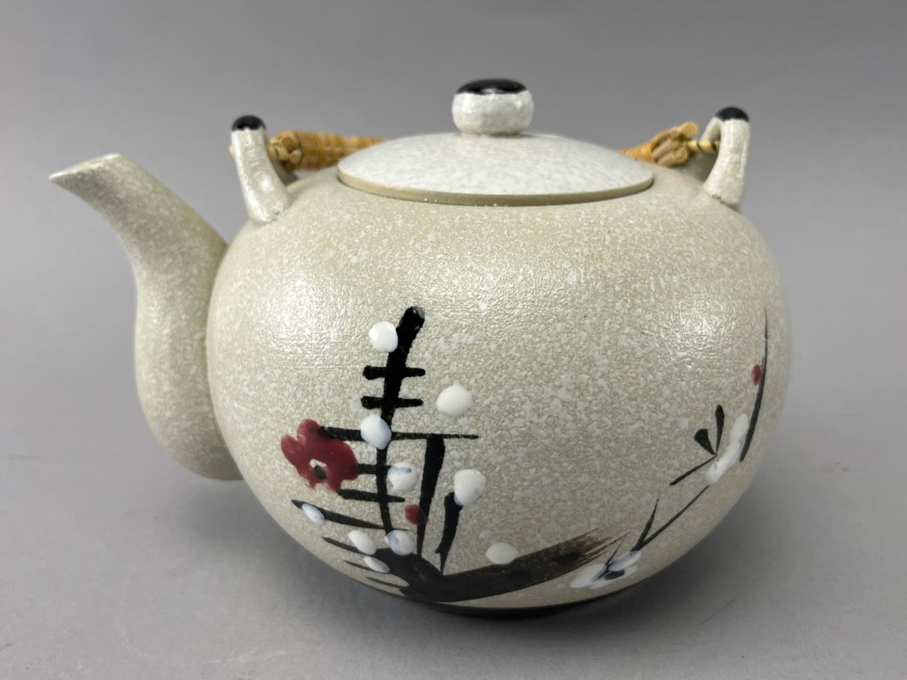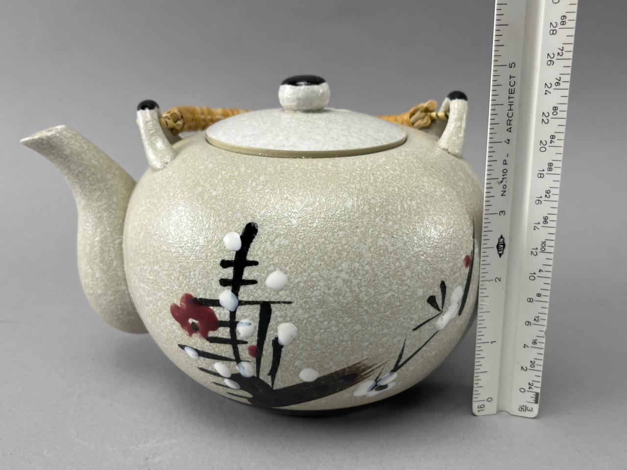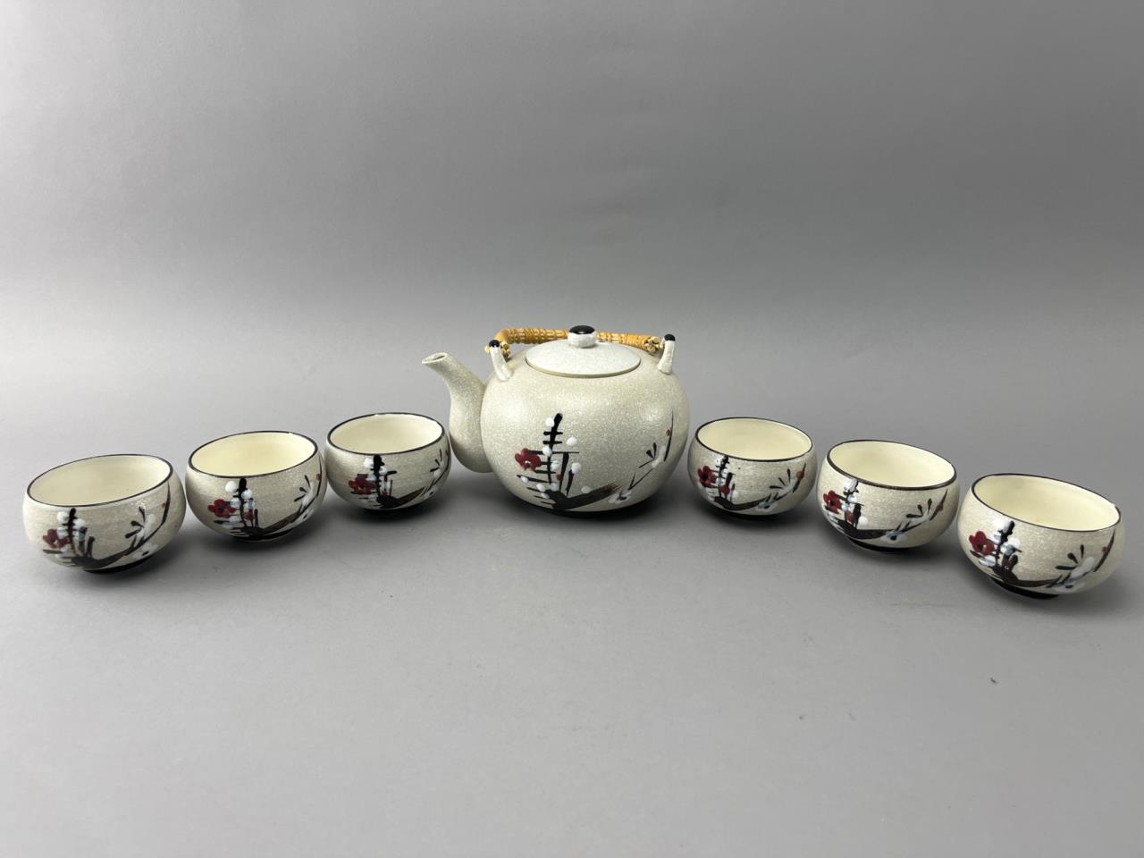 Porcelain tea set featuring a teapot with a woven handle and six matching cups. Decorated with floral and branch motifs on a textured light beige surface.
