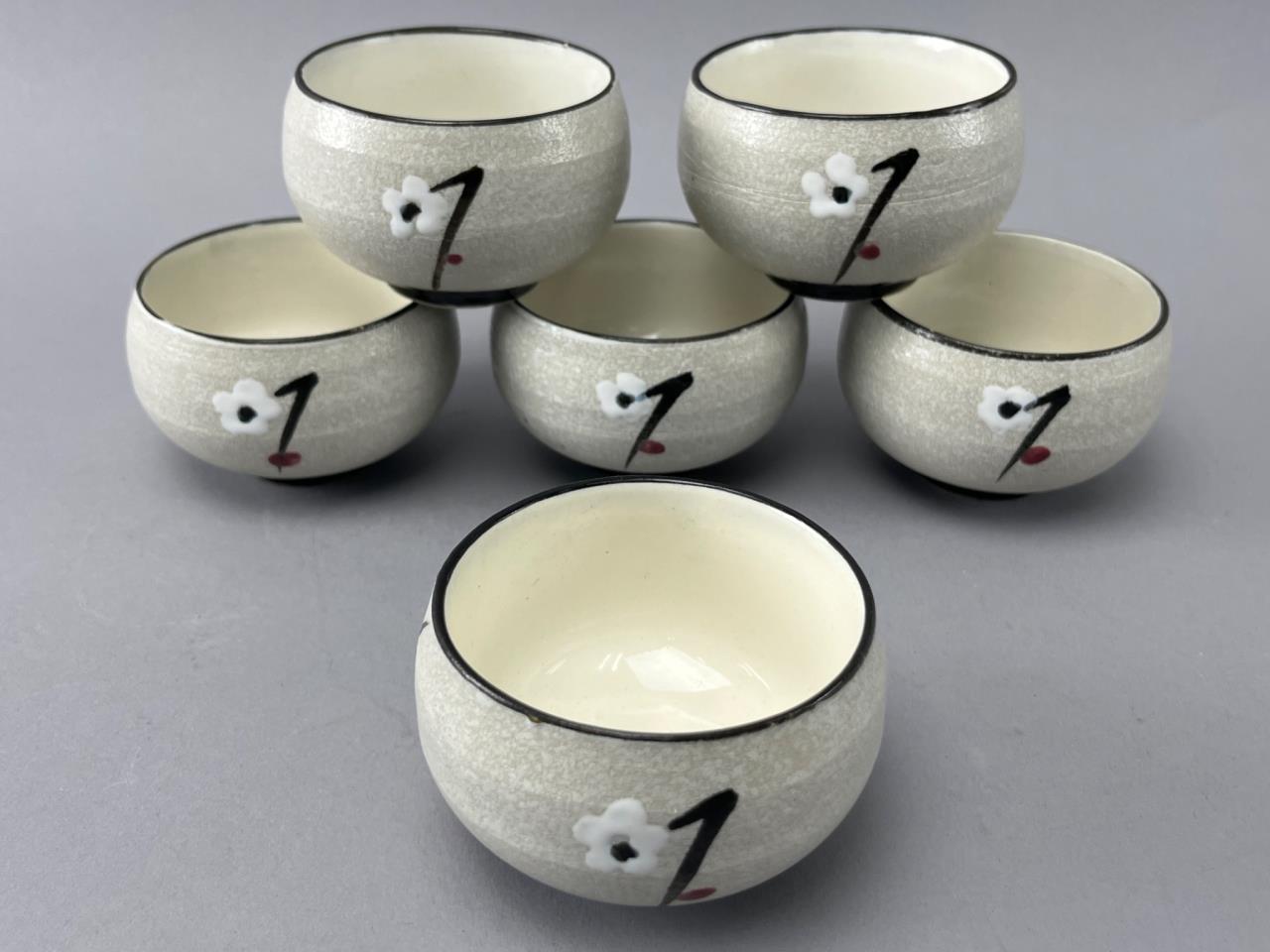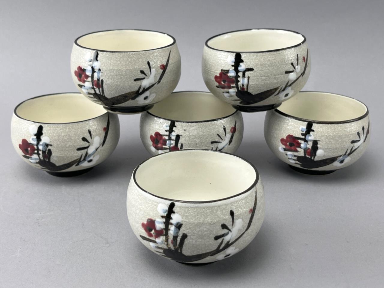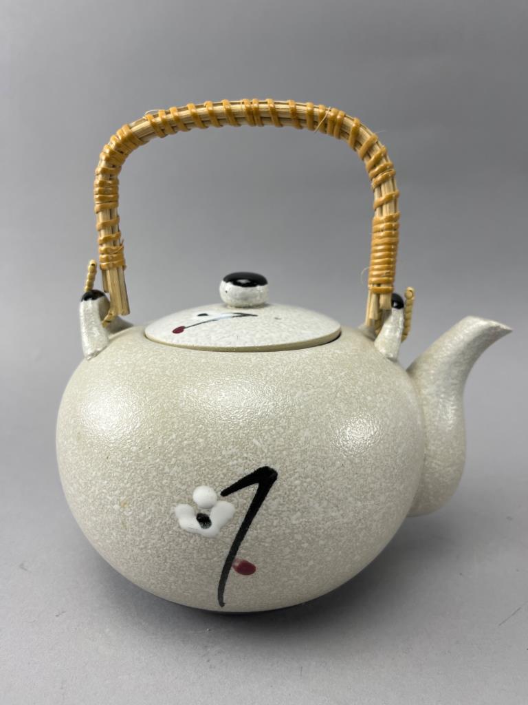 Porcelain tea set featuring a teapot with a woven handle and six matching cups. Decorated with floral and branch motifs on a textured light beige surface.