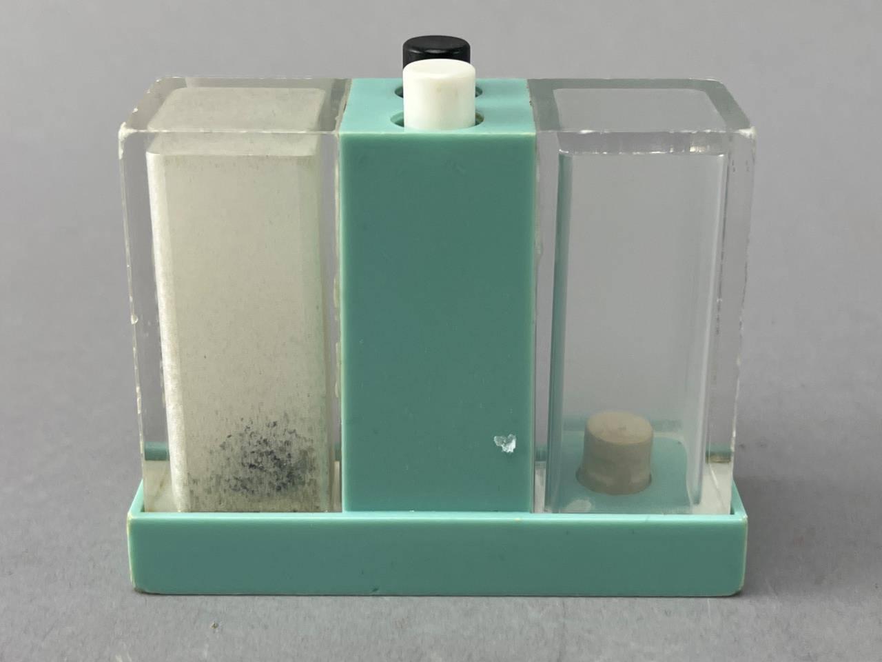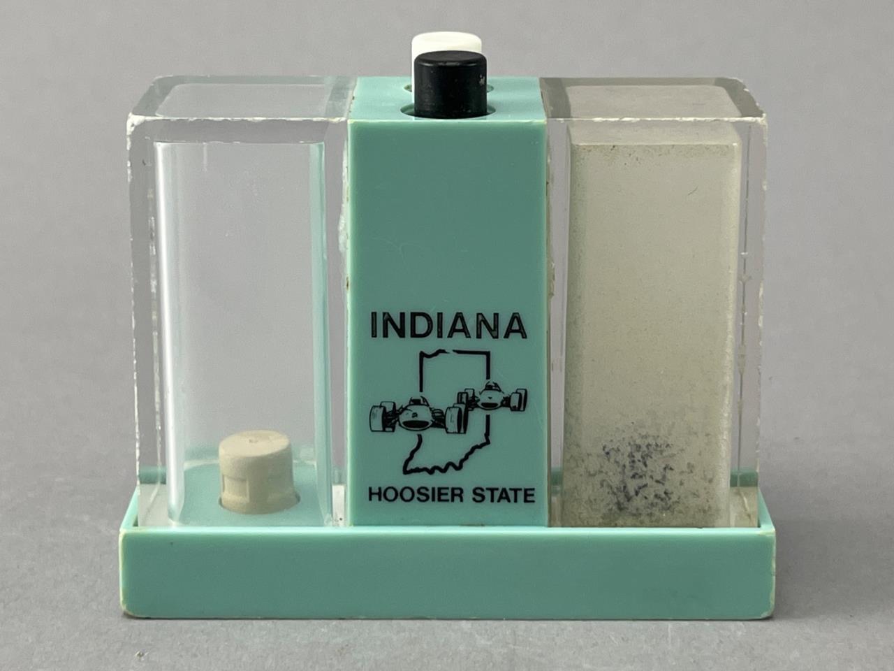 Vintage plastic salt and pepper shaker set with ‘Indiana Hoosier State’ text and graphics. The set includes two clear compartments with removable stoppers and a central teal section with a push-button mechanism.