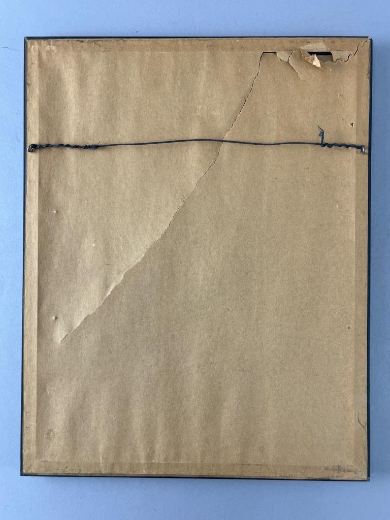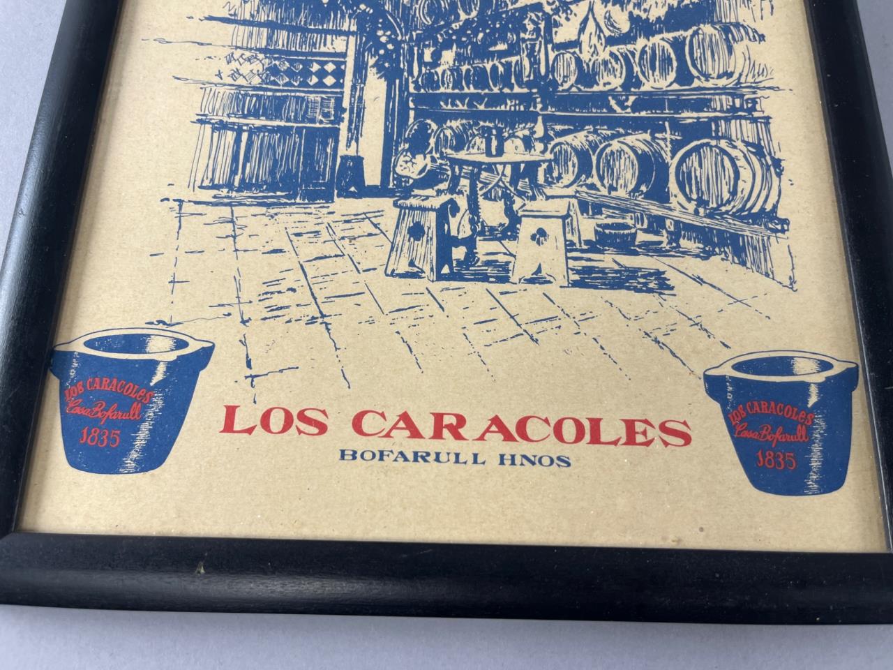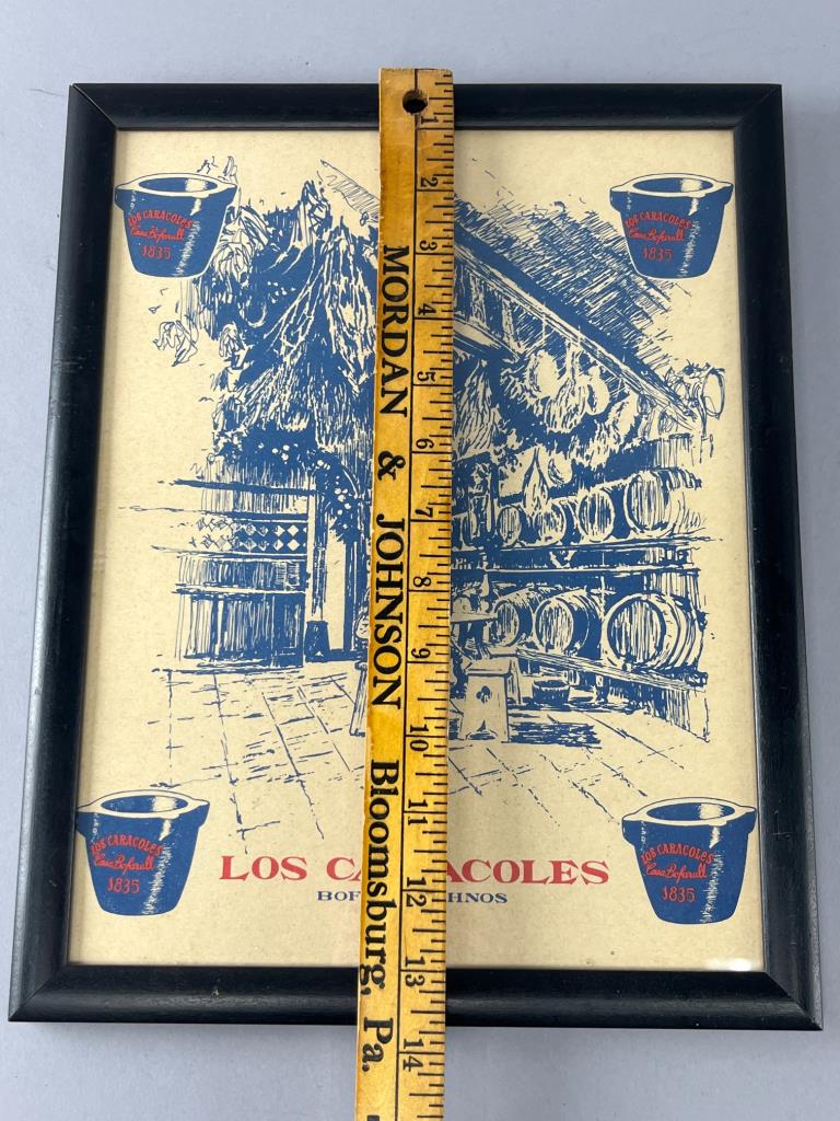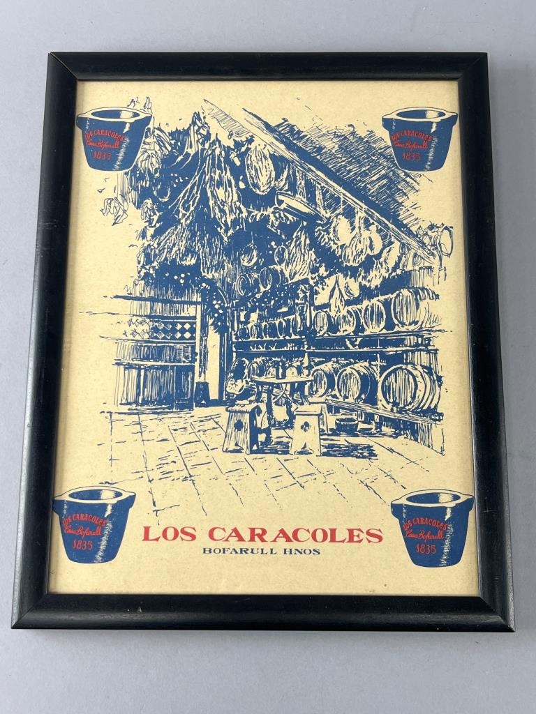 Framed print featuring artwork of Los Caracoles Winery Restaurant. Shows a stylized interior with barrels and decor. Black frame with paper backing; tear on back visible in photos. Hooks and wire for hanging included.