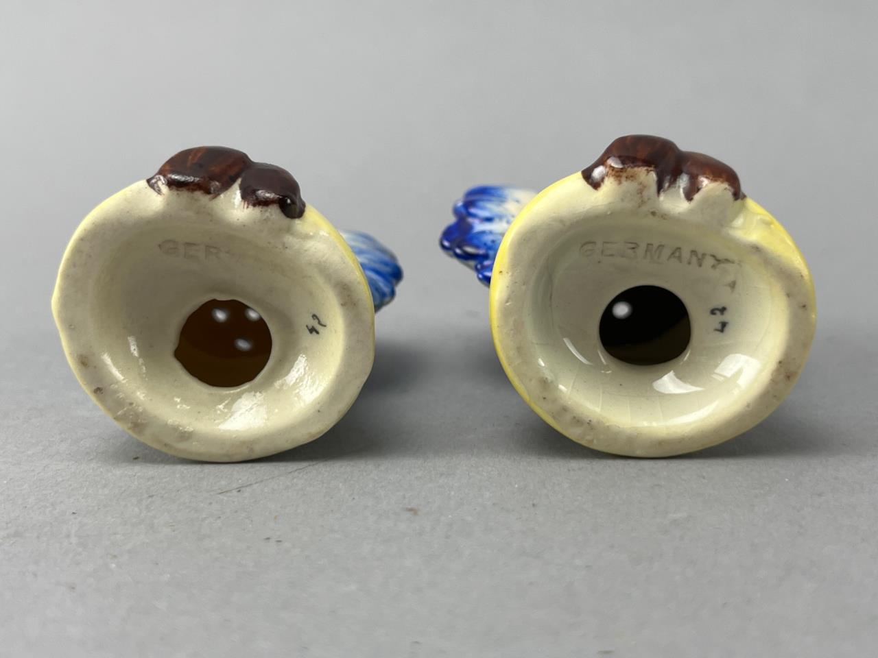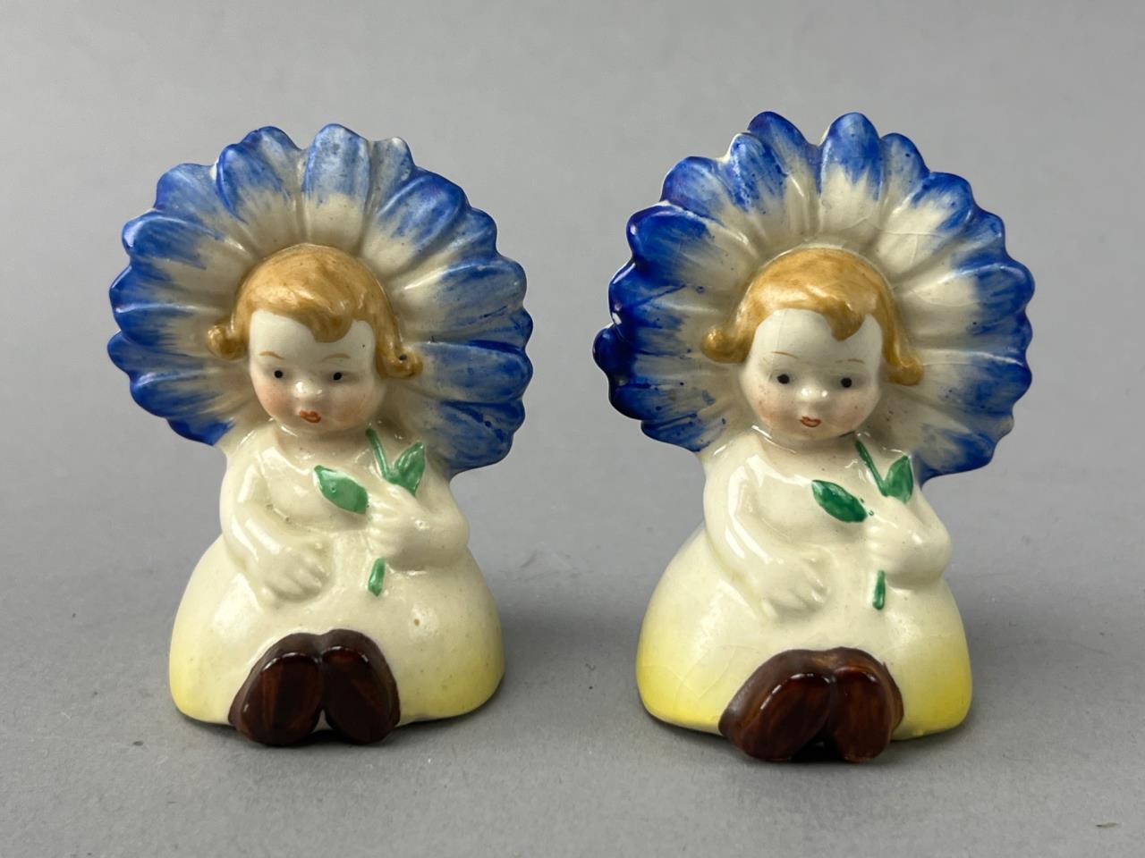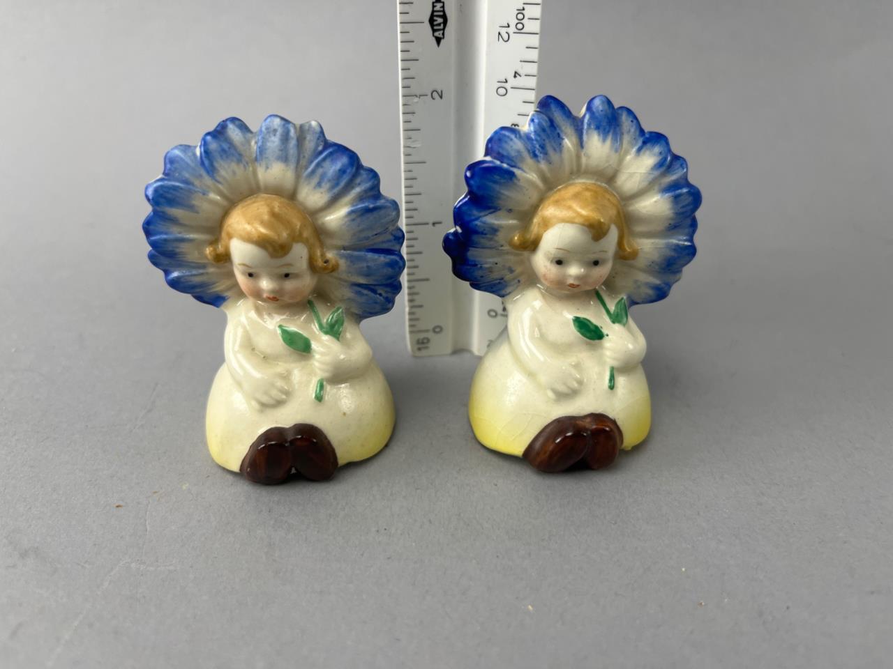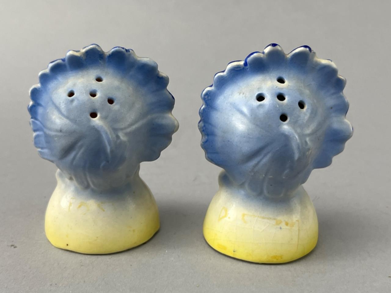 Ceramic figural salt and pepper shakers marked ‘Germany’ on the underside. Each features a seated figure with a blue floral-shaped headdress and painted details. Stoppers not included.