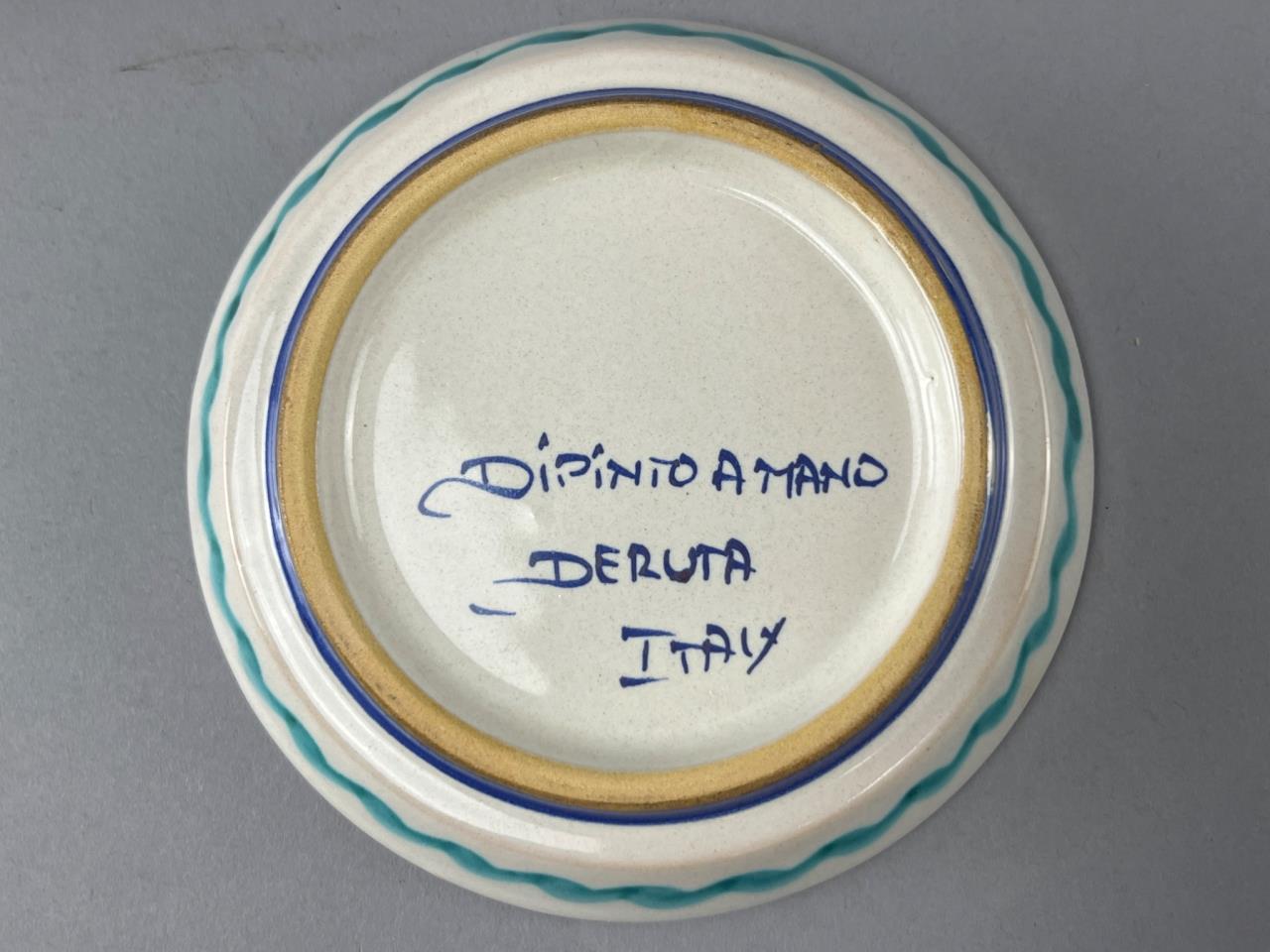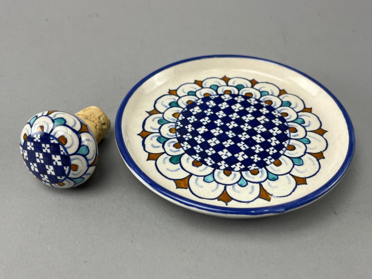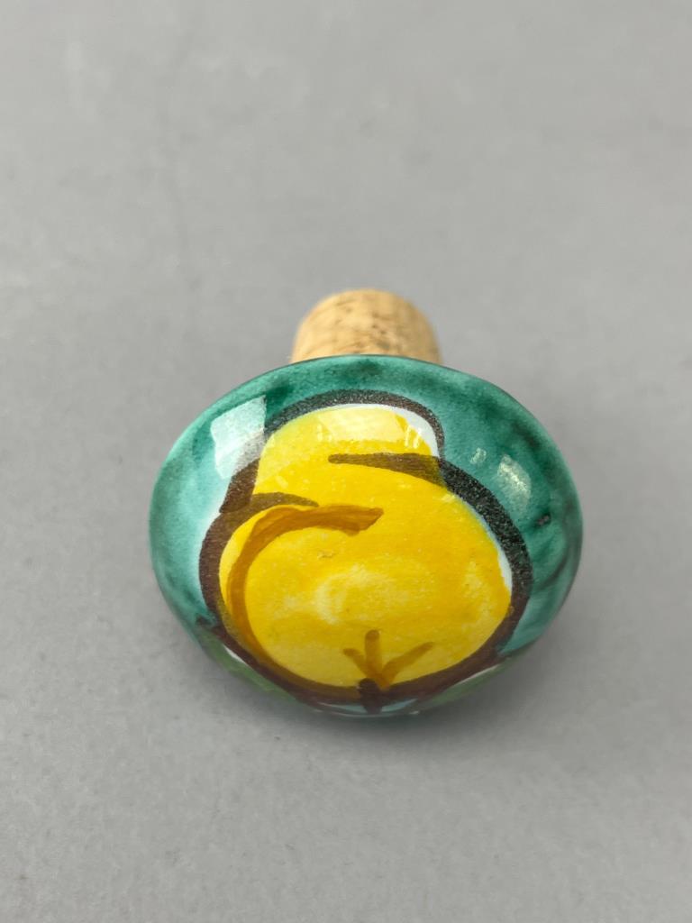 A small blue-and-white floral motif pottery jar, a ceramic cork stopper with yellow fruit design, a ceramic cork stopper with blue geometric pattern, and a plate marked ‘Dipinto A Mano Deruta Italy’ on the underside.