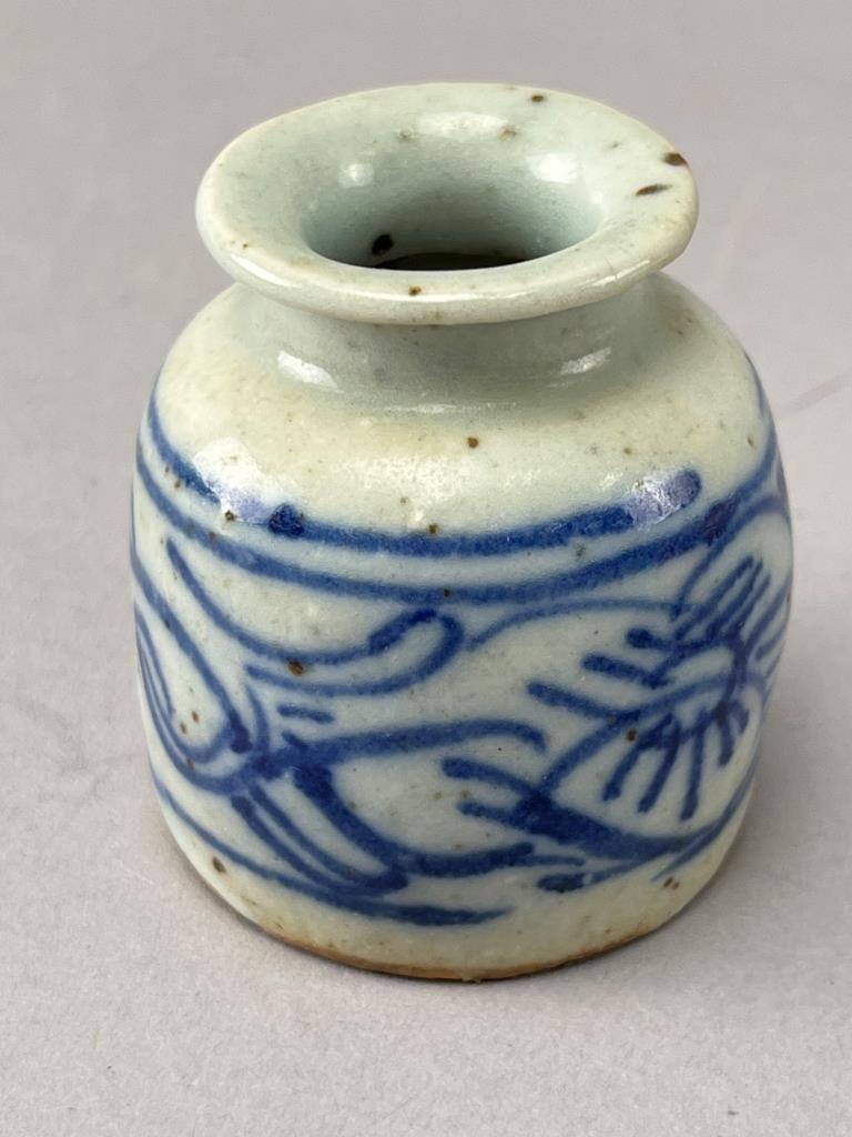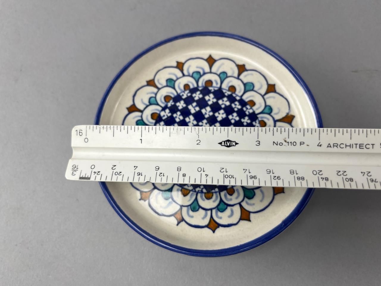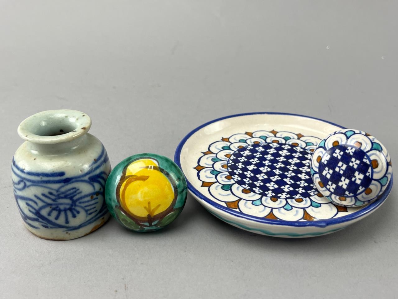 A small blue-and-white floral motif pottery jar, a ceramic cork stopper with yellow fruit design, a ceramic cork stopper with blue geometric pattern, and a plate marked ‘Dipinto A Mano Deruta Italy’ on the underside.