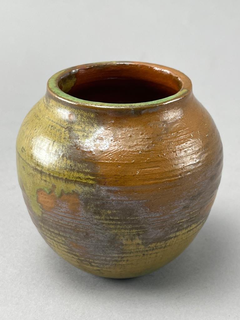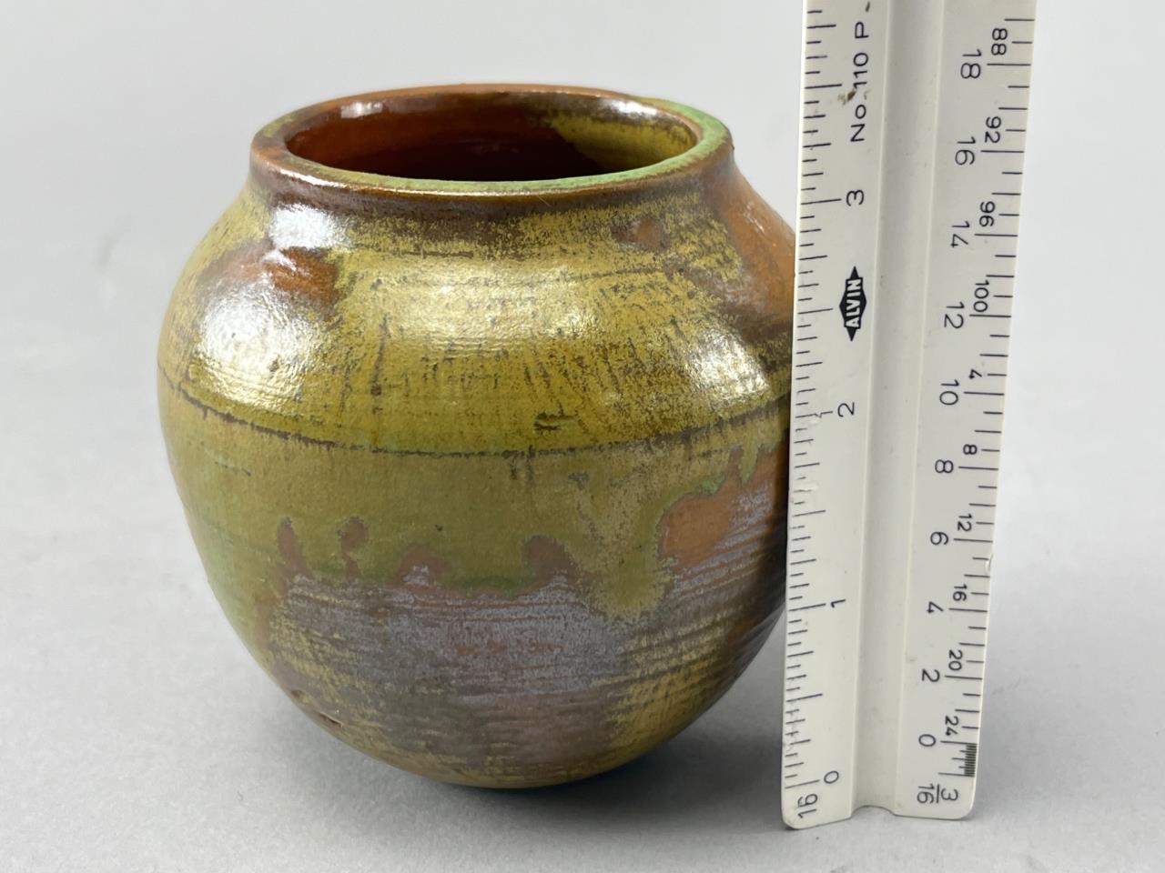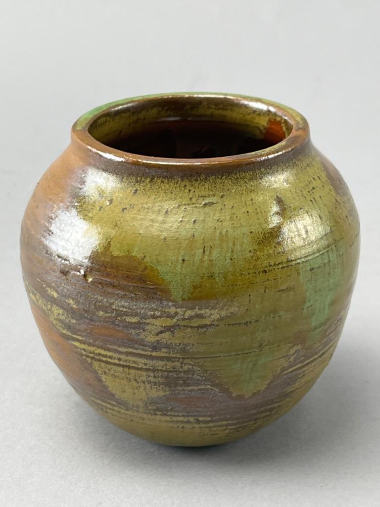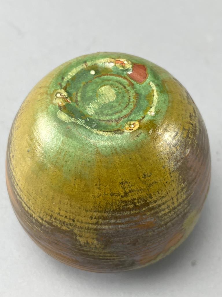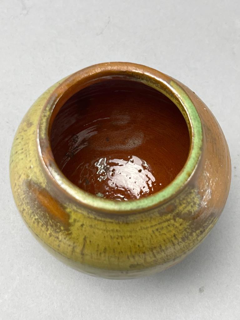 Round ceramic vase featuring a glossy glaze in green, gold, and brown earth tones. The interior is finished with a reddish-brown glaze. Base exhibits a unique swirl pattern.