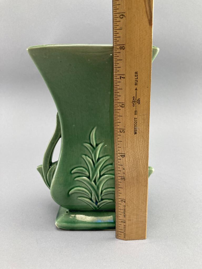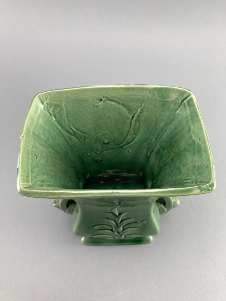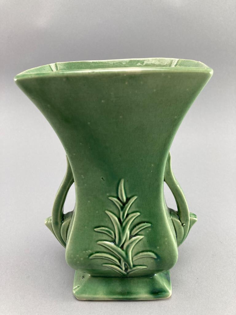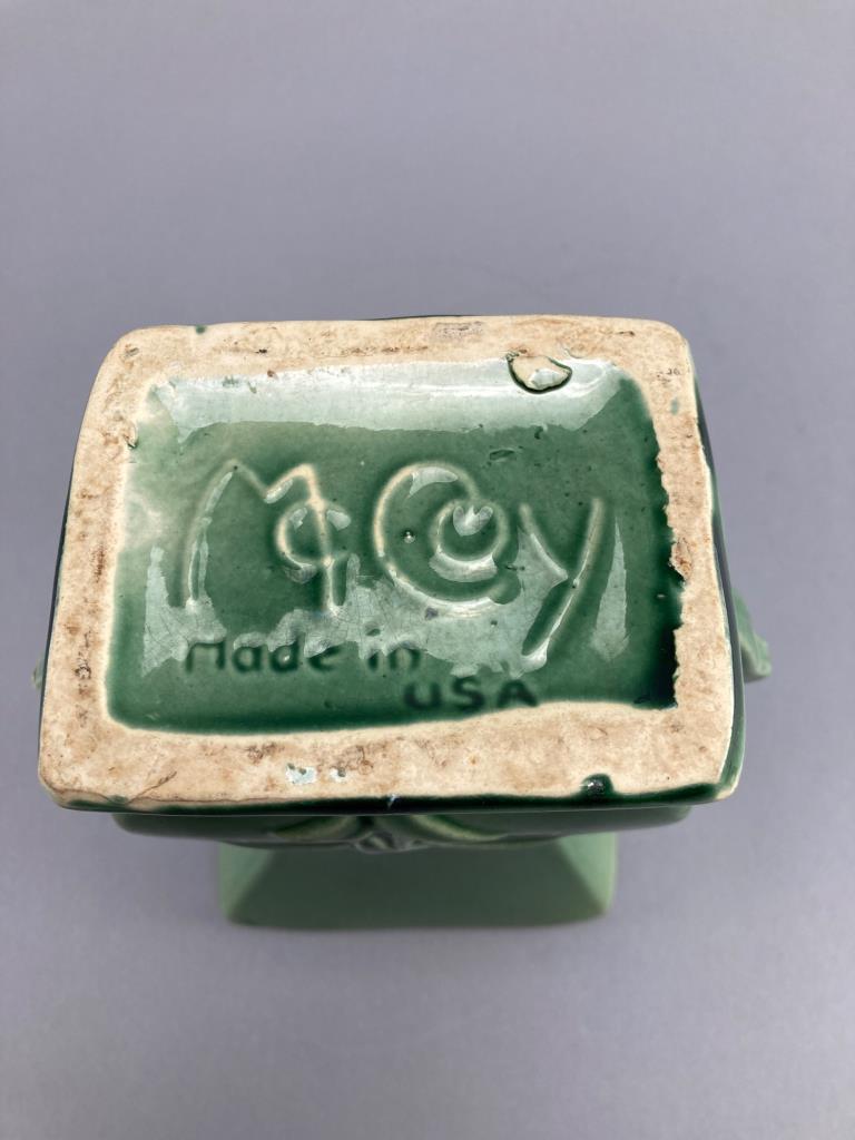 Green ceramic vase by McCoy, USA. Features a square lip, tapered body, and a nature-inspired relief design with curved handles. Marked ‘McCoy, Made in USA’ on the underside. Minor surface wear noted.
