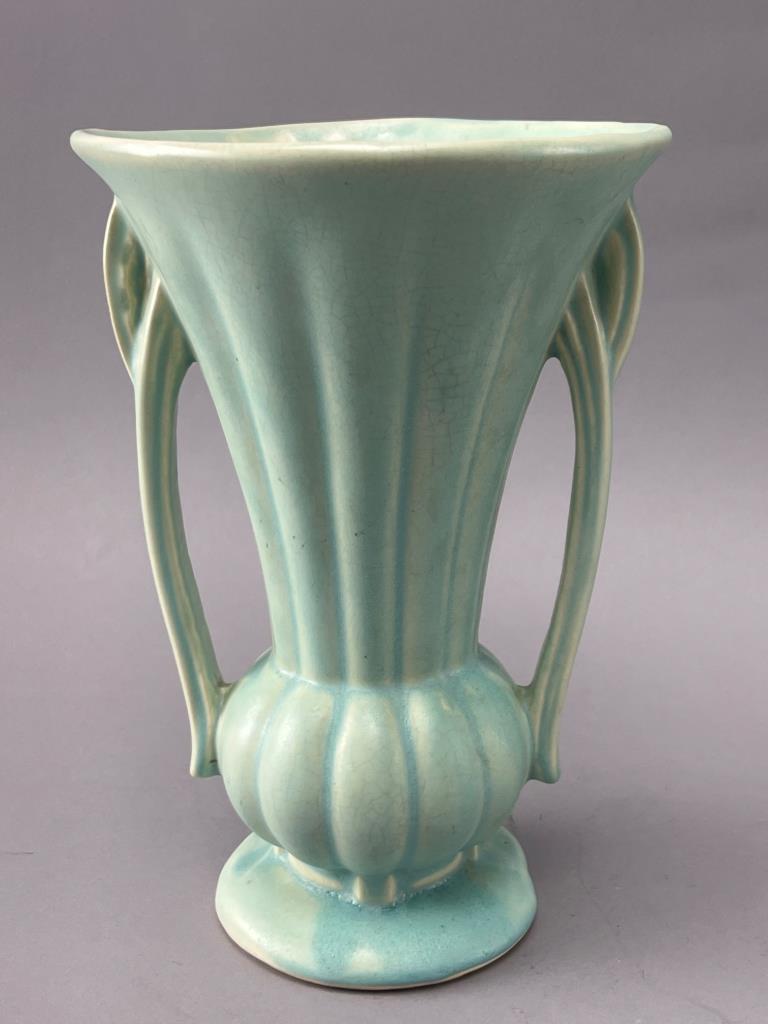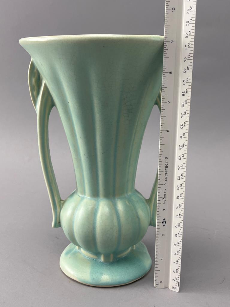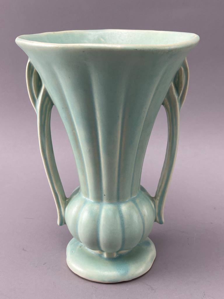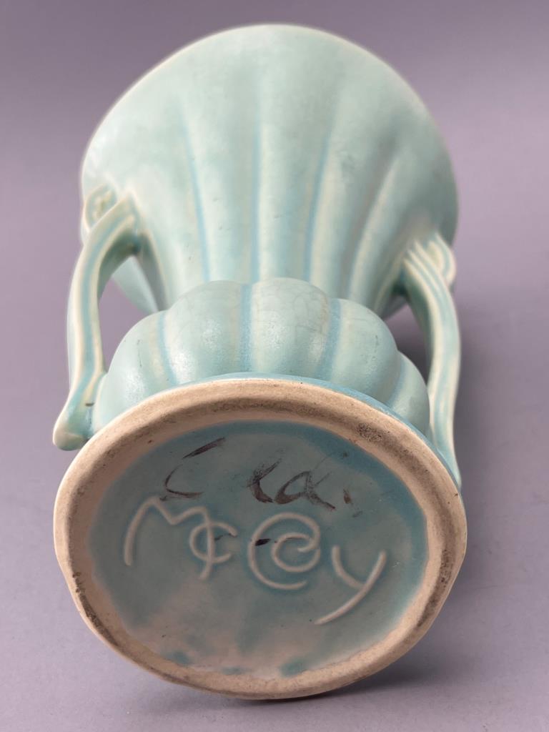 McCoy ceramic vase in a matte aqua glaze featuring double handles and fluted design. Marked ‘McCoy’ on the underside. Small imperfections typical of production noted.