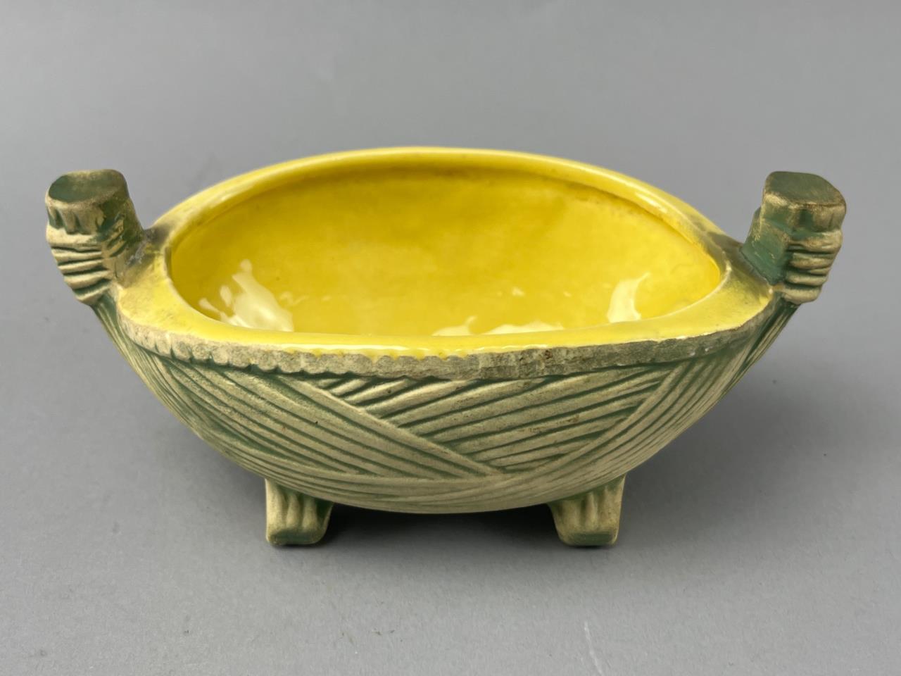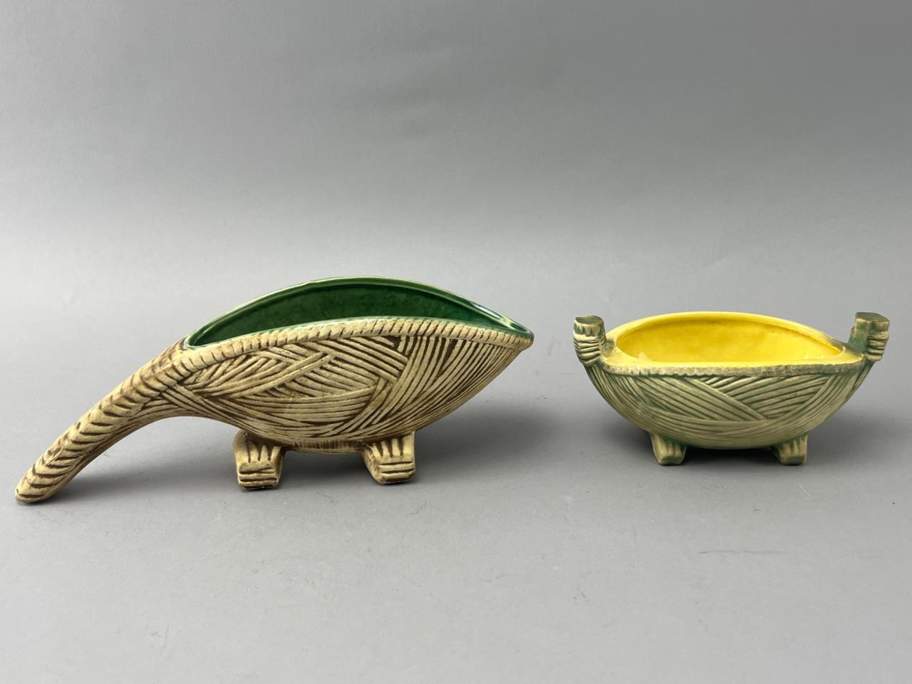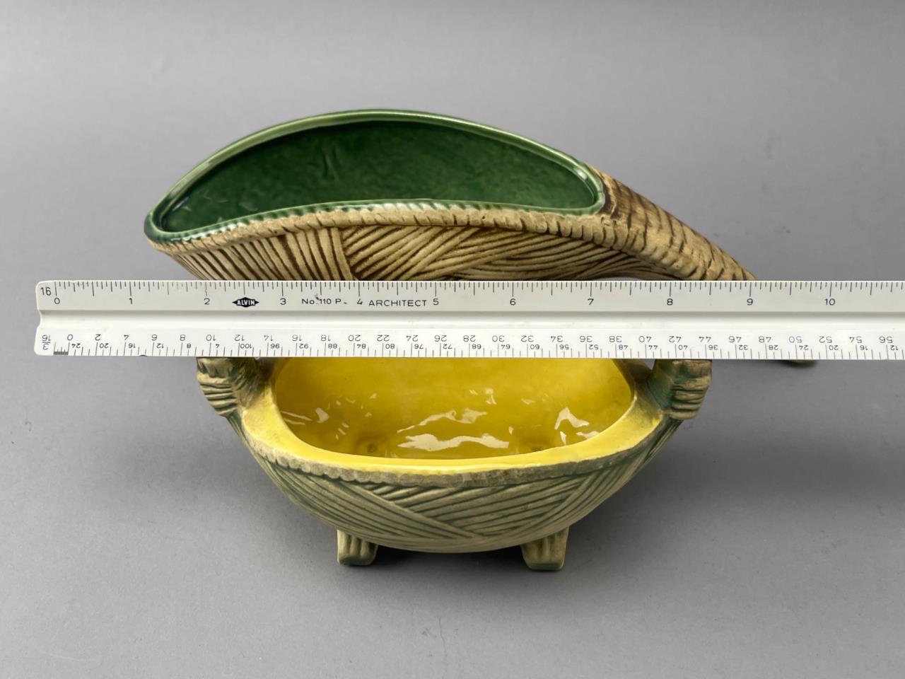 Two McCoy pottery planters with a textured pattern resembling woven rattan. One is leaf-shaped with a green glazed interior, and the other is bowl-shaped with a yellow glazed interior and two handles. Marked ‘McCoy USA’ on the bases.