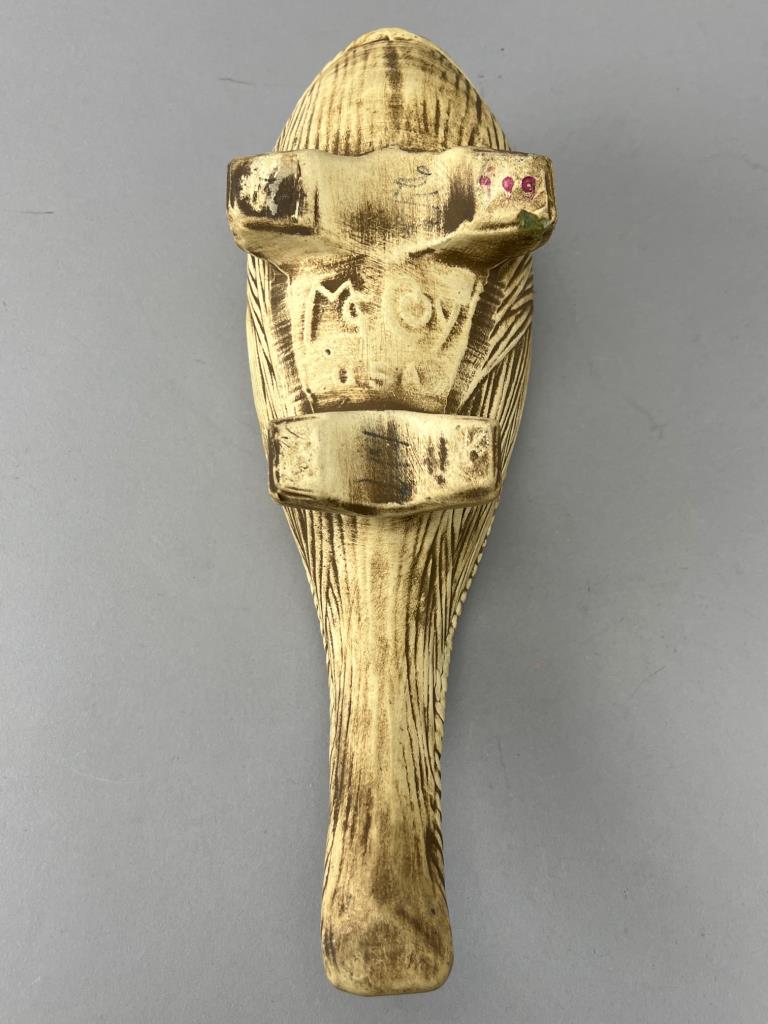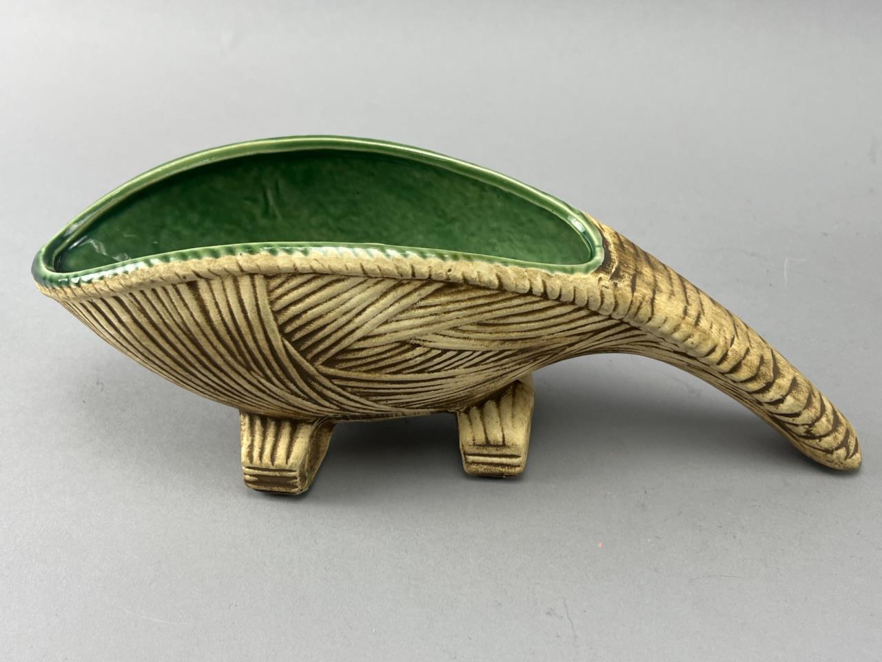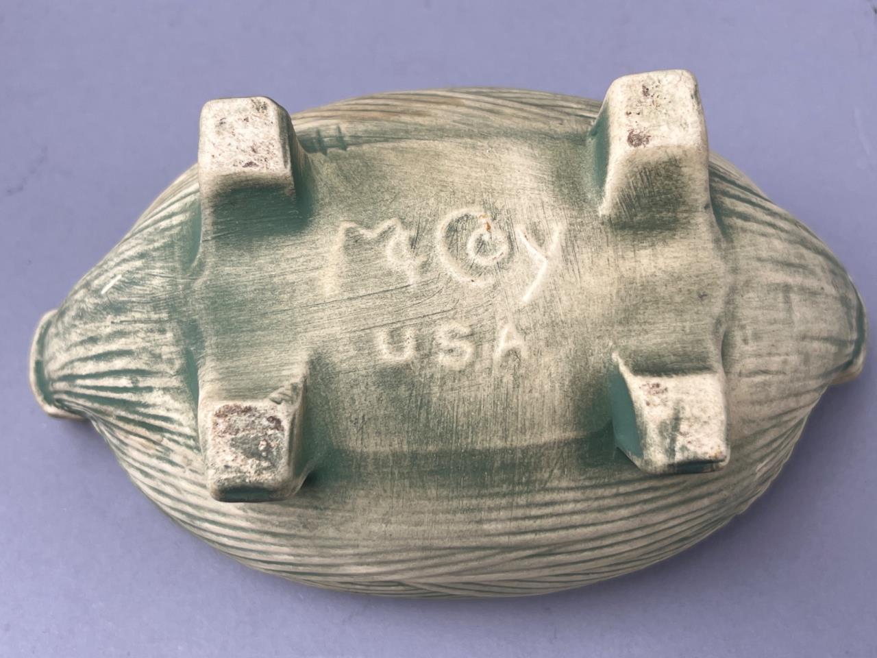 Two McCoy pottery planters with a textured pattern resembling woven rattan. One is leaf-shaped with a green glazed interior, and the other is bowl-shaped with a yellow glazed interior and two handles. Marked ‘McCoy USA’ on the bases.