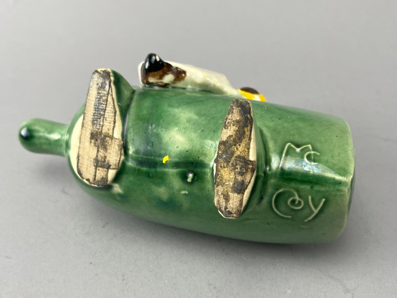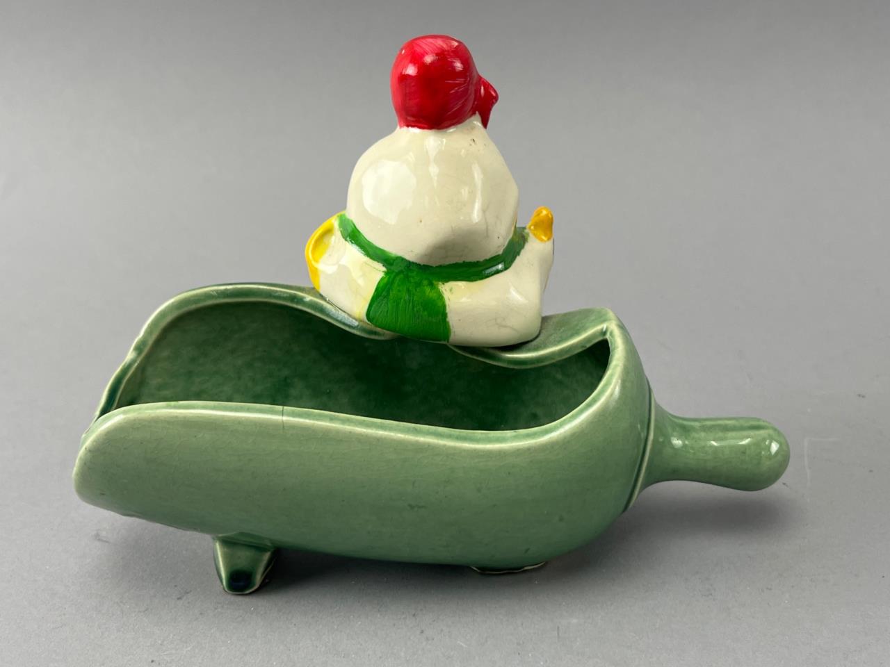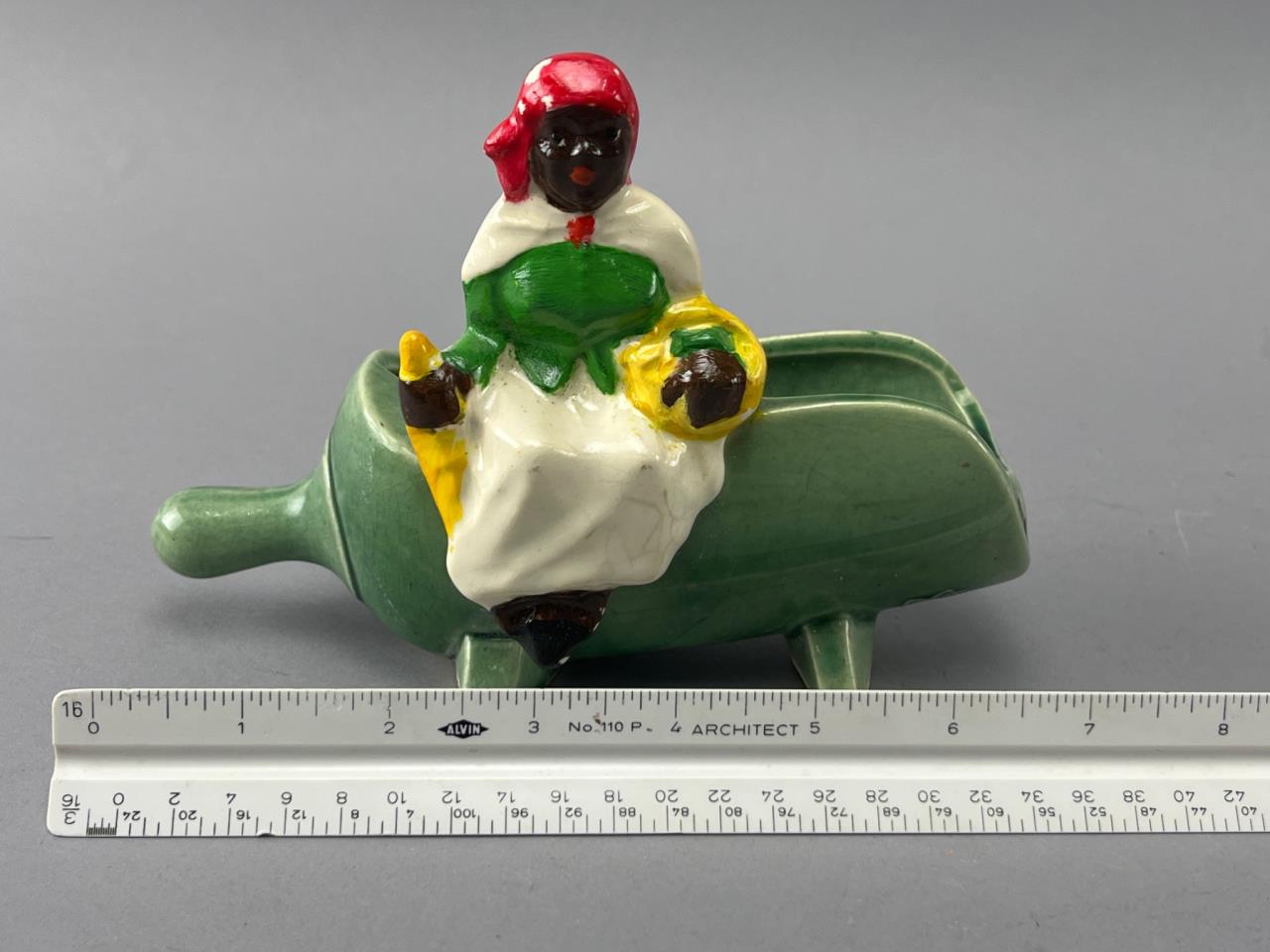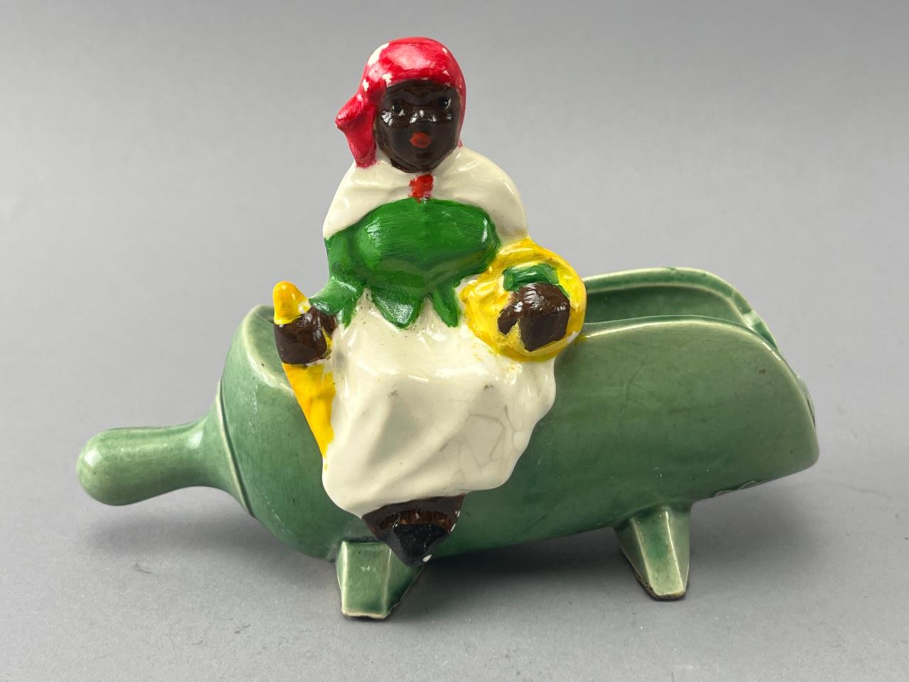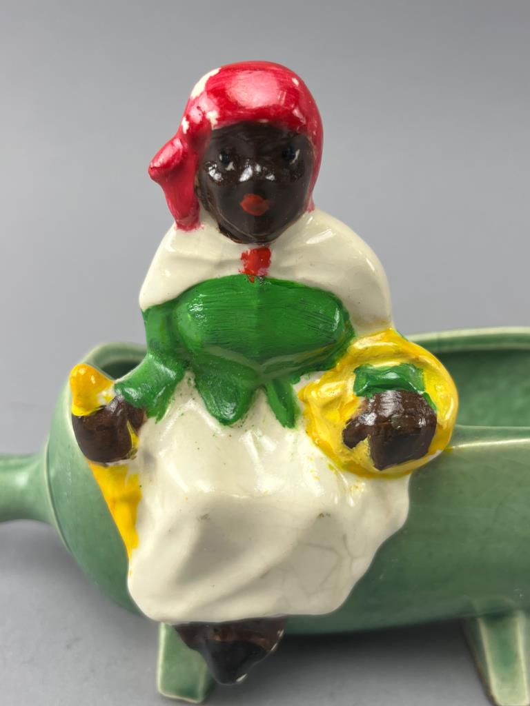 Ceramic McCoy planter designed as a green flour scoop with a Mammy figure in colorful attire seated on top. Embossed ‘McCoy’ on the underside. Notable paint wear on edges.