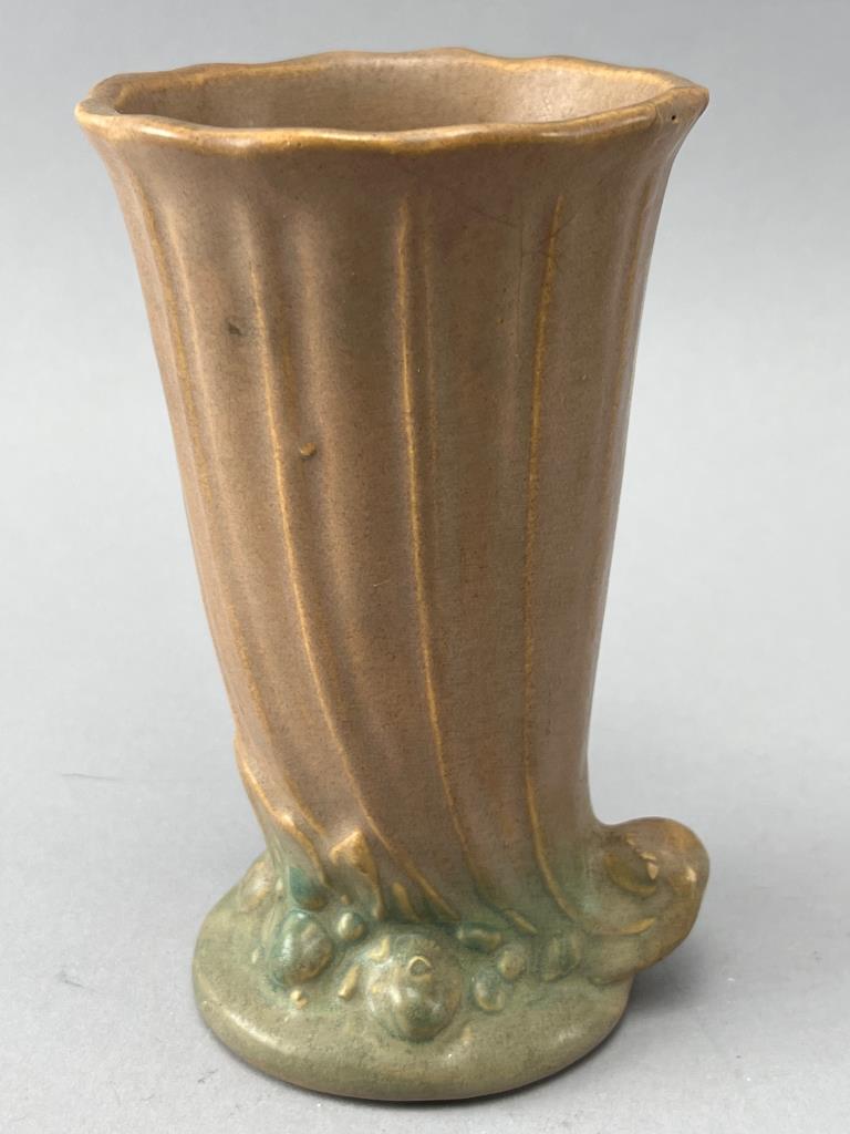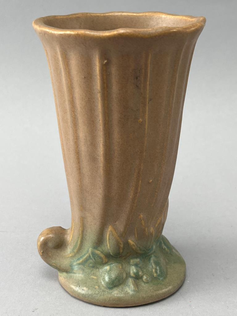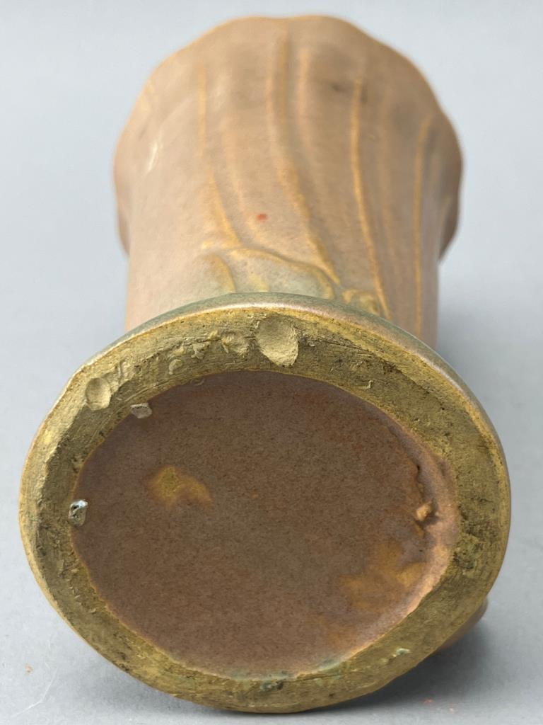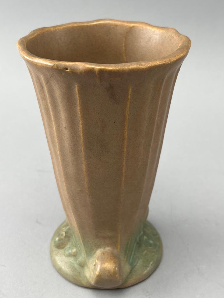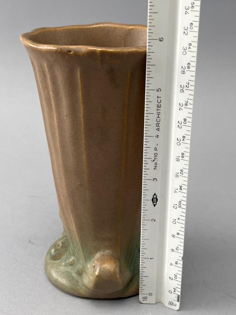 Ceramic vase featuring a fluted body with a scalloped rim, decorative base elements, and a brown glaze transitioning to green at the bottom. Minor chips visible on the base.