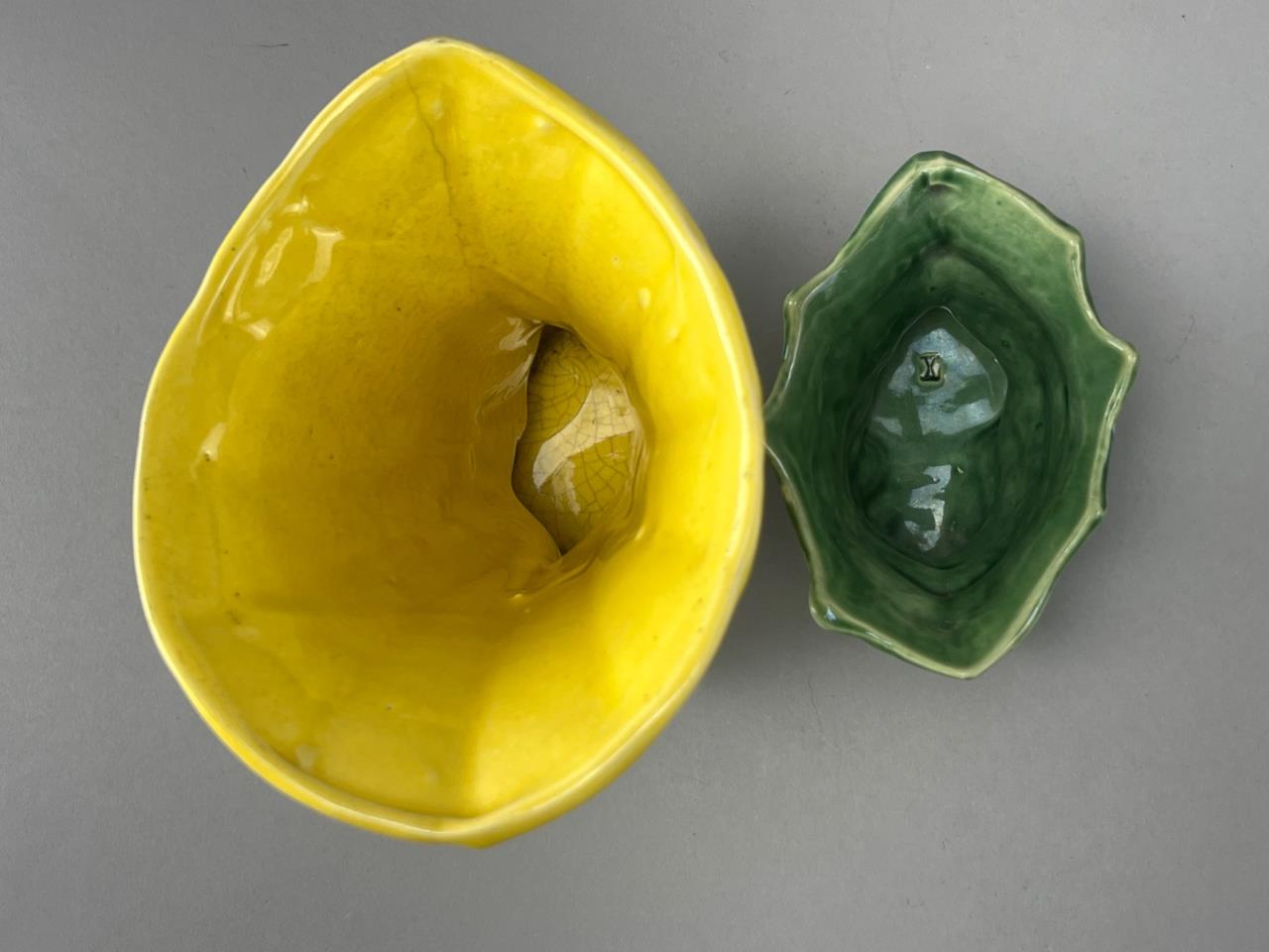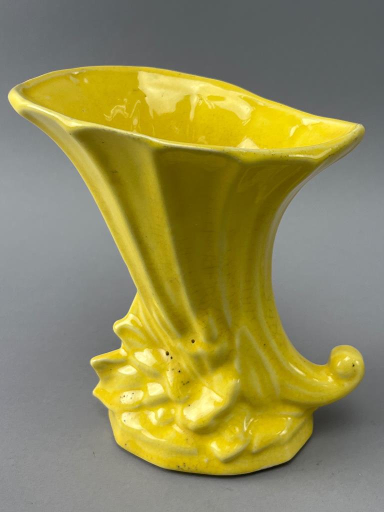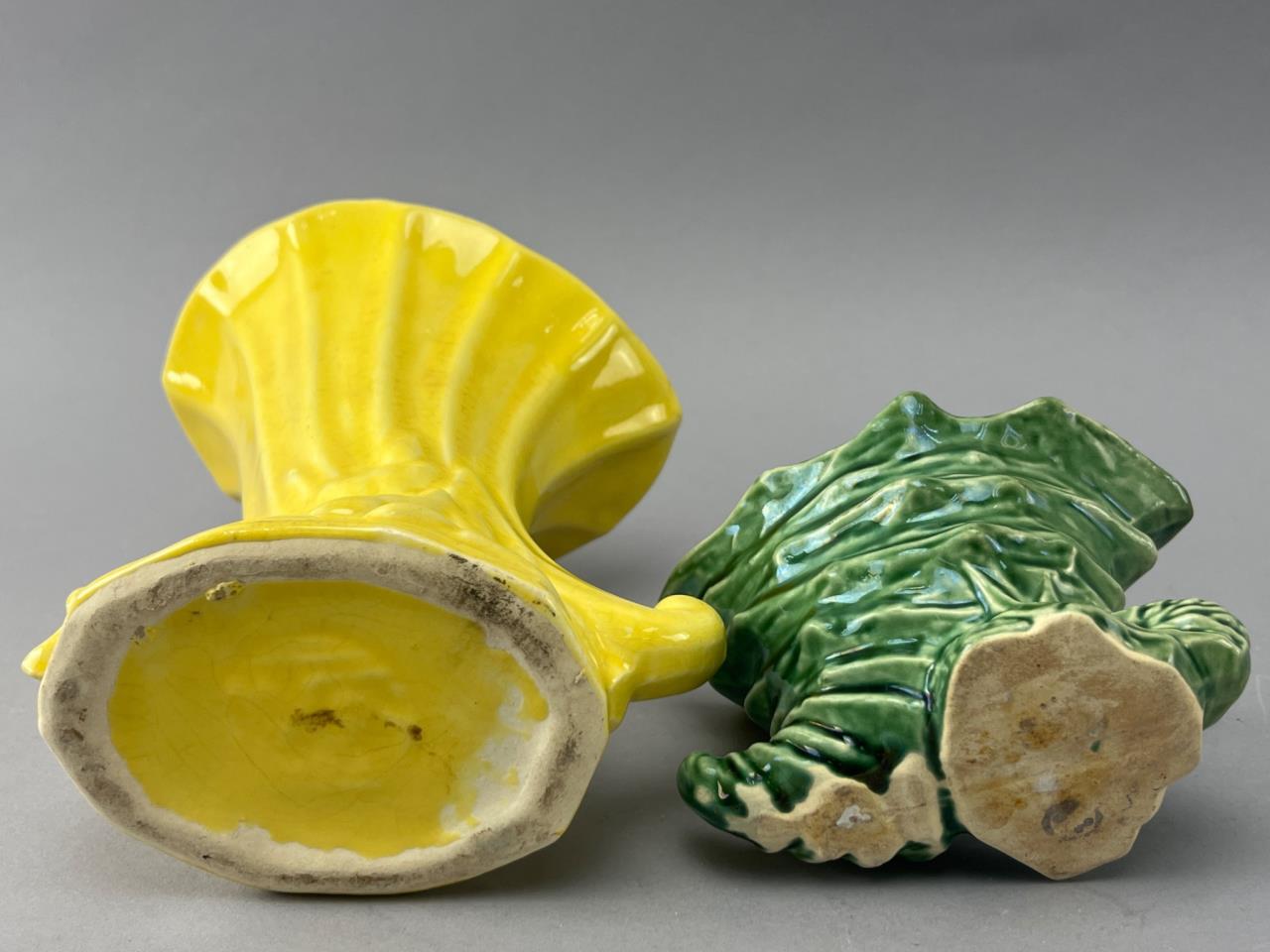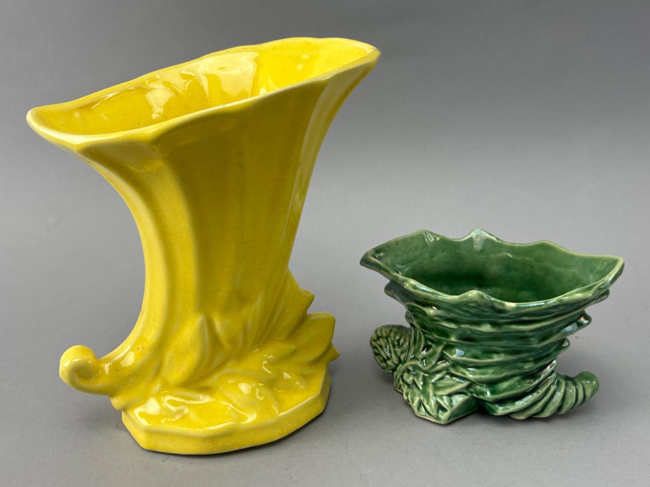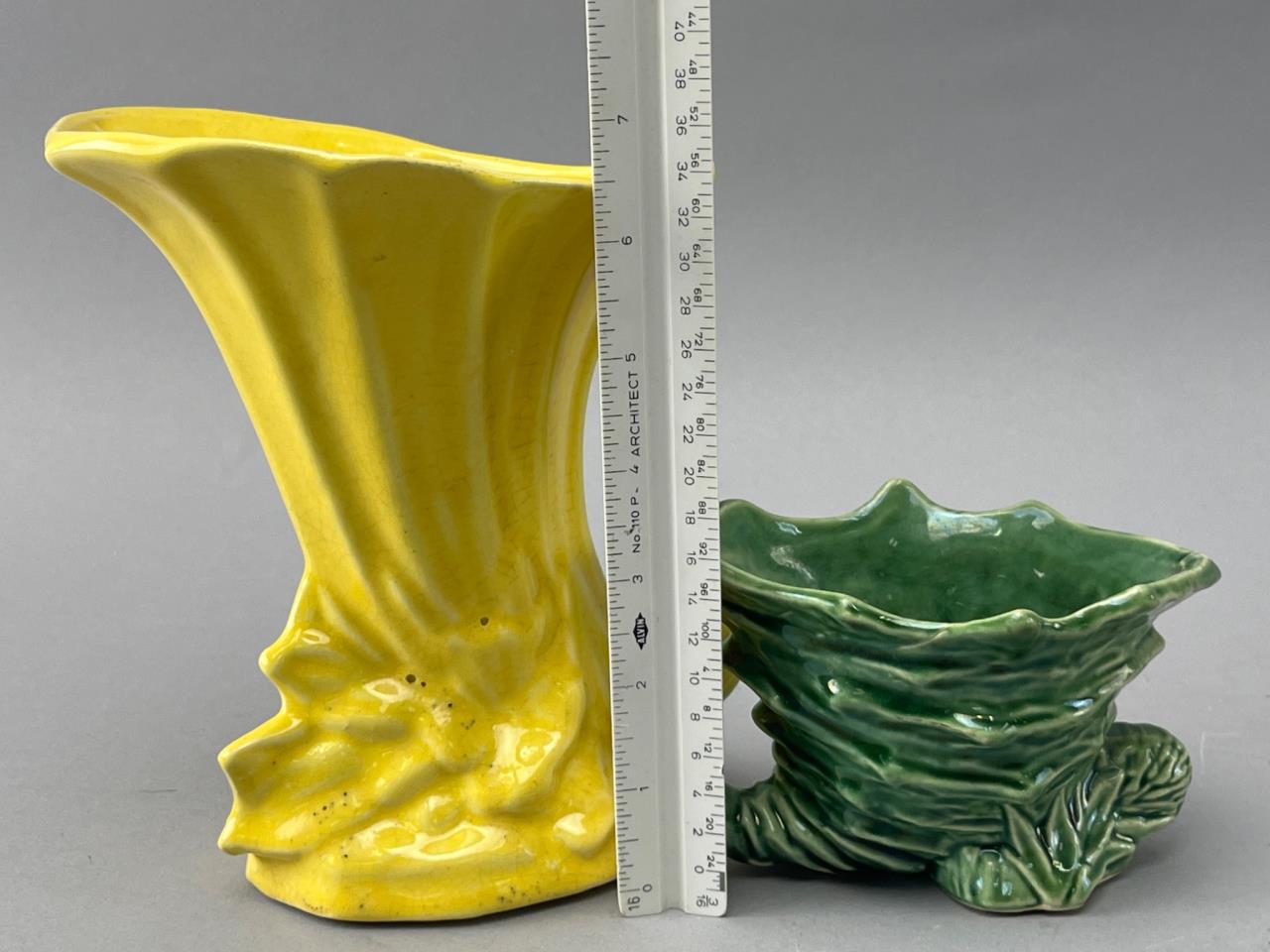 Includes a yellow ceramic vase with a shell-inspired design and a smaller green ceramic vase with a textured shell-like form. Both pieces feature decorative organic shapes and glazed finishes.