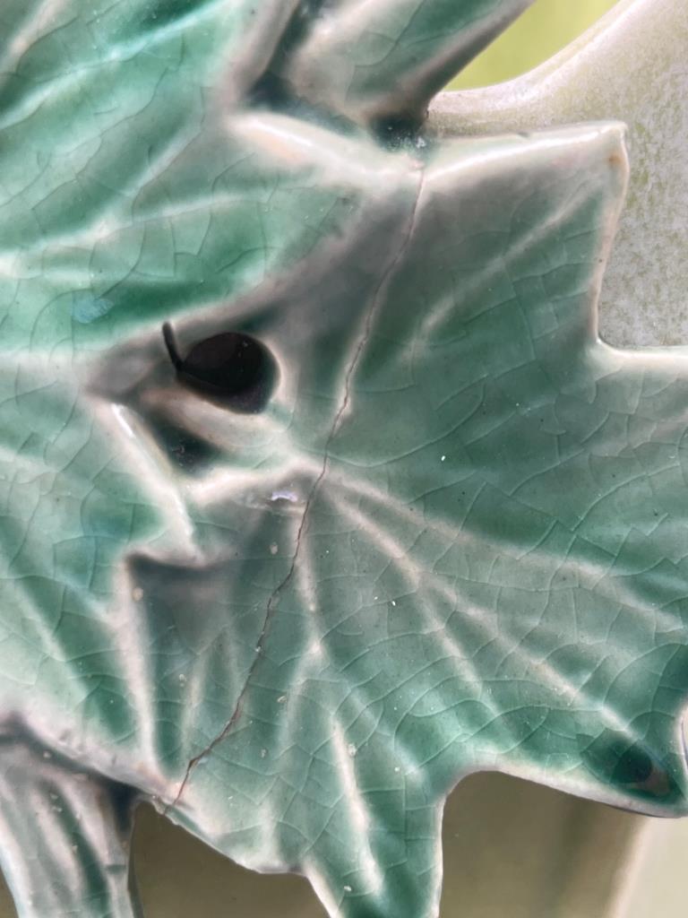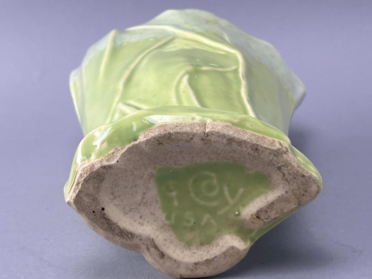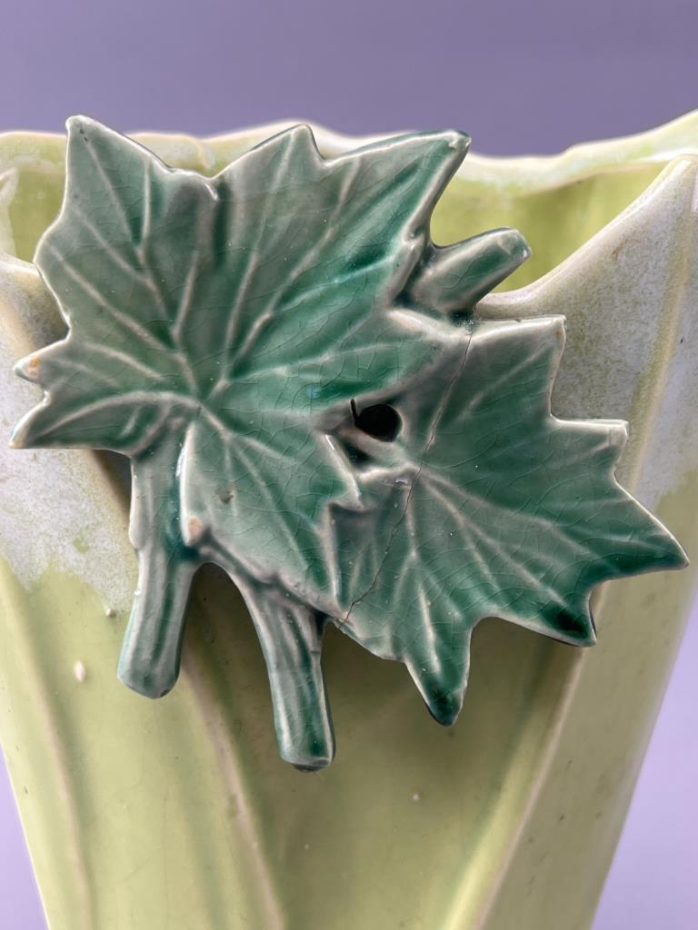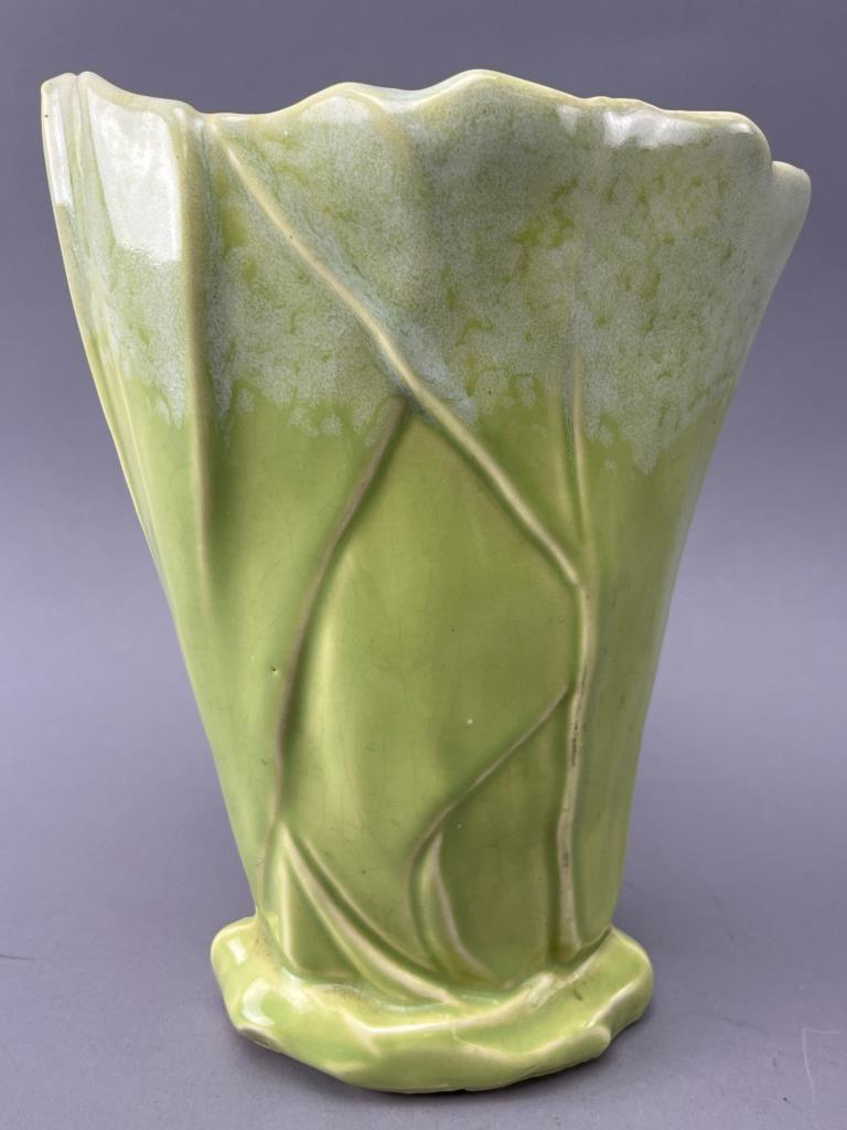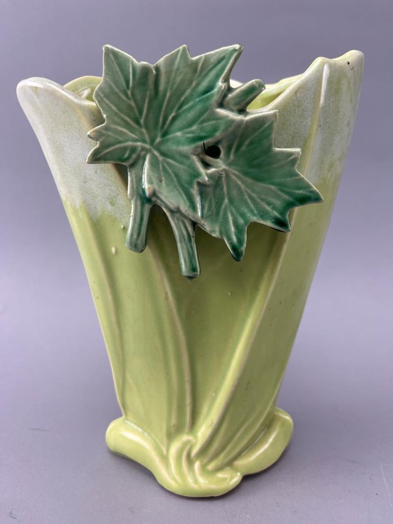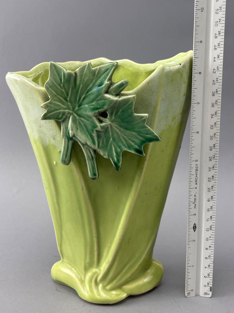 Green ceramic vase by McCoy featuring a raised leaf motif and undulating rim. Small crack visible on leaf detail. Base marked with ‘McCoy’ and ‘USA.’