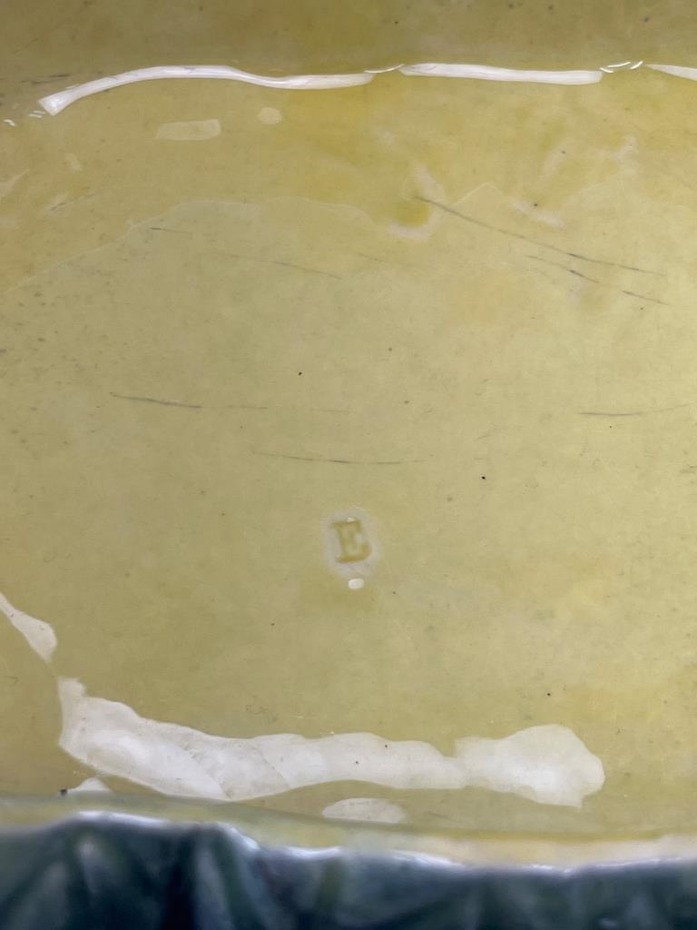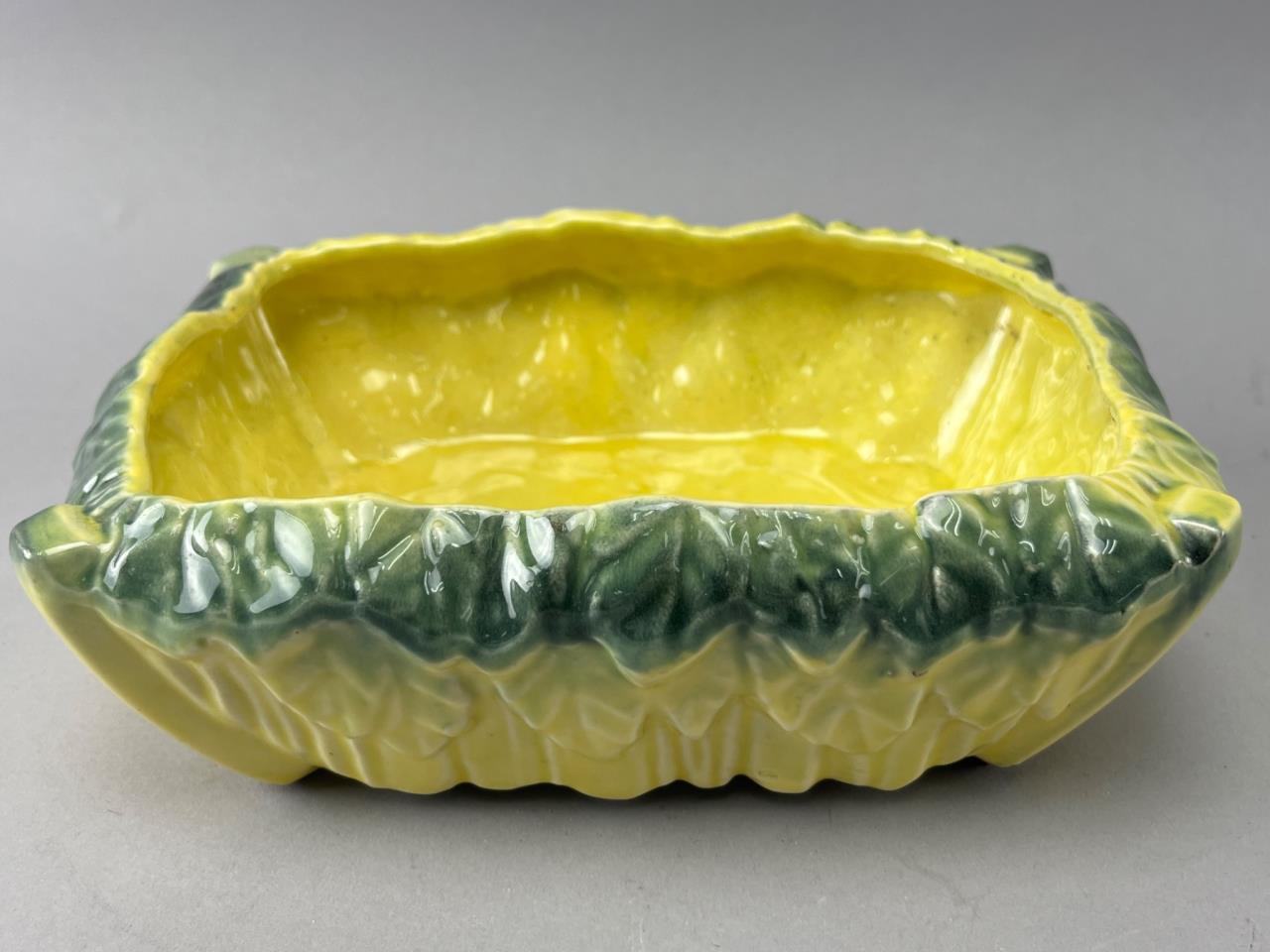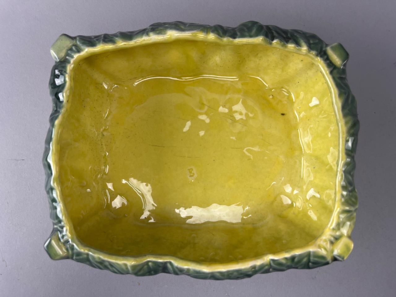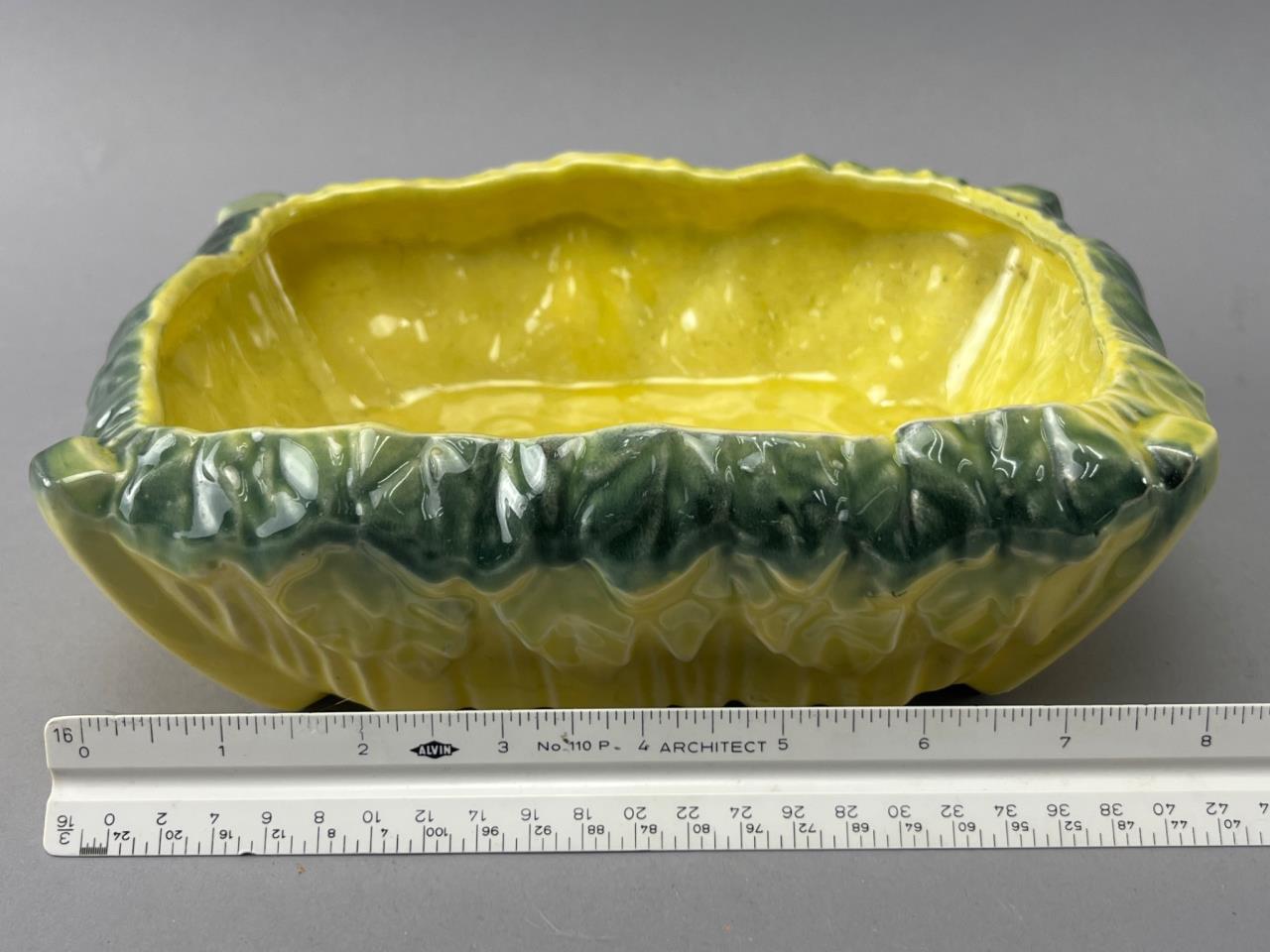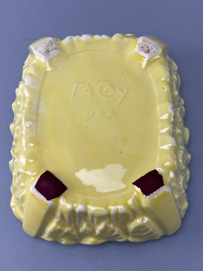 Rectangular ceramic dish by McCoy with embossed leaf-like design. Glazed in yellow with a green rim. Marked ‘McCoy USA’ on the base. Features elevated feet. Normal wear visible.