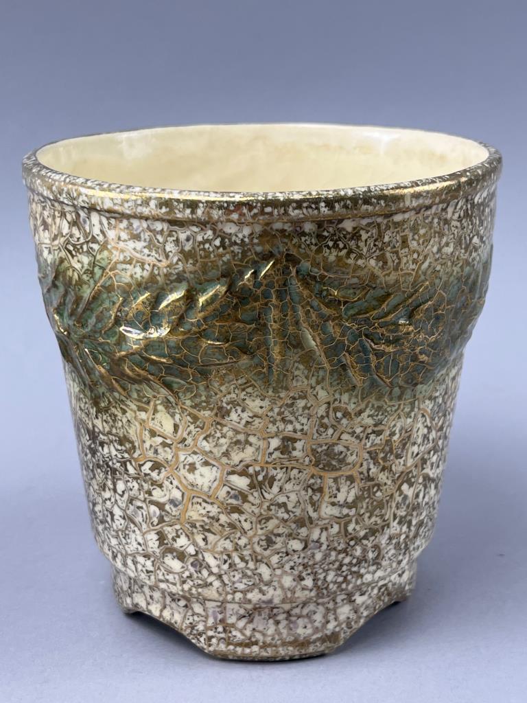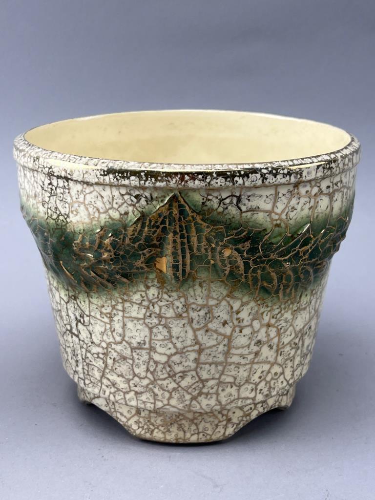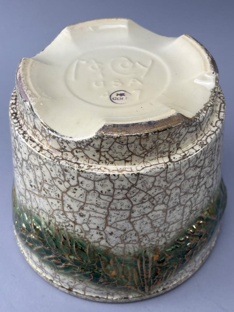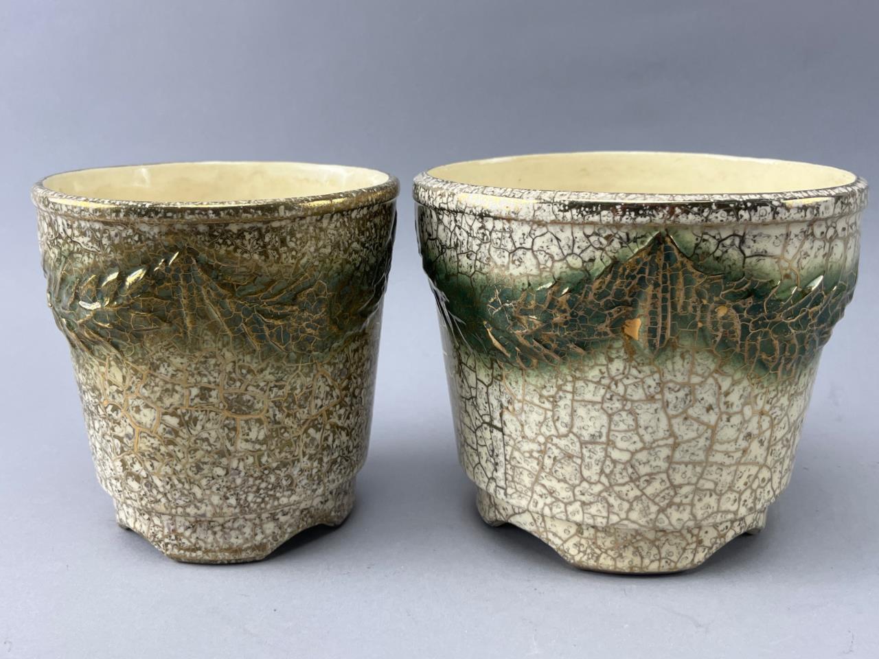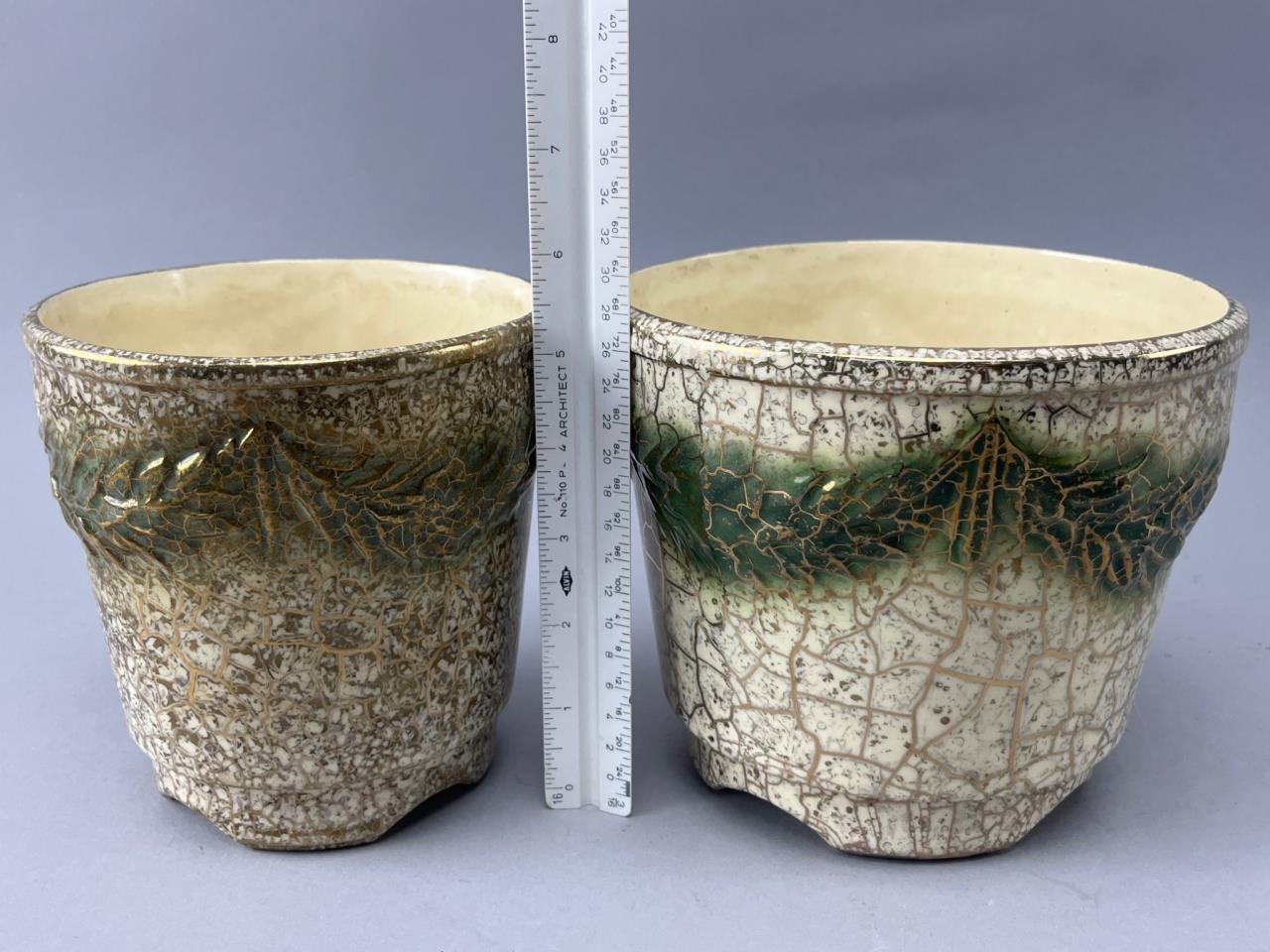 McCoy ceramic planters featuring a crackle glaze with green and 24k gold tones. Decorated with embossed foliage patterns. Bases marked ‘McCoy USA 24k Gold’. One has visible base cracking.