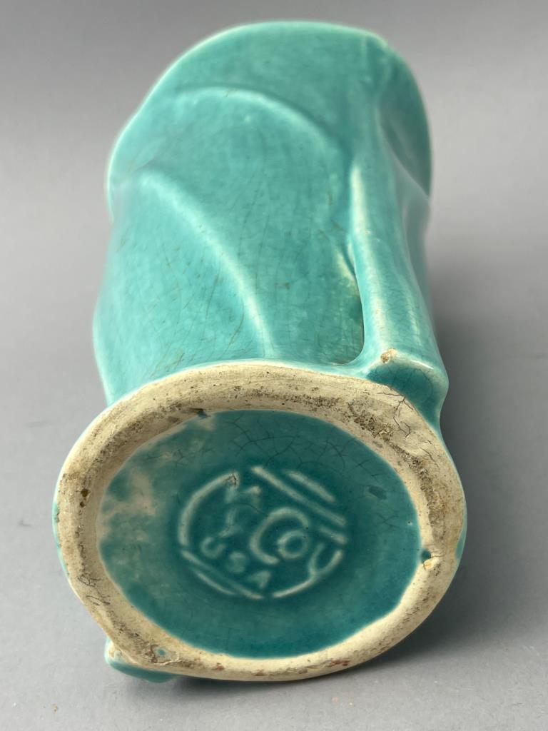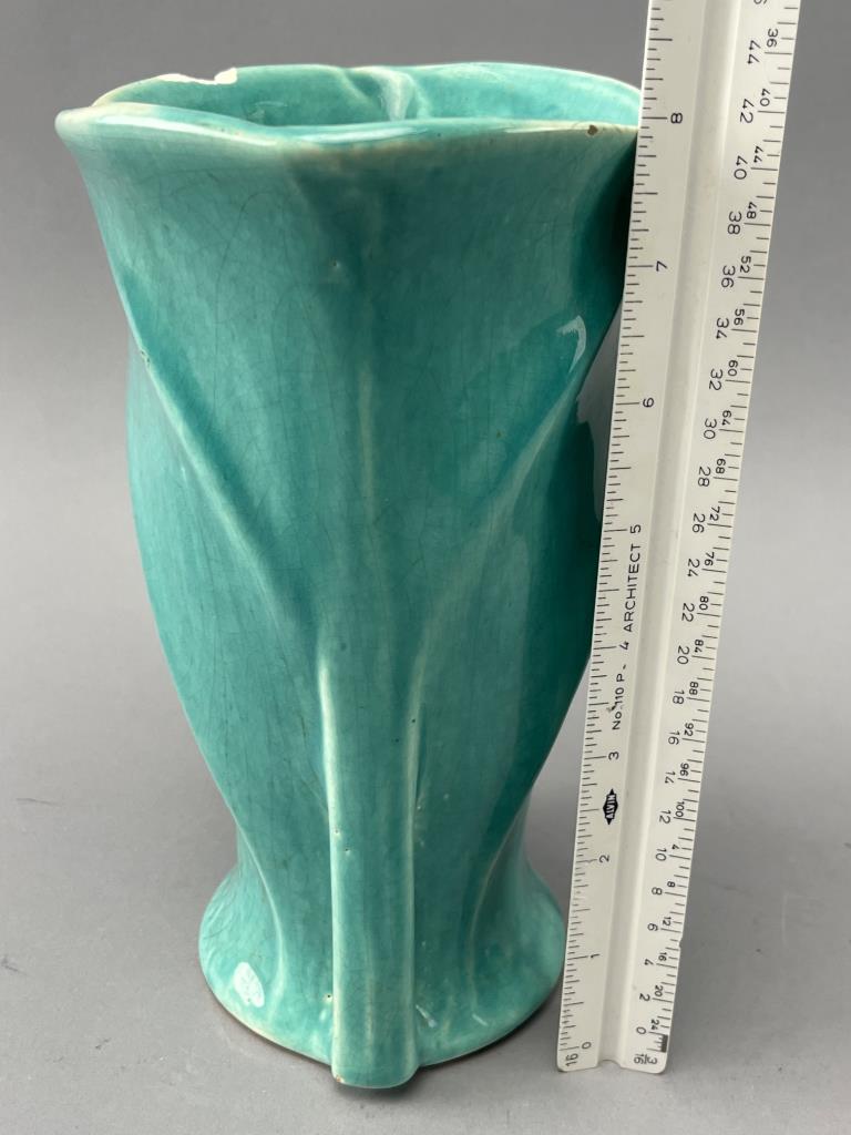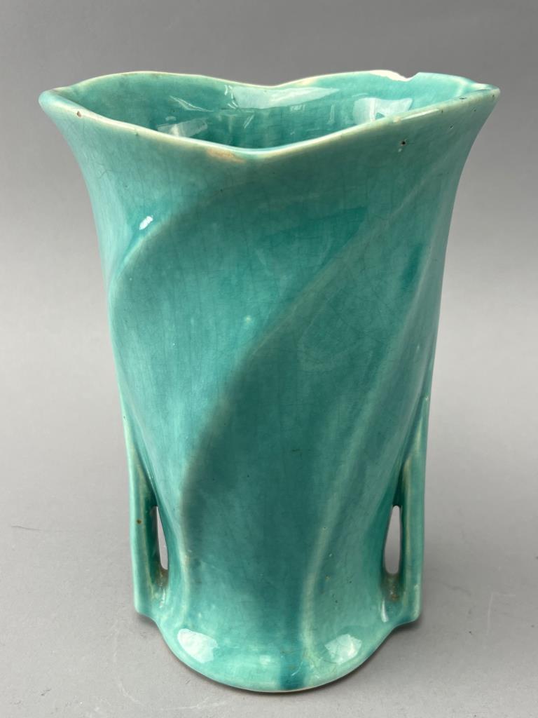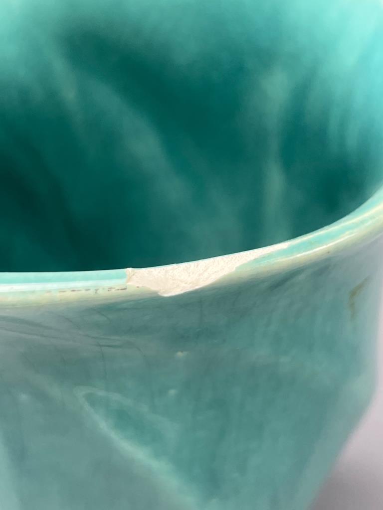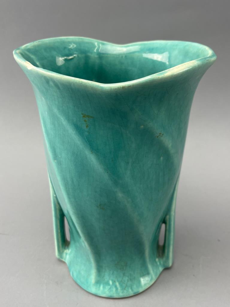 Turquoise McCoy pottery vase featuring a swirl design with openwork detailing near the base. Marked ‘McCoy’ on the underside. Notable chip on the rim.