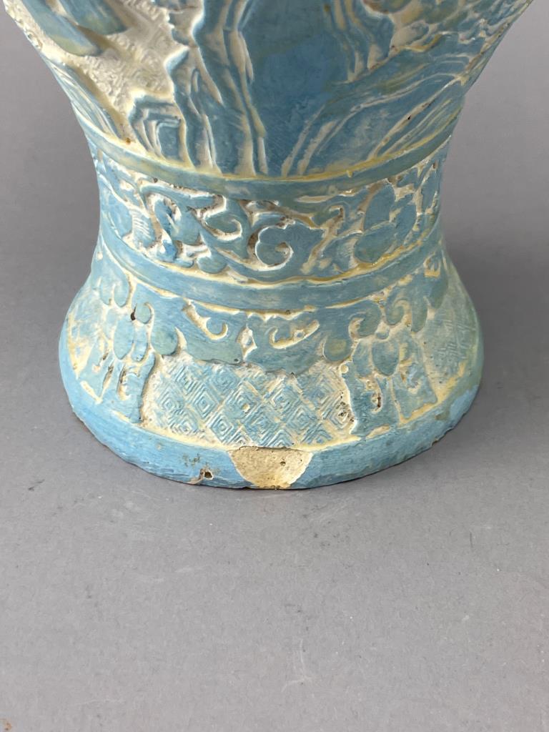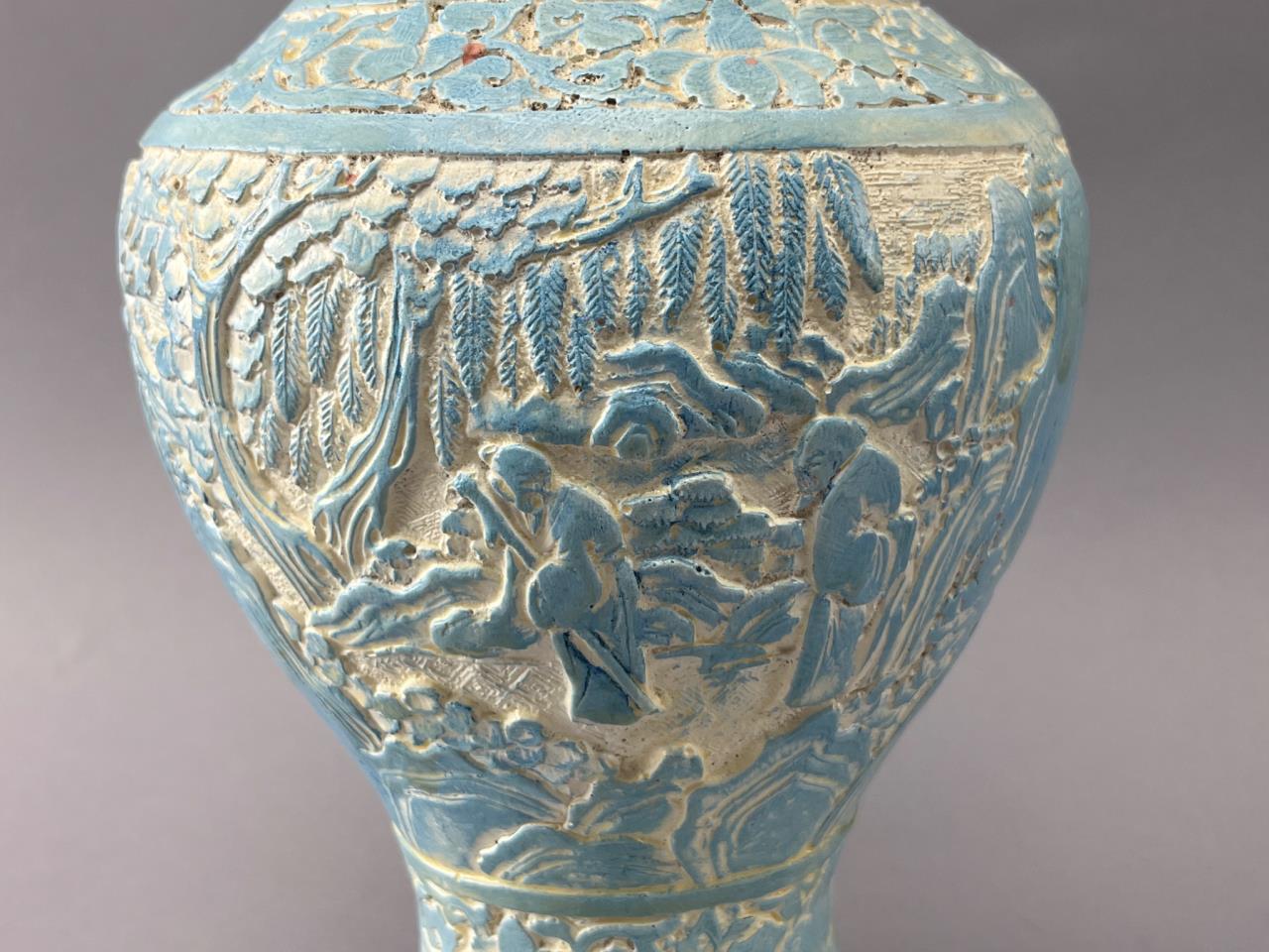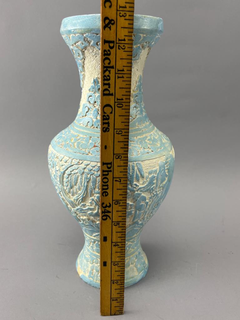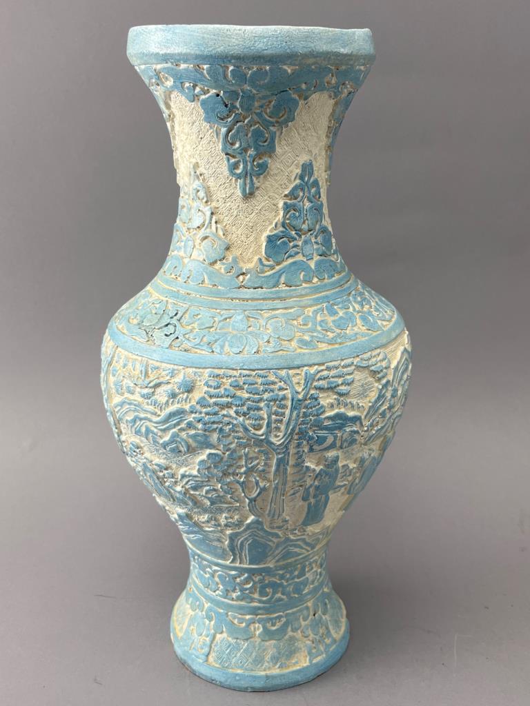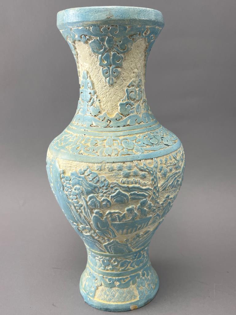 Ceramic vase featuring an incised design with blue and white glaze. Detailed motifs of trees and nature cover the body. Chips along the base rim are visible. Decorative purposes only.