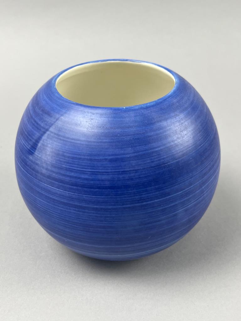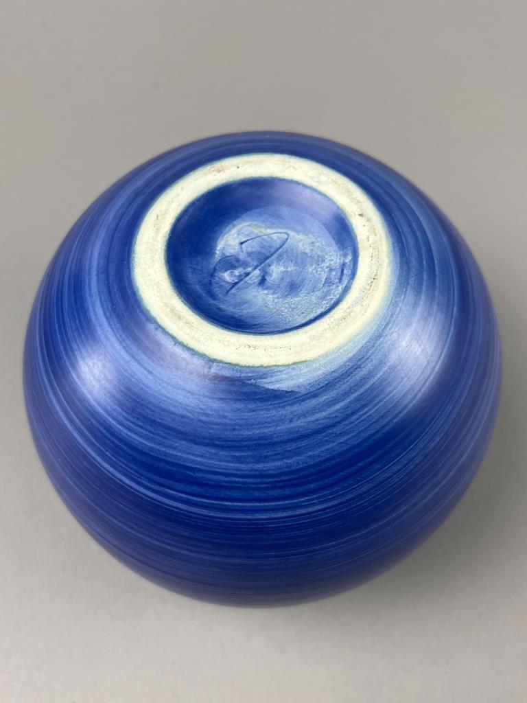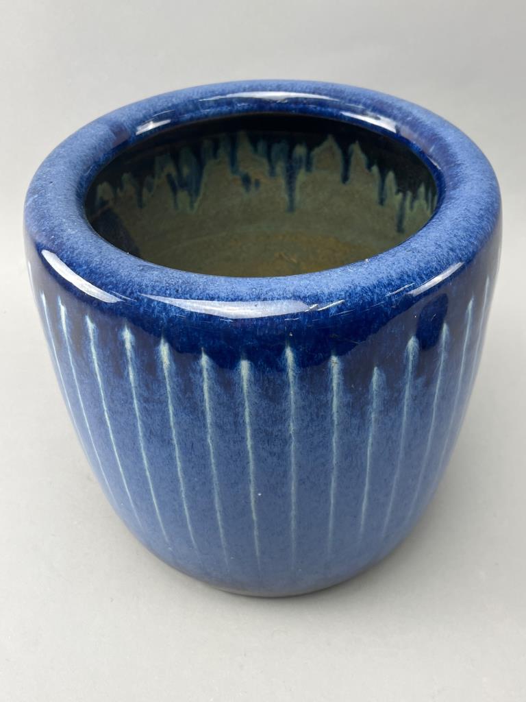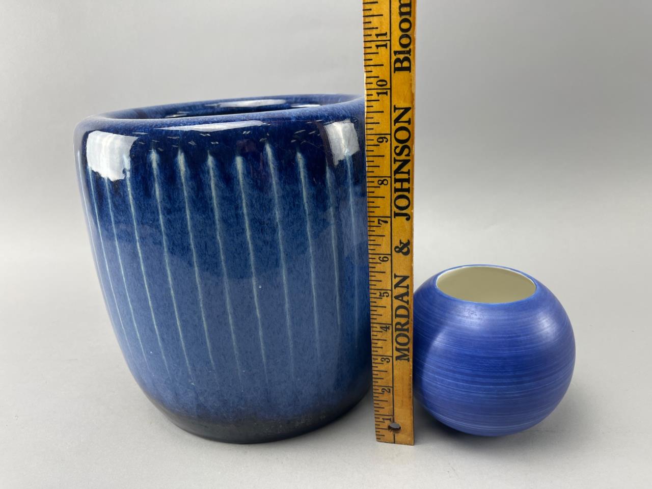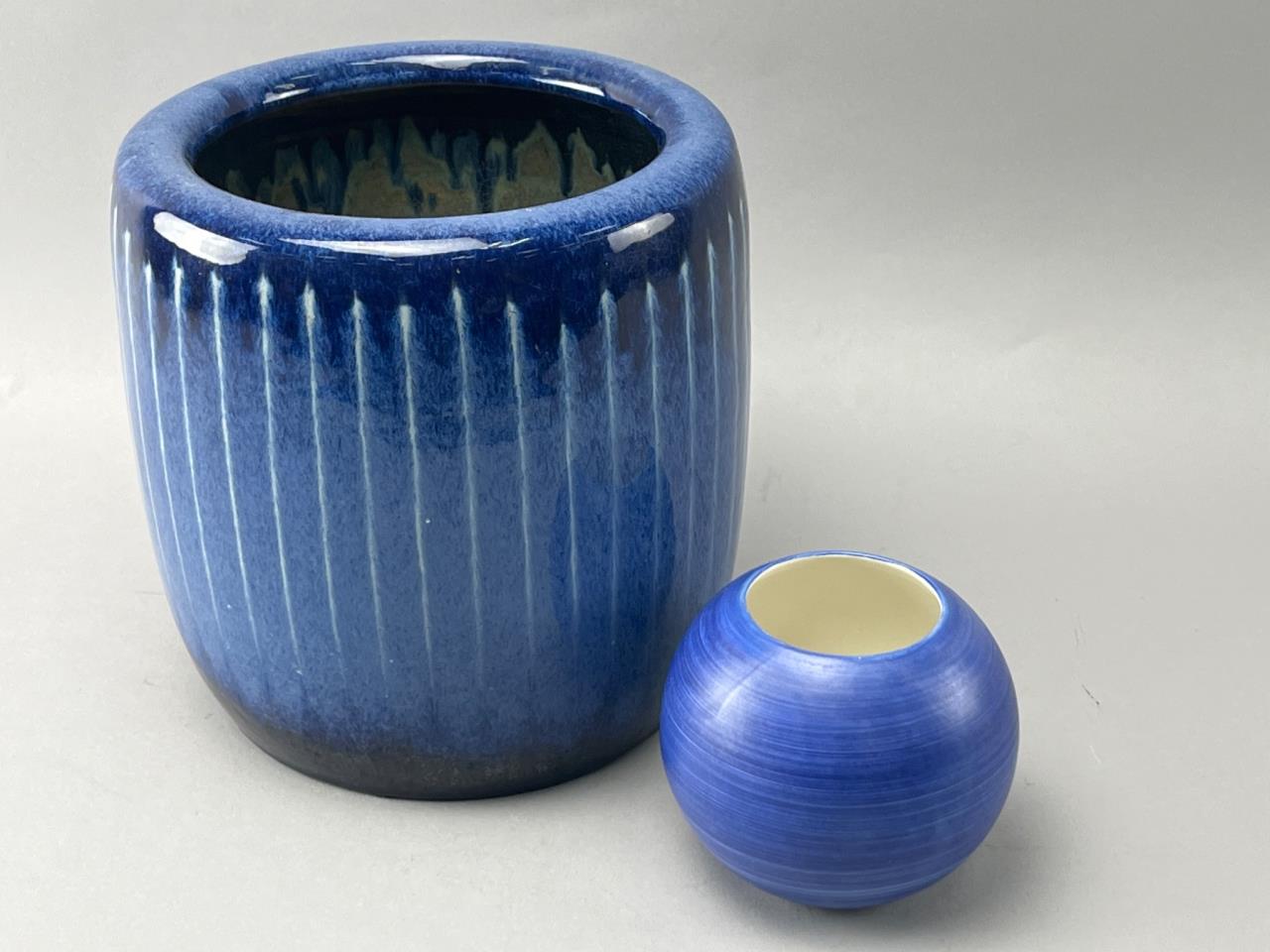 Two blue ceramic vessels, including a larger ribbed planter with a glossy glaze and a smaller spherical vase featuring a smooth striped design with an unfinished base mark.