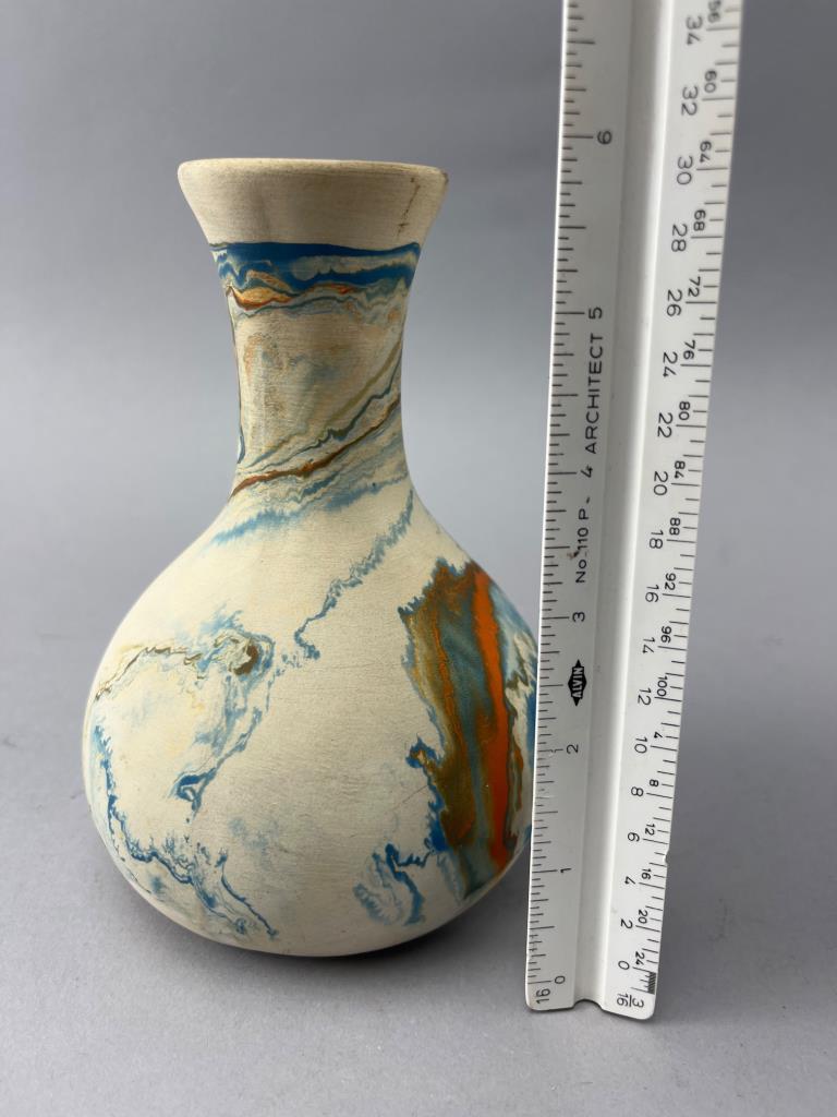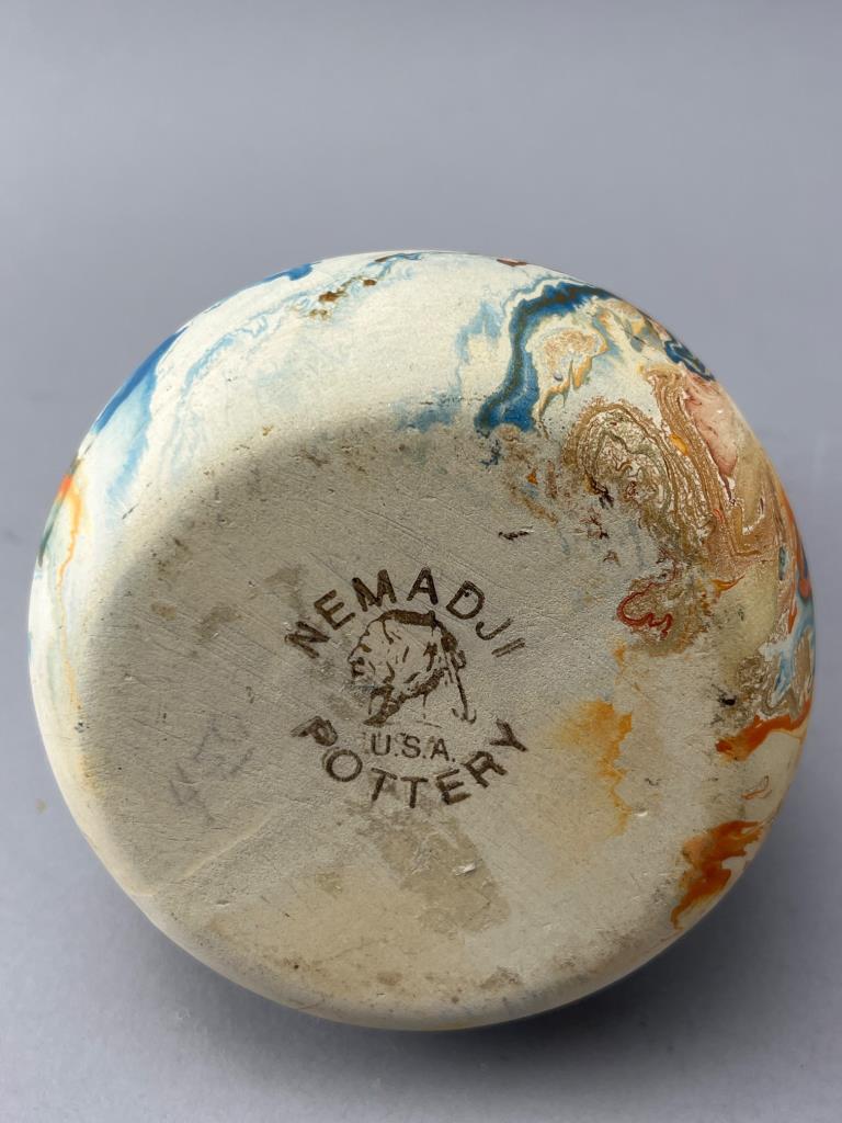Nemadji Pottery vase with marbled glaze featuring blue, orange, and cream tones. Distinctive bulbous body transitioning to a flared neck. Marked ‘Nemadji Pottery USA’ on the base.