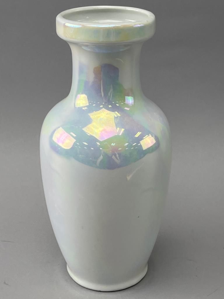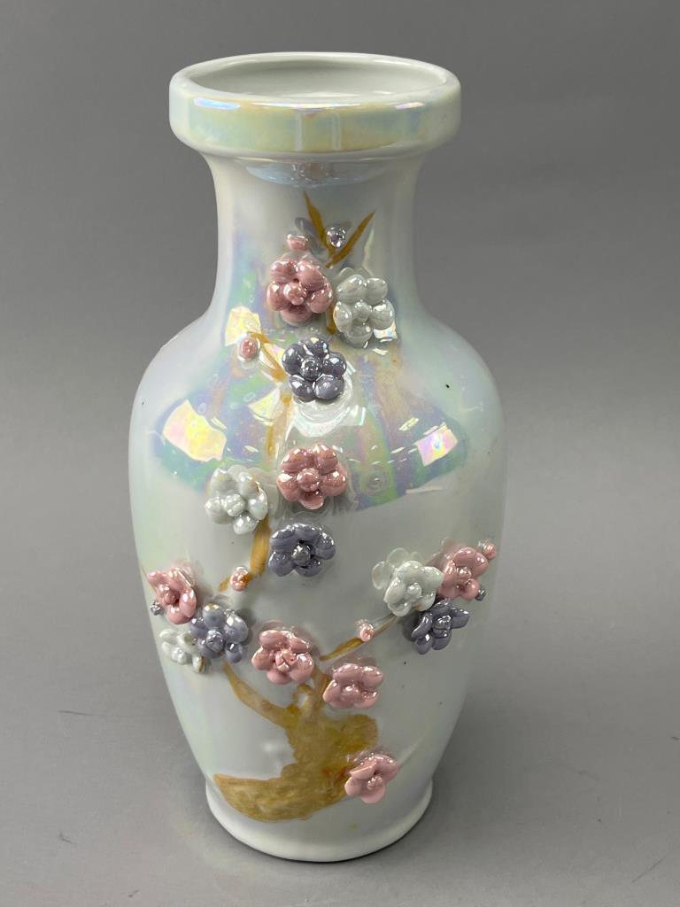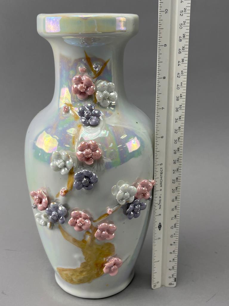 Iridescent white ceramic vase featuring raised floral details in pink, white, and purple, along with a gold-toned tree trunk design. The glossy finish adds a luminous effect. Back side is undecorated.
