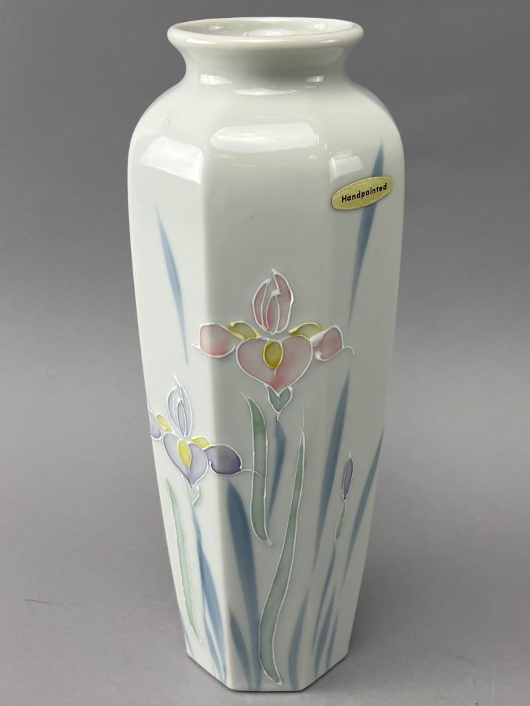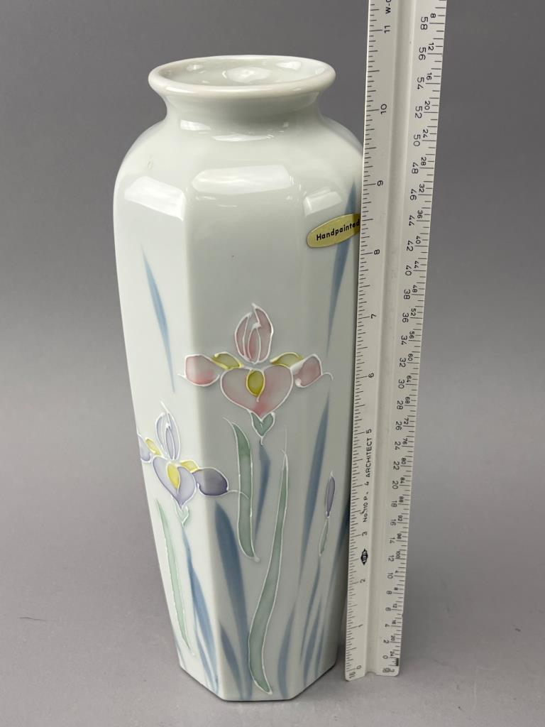 Hexagonal porcelain vase featuring pastel floral designs in relief, marked ‘Floral Lite’ and ‘Otagiri Japan’ on the underside. Includes ‘Handpainted’ sticker.