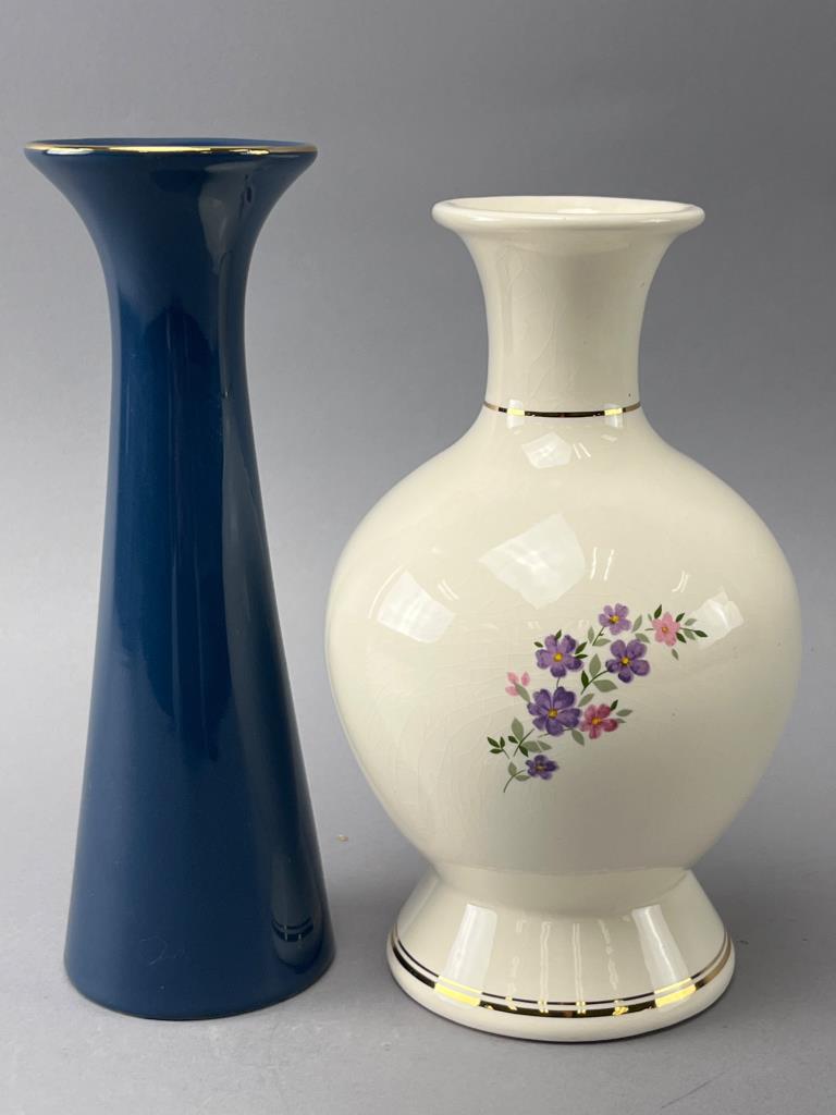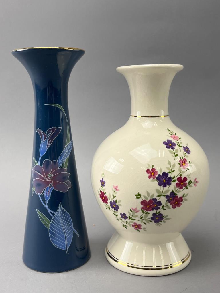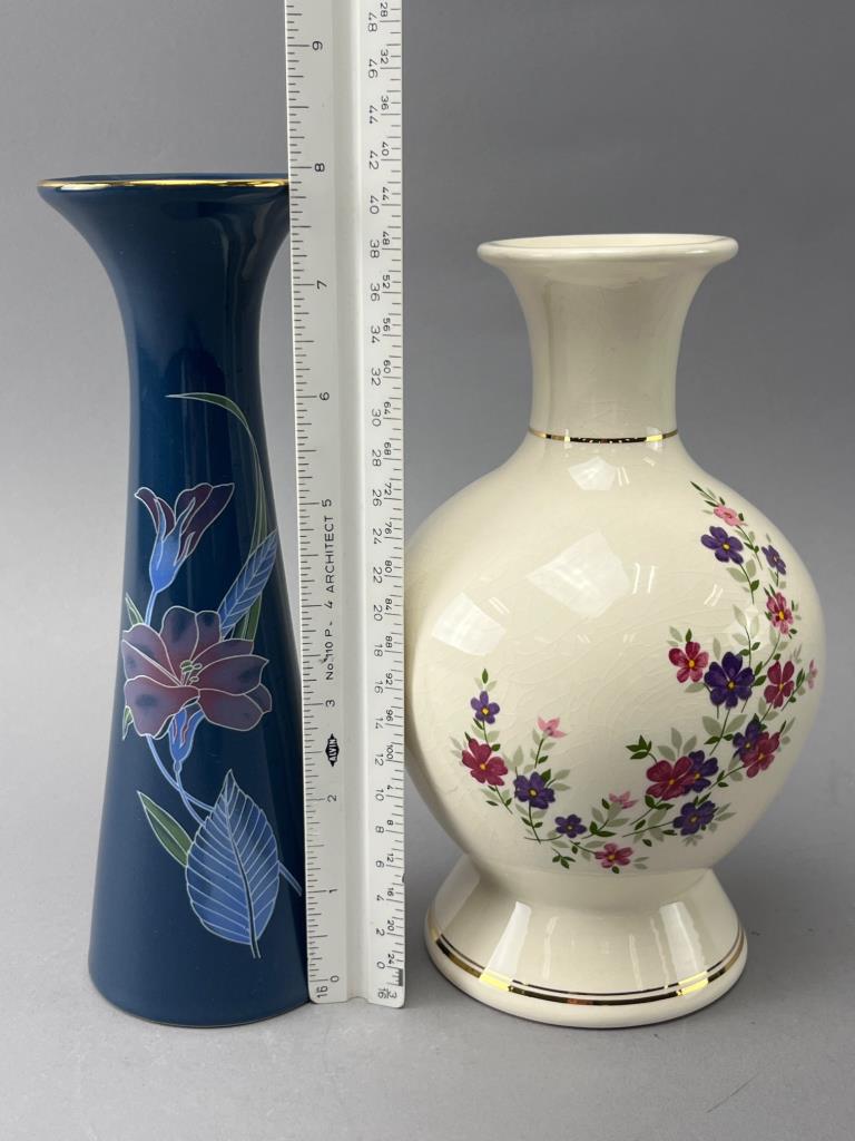 Two ceramic vases, one blue with painted floral designs, the other cream with multicolored floral patterns. Both feature gold-tone accent trim.