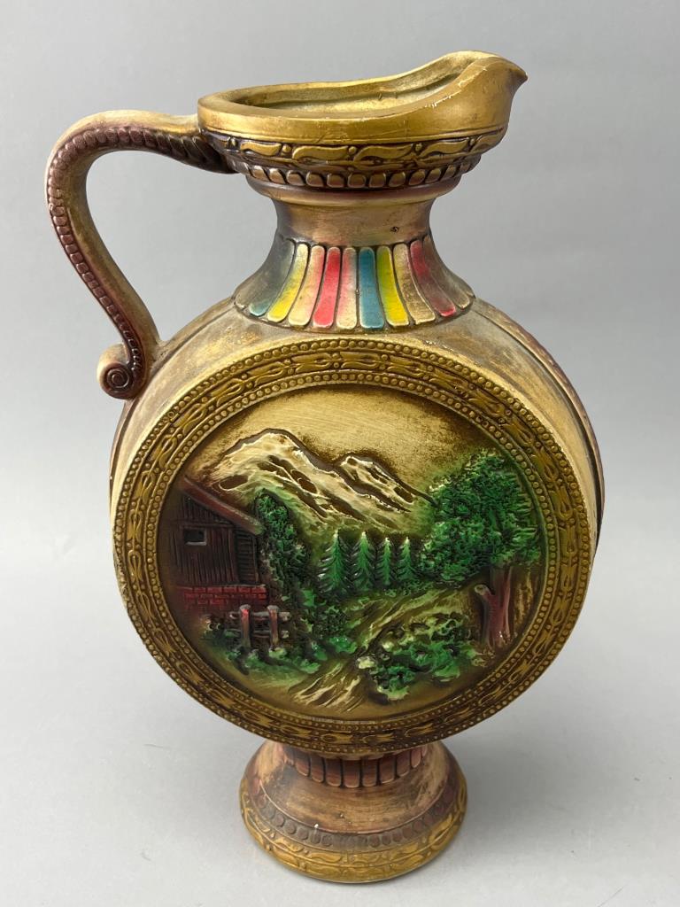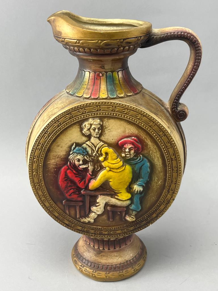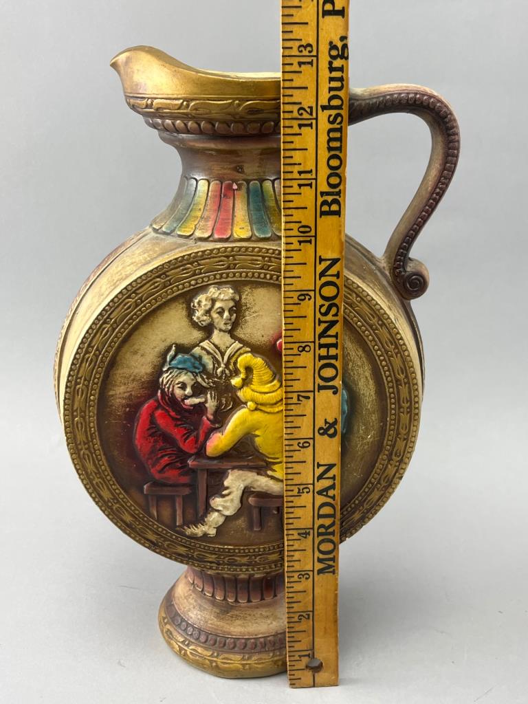 Ceramic pitcher with colorful relief decoration, featuring a tavern scene on one side and a pastoral landscape on the other. Handle is ornately shaped, and rim has a gold-tone finish.