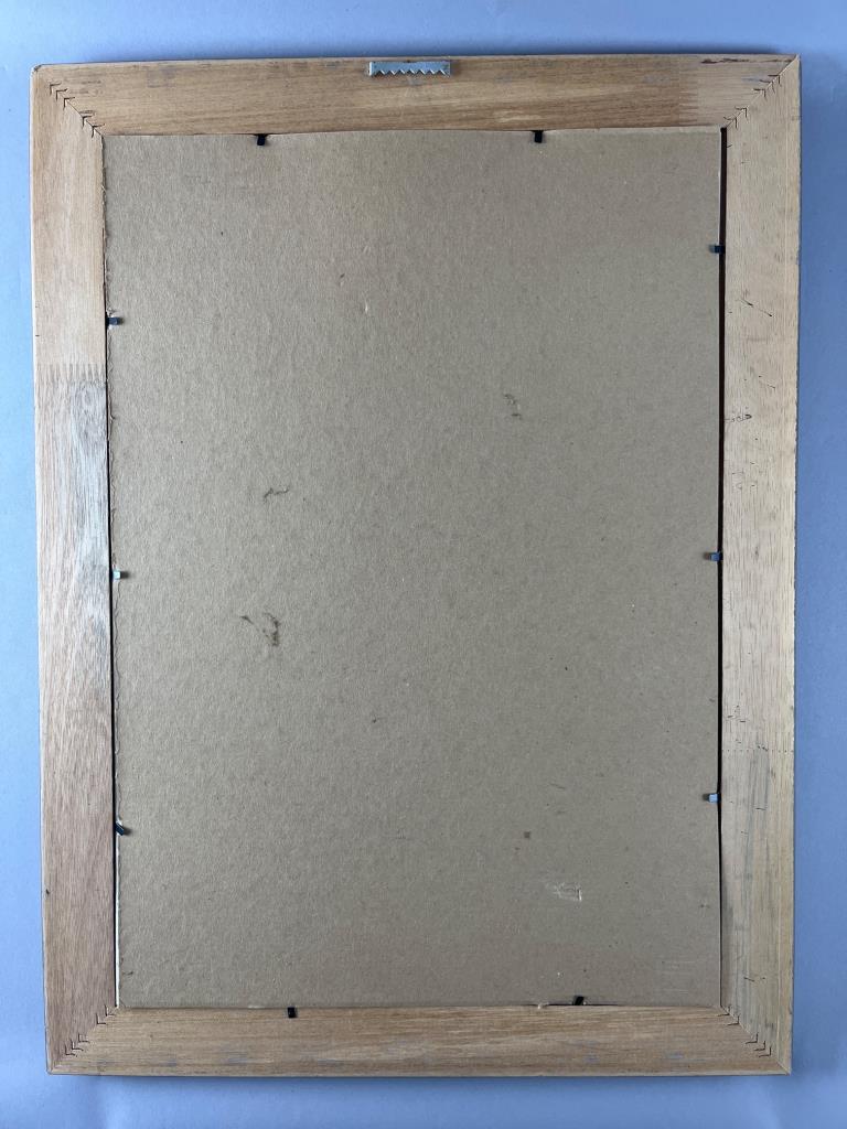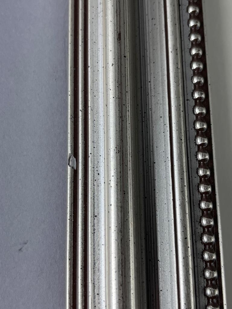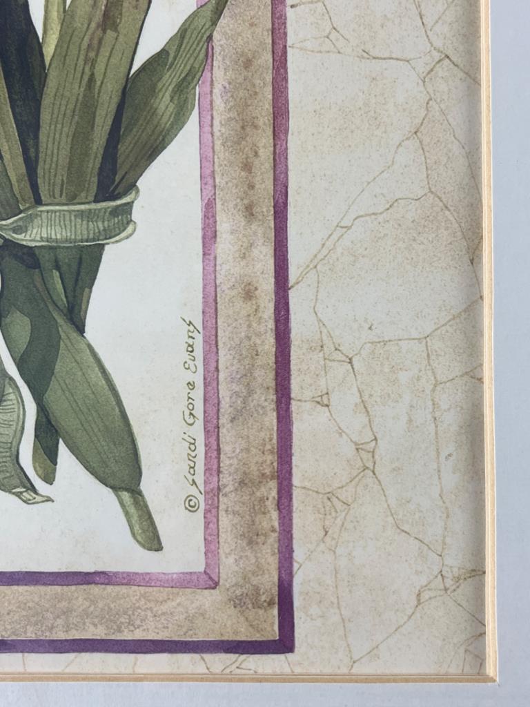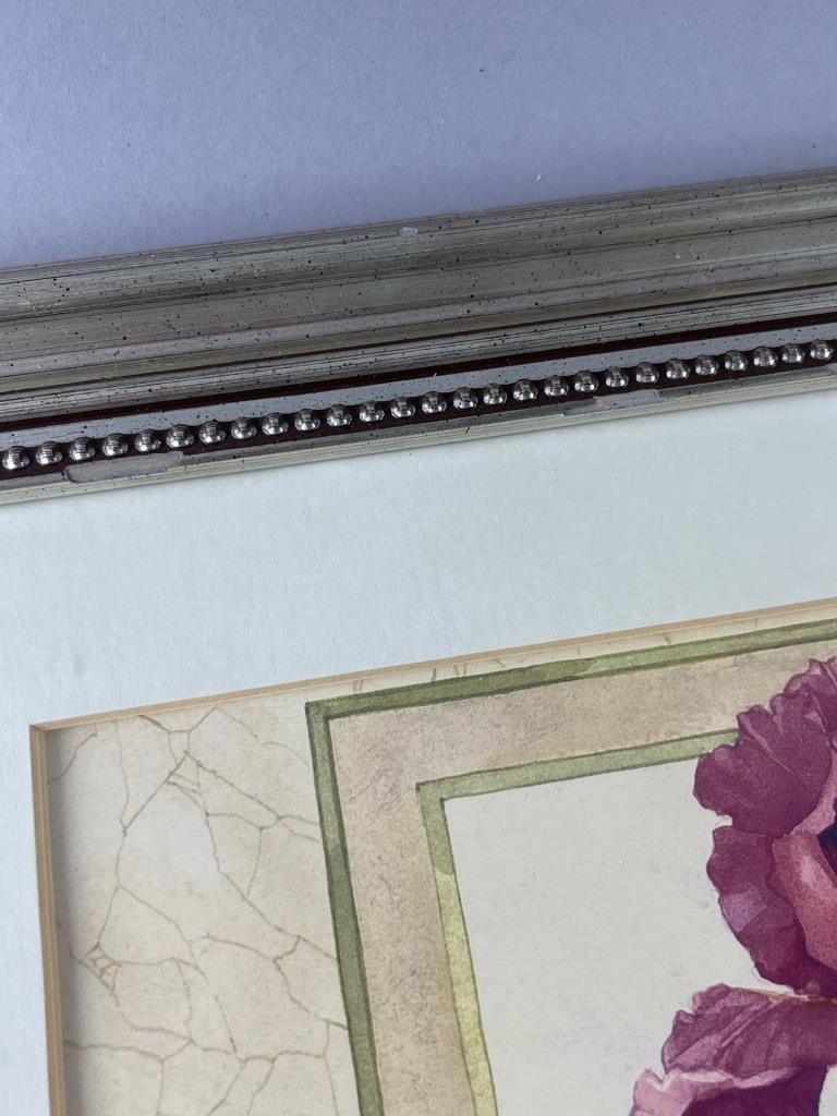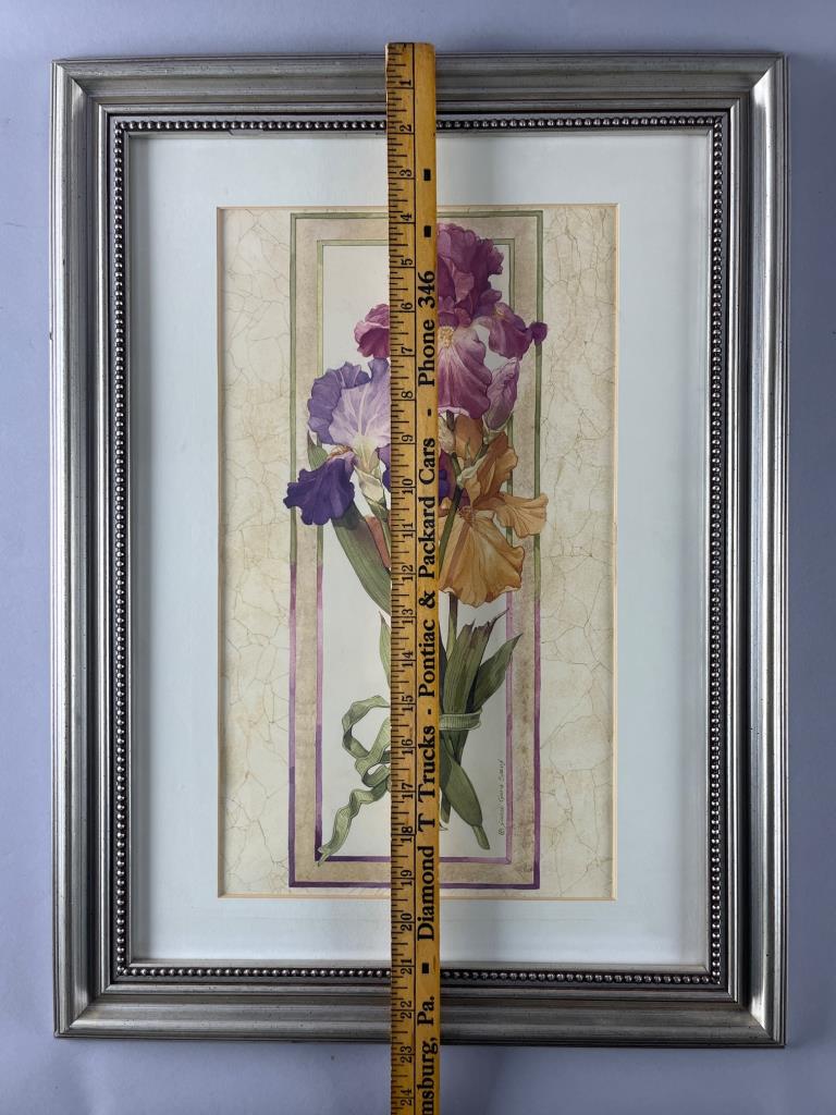 Framed print of colorful iris flowers by Lael Gorf-Evans, matted and displayed in a beaded silver-tone frame. Visible craquelure effect on the print. Frame shows minor wear and a small chip along the edge.