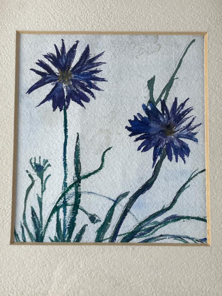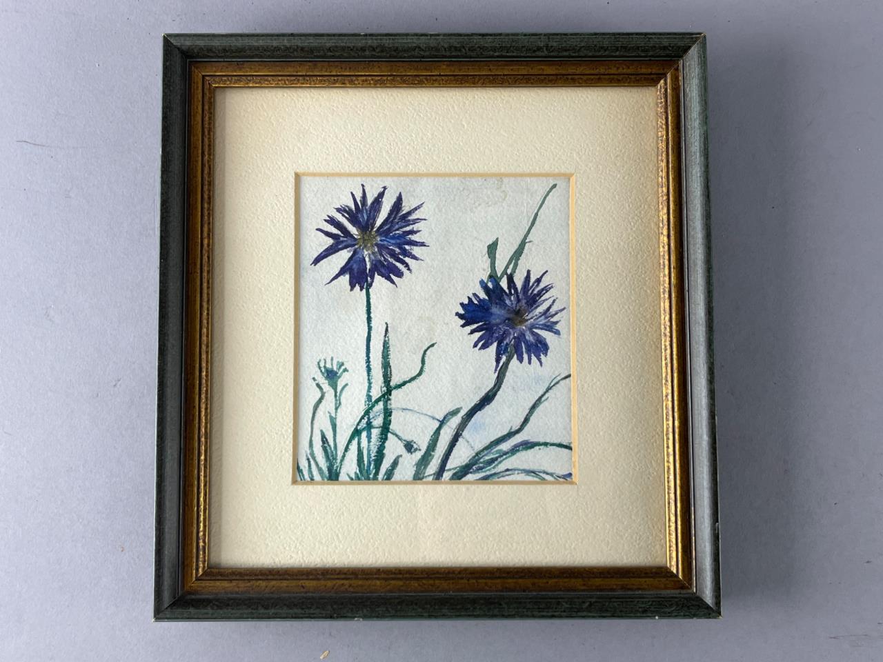 Watercolor painting of blue flowers on paper with a cream mat and a two-tone frame featuring green and gold tones. Includes hanging hardware on the back. Backing shows wear.